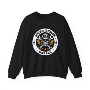 Speed Demon Garage Crewneck Sweatshirt — Skull, Wrench & Lightning Motorcycle Shop Pullover