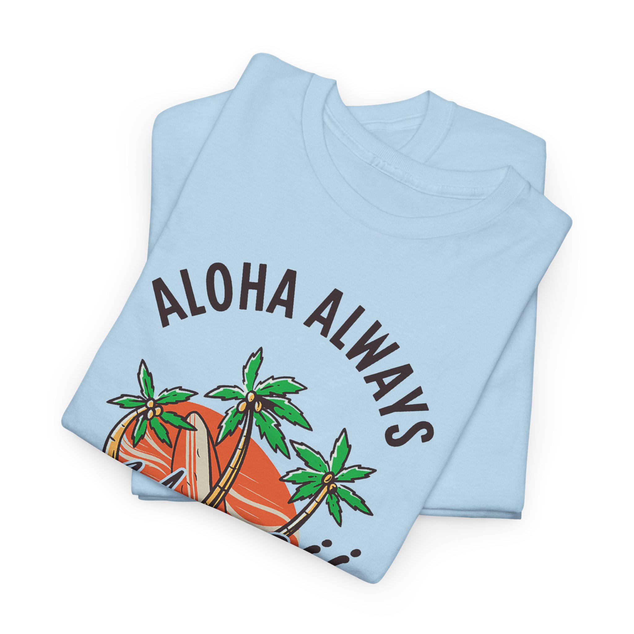 Light blue and laid-back — this classic cotton tee carries a gentle island hum. A sun-drenched orange sunset, lean palm silhouettes and the hand-lettered Aloha Always headline a relaxed surf-and-sand vibe. The shirt sits with a roomy, classic fit and a crew neckline that keeps the look timeless while the soft, medium-weight cotton wears well from morning coffee to evening bonfires. Subtle vintage distressing in the print and a muted color palette give it an easy-worn feel that pairs effortlessly with boardshorts, denim or a light cardigan for cooler nights. Wear it on slow weekends, beach runs, or when you want a touch of island calm in your day.