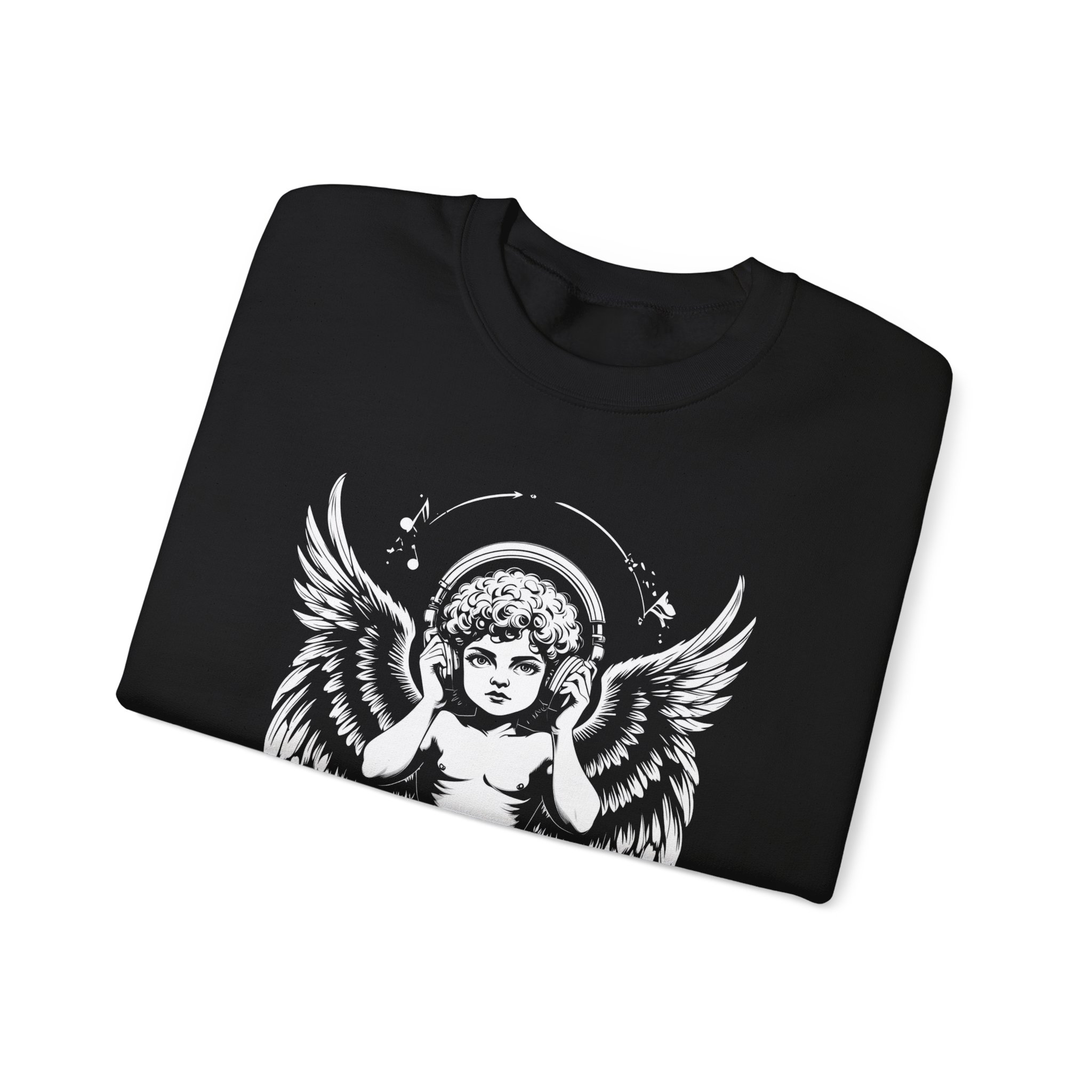 This soft, medium-weight crewneck brings a touch of vintage romance and streetwise edge to everyday wear. A monochrome angelic figure with heart-shaped sunglasses and delicate wings is printed on a smooth black ground, creating a look that reads equal parts retro pinup and modern graphic art. The classic crew silhouette and breathable 50/50 cotton-poly blend make it an easy go-to layer for cool evenings, while thoughtful construction—tubular knit body, ribbed collar, and reinforced double-needle stitching—keeps the fit neat and long-lasting. Wear it over a tee for weekend wanderings or throw it on after a late-night show; the design feels like…