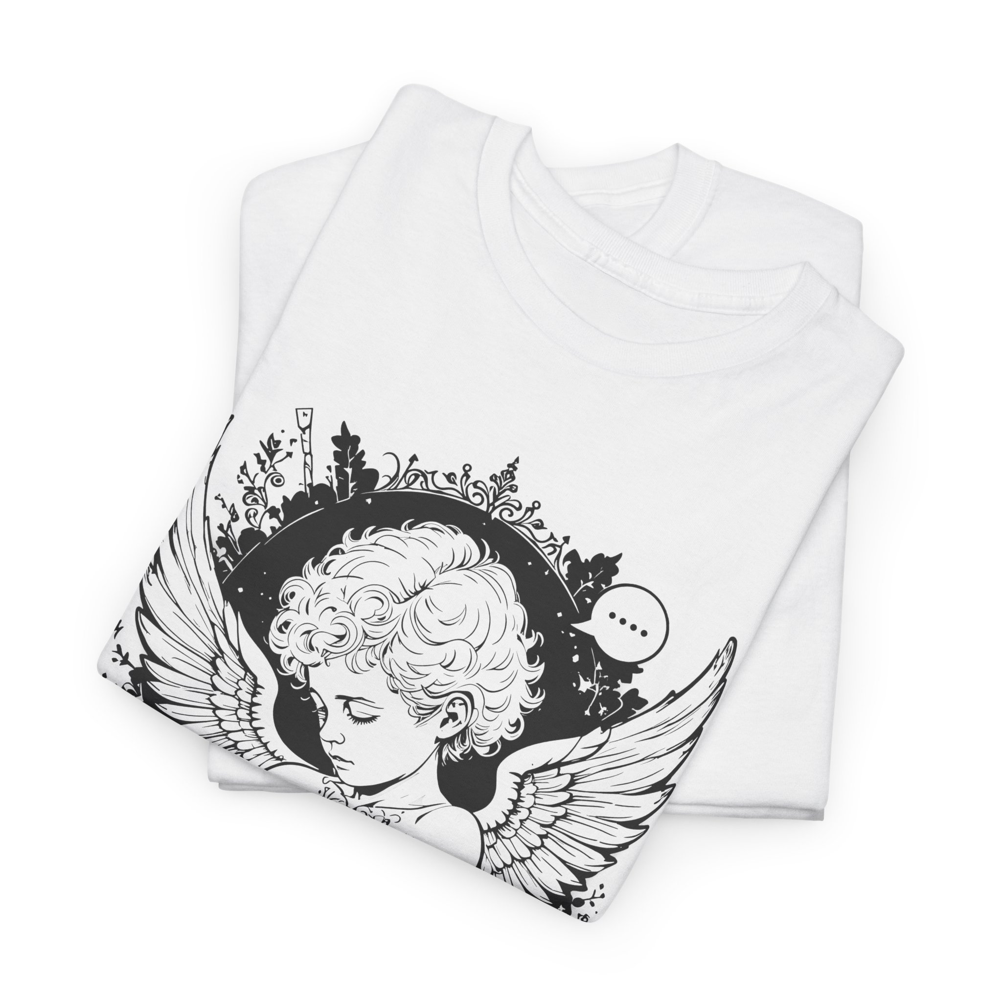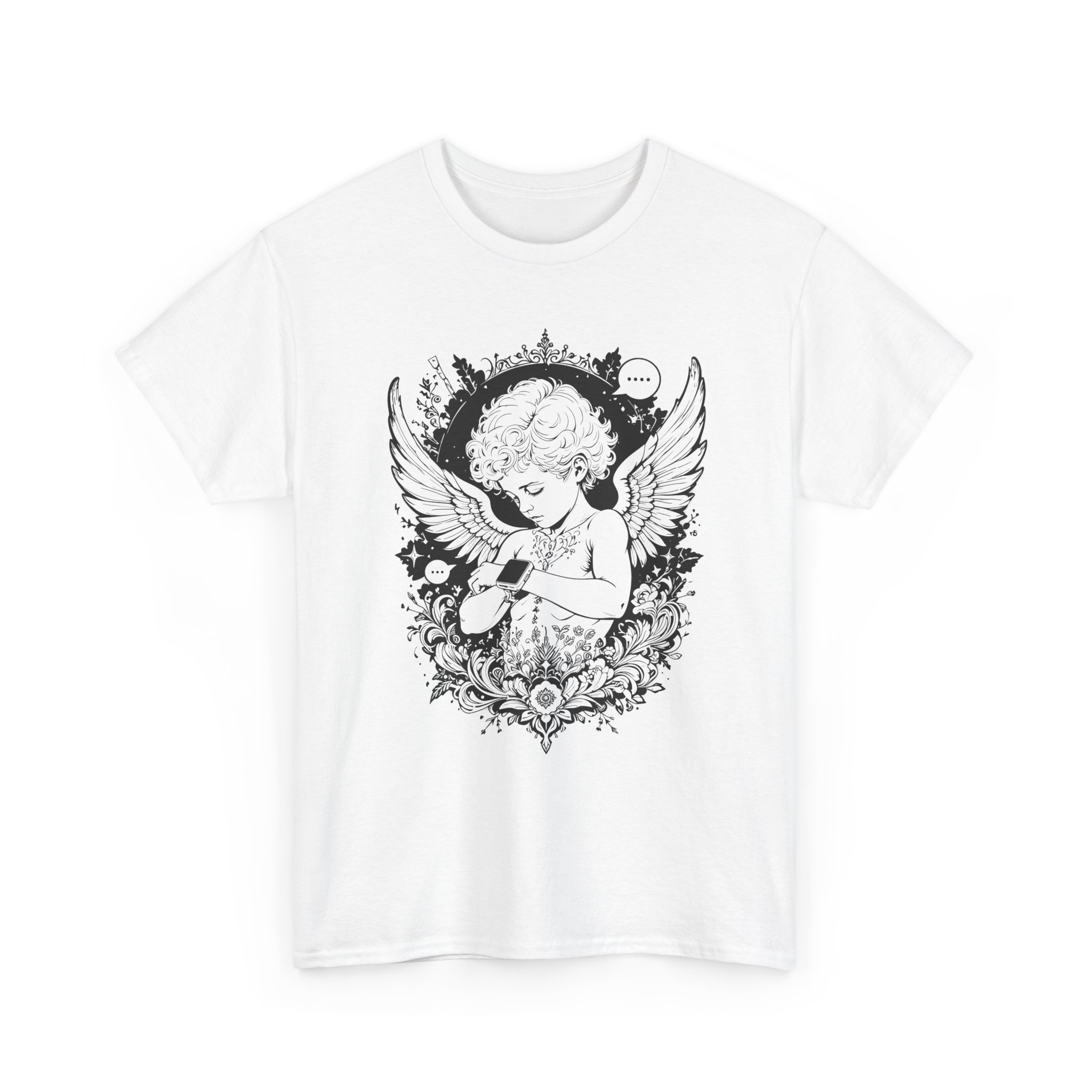 This tee carries a quiet, contemplative energy — a soft white canvas with a finely detailed black illustration of a cherubic angel cradling a small object amid floral filigree. It feels like a sketch pulled from an old altar book: delicate linework, subtle shading and a haloed silhouette that sits centered on the chest. Wear it layered under a worn denim jacket or alone on slower days; it brings an understated, vintage-inspired mood to wardrobes that favor artful storytelling over loud logos. The medium-weight, classic-cut shirt holds the print with clarity while feeling lived-in and comfortable after every wash.