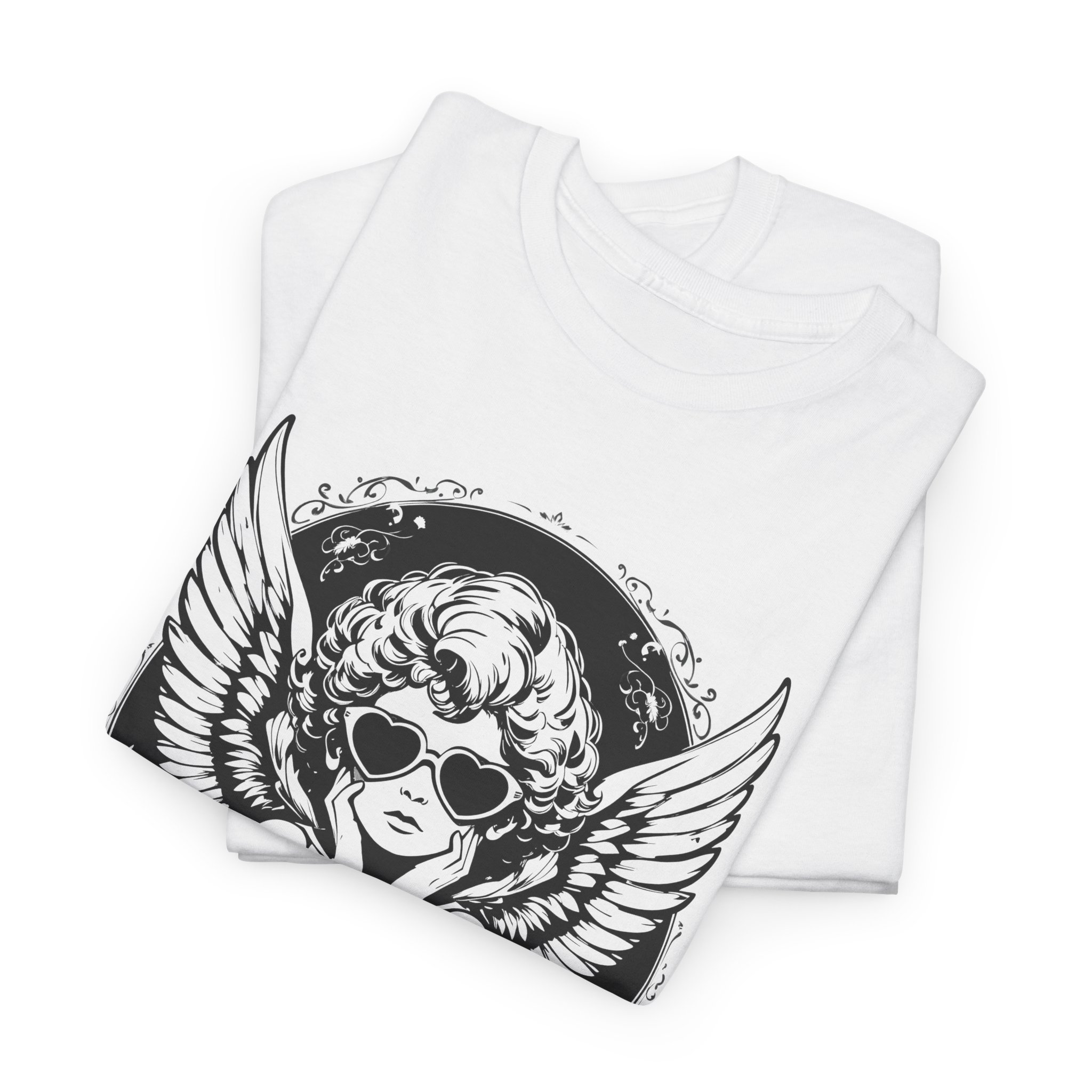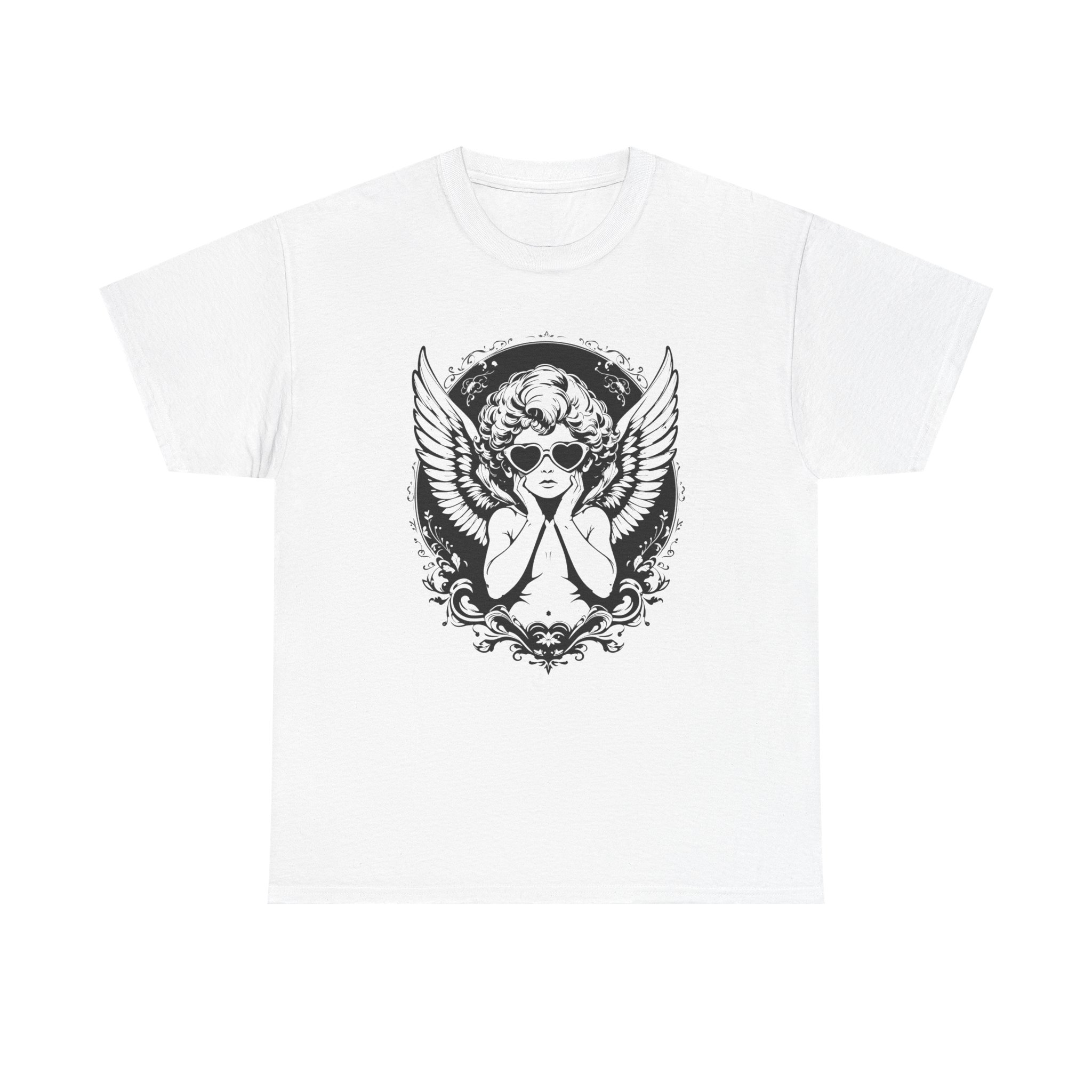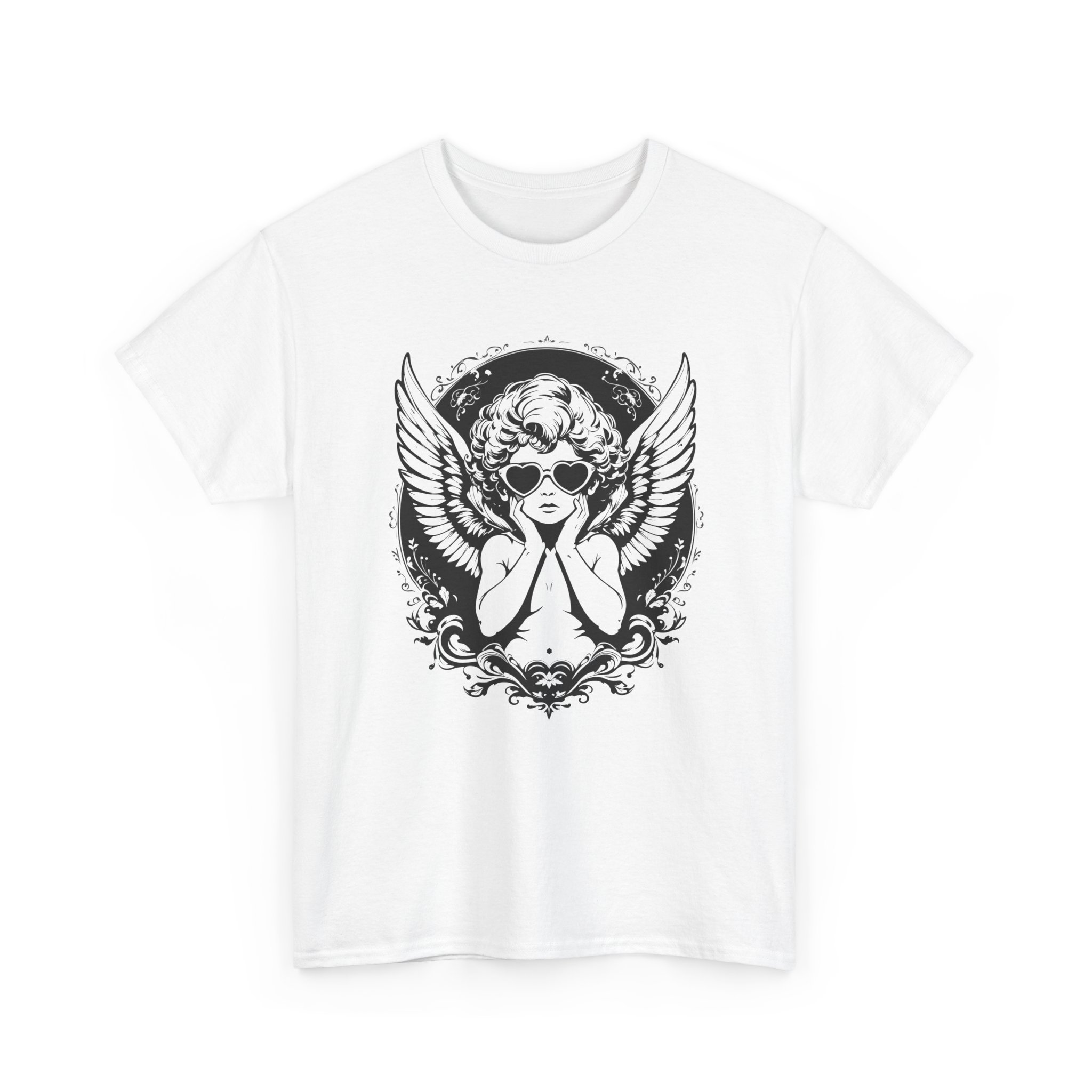 Soft, vintage-inspired tee with a bold black-and-white cherub illustration that feels equal parts playful and rebellious. The angel motif—sunglasses, folded hands, and feathered wings—creates a nostalgic, rockabilly vibe that works as a wearable statement. Comfortable and breathable 100% cotton (solid colors), the shirt wears in nicely and keeps its shape thanks to ribbed knit collar and shoulder tape. It sits relaxed at the shoulders with a classic crew neckline, making it easy to layer under jackets or wear on its own for everyday street-ready looks.