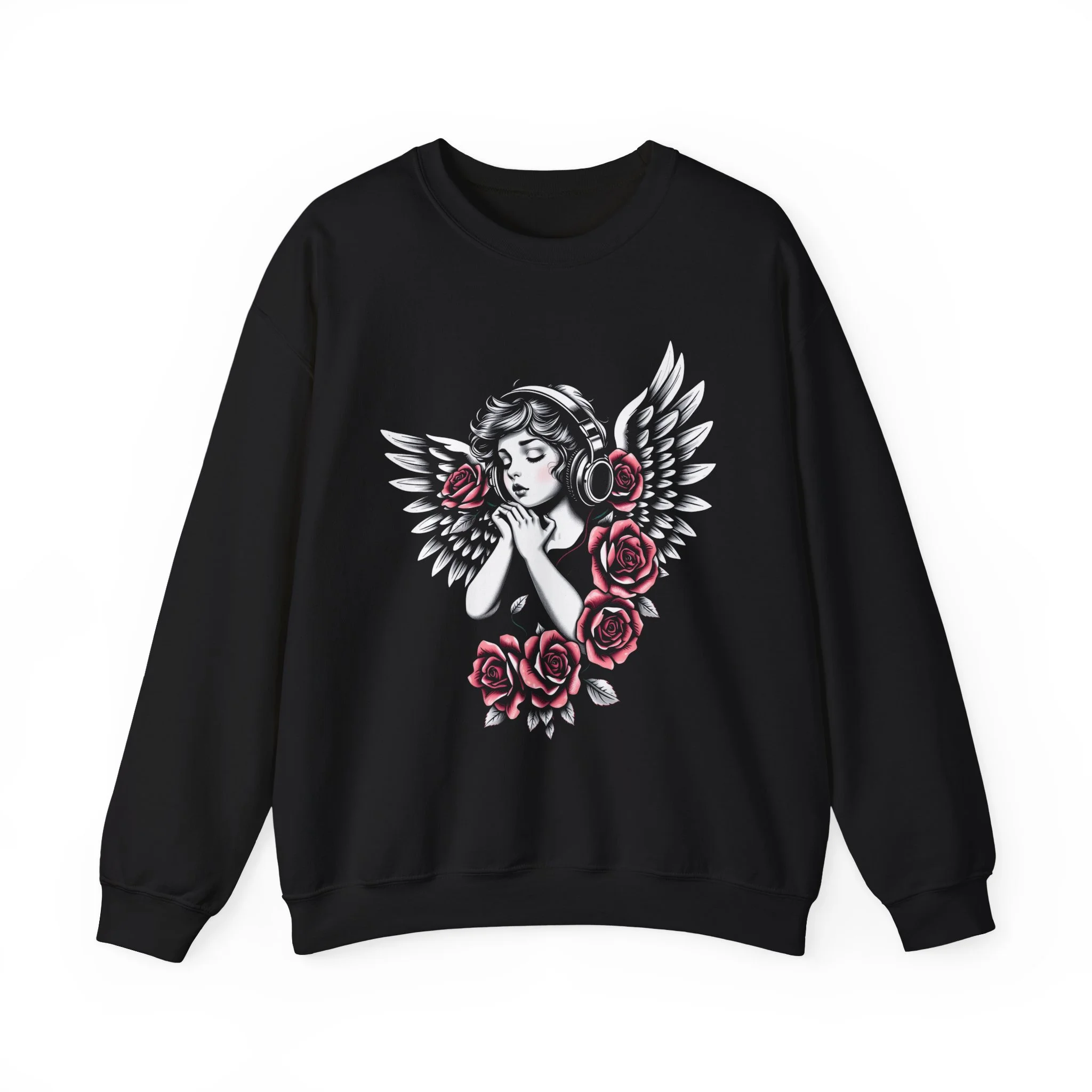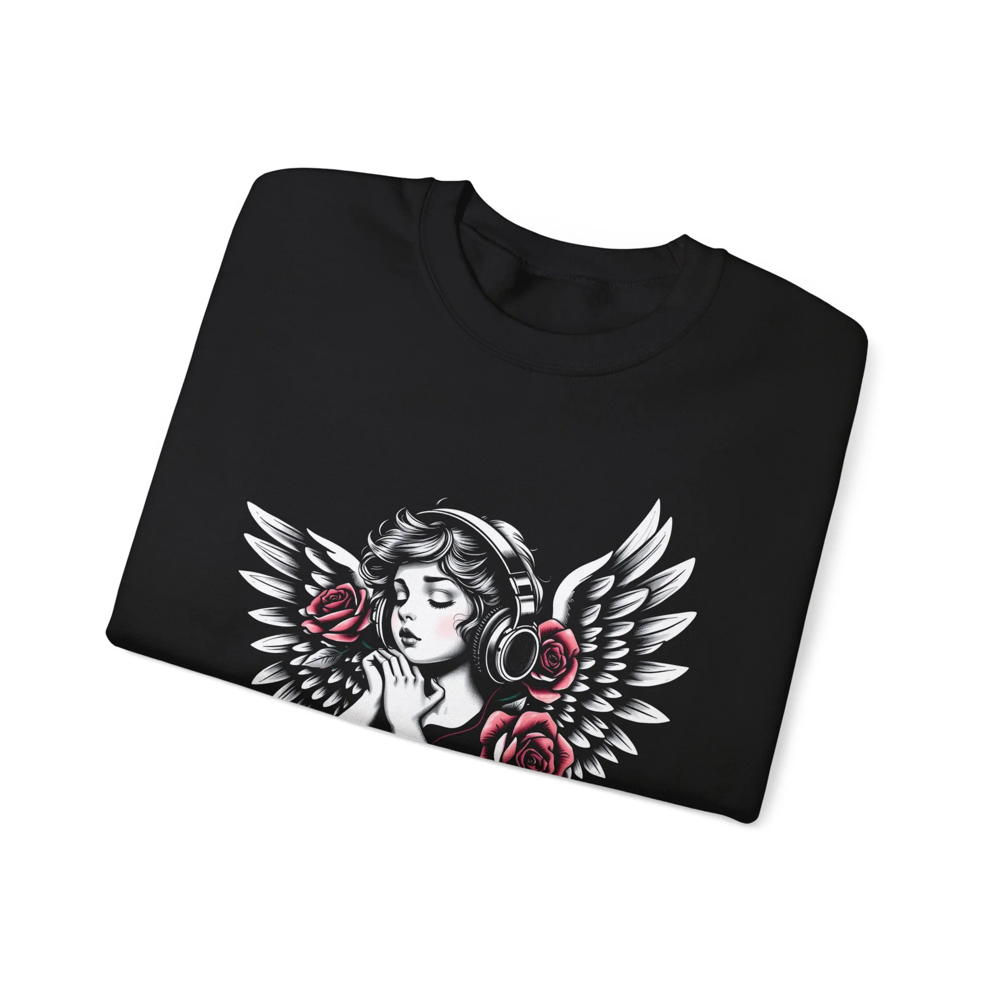 A soft, roomy crewneck that carries a quiet, nostalgic edge. The design centers on a vintage-style angel with headphones, framed by delicate wings and a ring of deep rose blooms — an image that feels like a private soundtrack and a midnight vigil at once. Wear it on slow mornings, late-night drives, or when you want to fold into something warm and thoughtfully styled. The medium-heavy cotton-poly blend offers structure without stiffness; ribbed collar and cuffs keep the shape while the tubular knit reduces seams for a clean silhouette. Ethical cotton sourcing and OEKO-TEX certified dyes mean the sweatshirt looks and feels conscientious as well as cozy. Available with subtle embroidery or DTF inner labels for a curated, boutique finish.