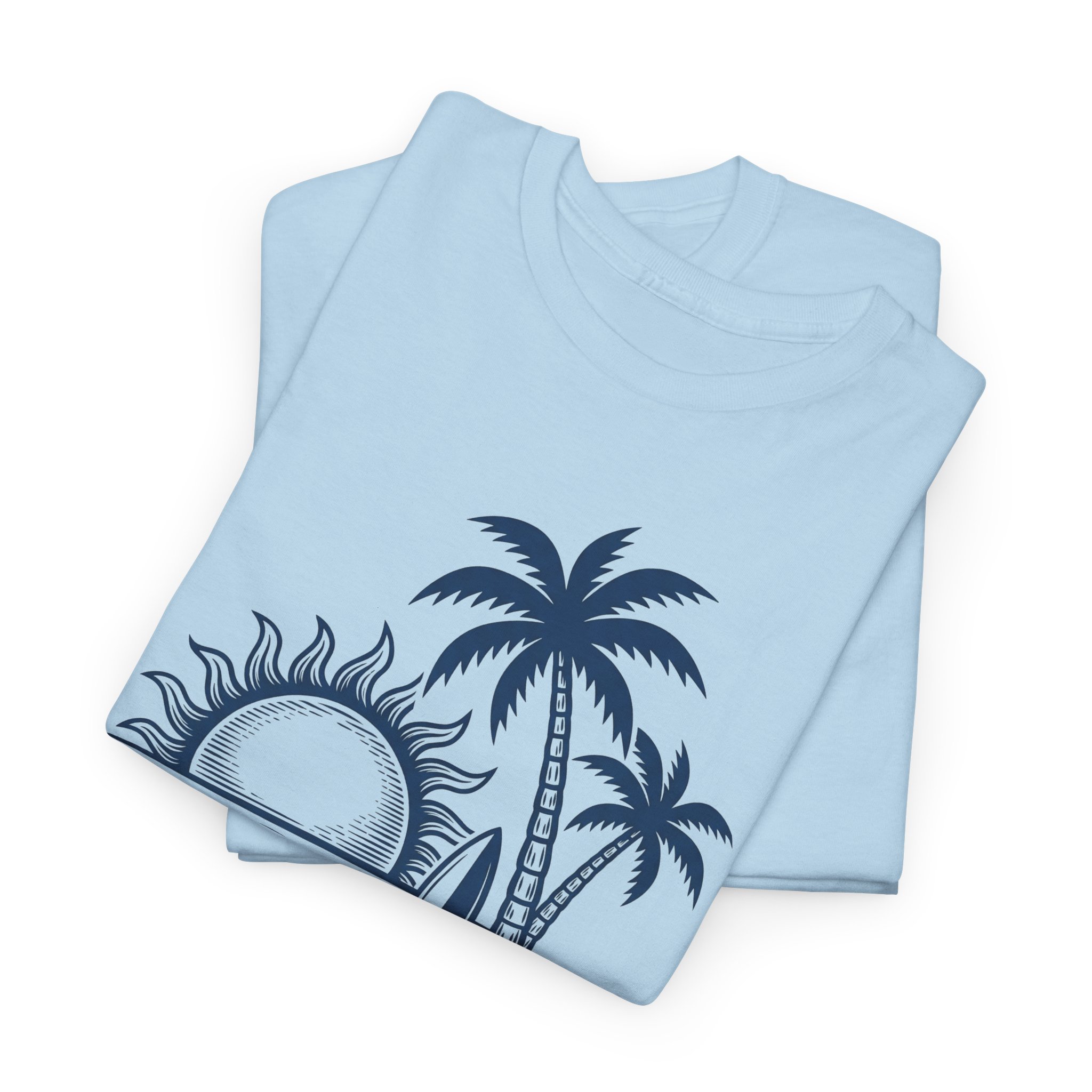 A soft, breathable tee that carries a slow-rolling tide with it. This classic crew shirt features a hand-drawn seaside scene — sun dipping toward the horizon, palm silhouettes, and surfboards standing ready — printed in crisp ink that keeps its detail wash after wash. Wear it on sand between your toes, folded into a picnic at golden hour, or layered under an open shirt for weekend drives to the coast. The relaxed cut and tear-away label keep you comfortable all day; the sturdy knit and reinforced shoulders mean this one becomes a favorite, not a fling.
