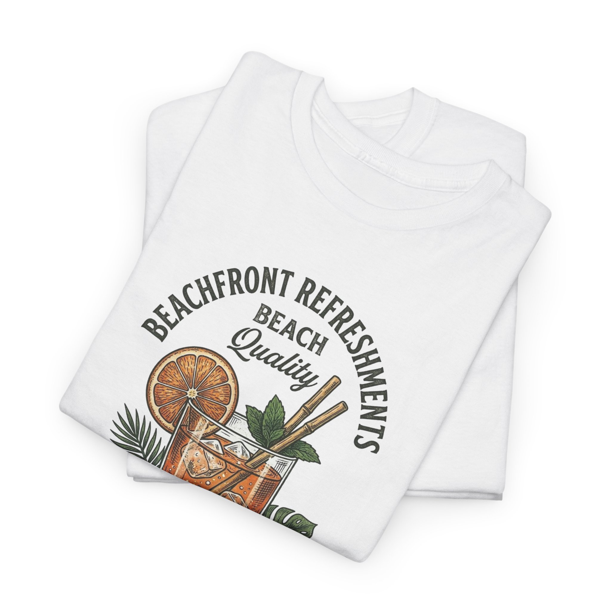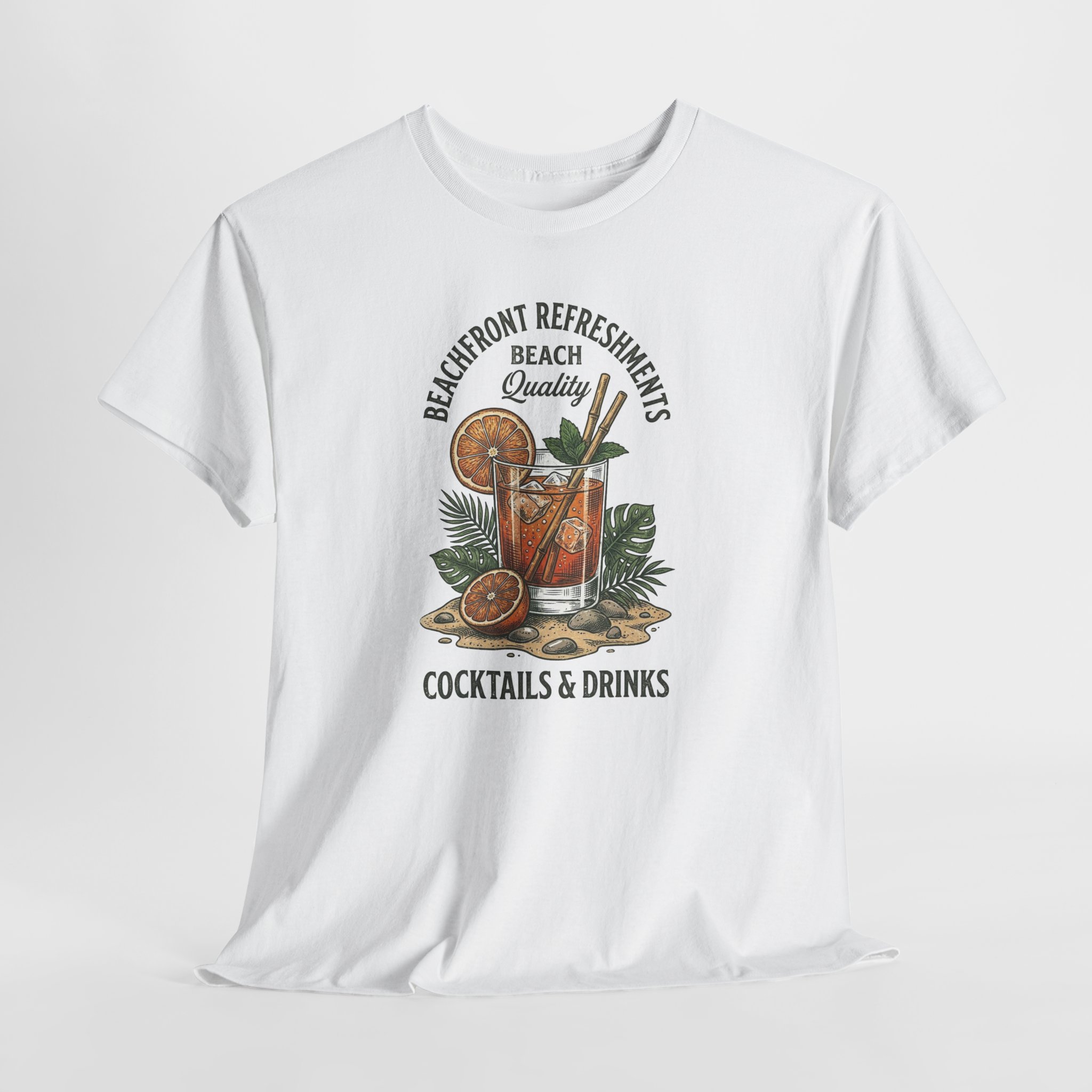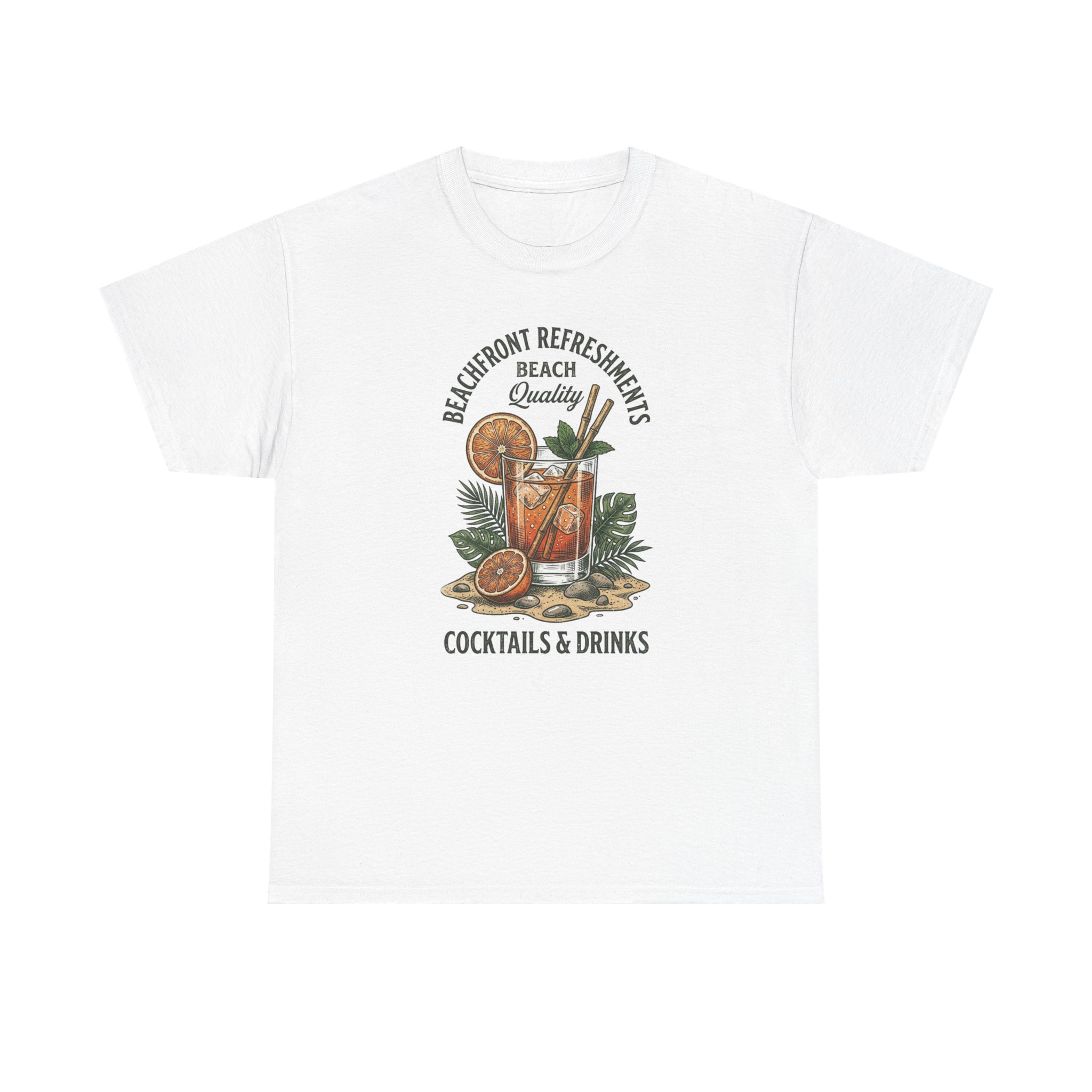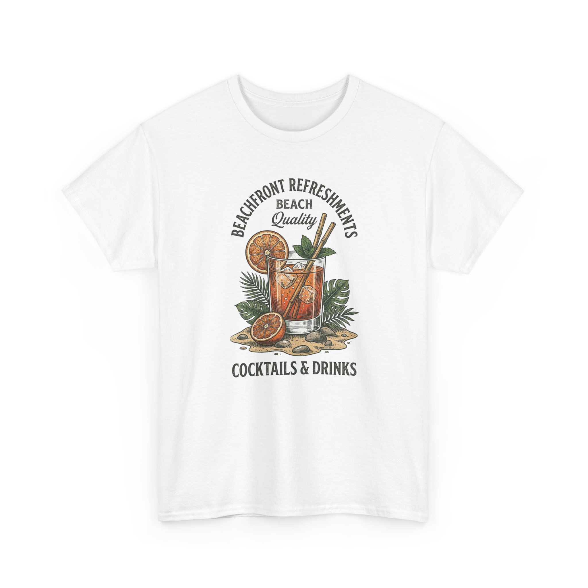 This relaxed, classic-fit tee carries a sun-warmed, beach-side vibe. The front art shows a laid-back cocktail scene—citrus slices, a tall drink with a straw, and tropical foliage—framed by vintage lettering that reads like the sign of a favorite seaside refreshment spot. Lightweight but sturdy cotton and a neat crew neckline make this shirt easy to wear from midday boardwalk walks to evening bonfires. It settles into the wardrobe as a casual staple that evokes slow afternoons, salty air, and shared drinks with friends.