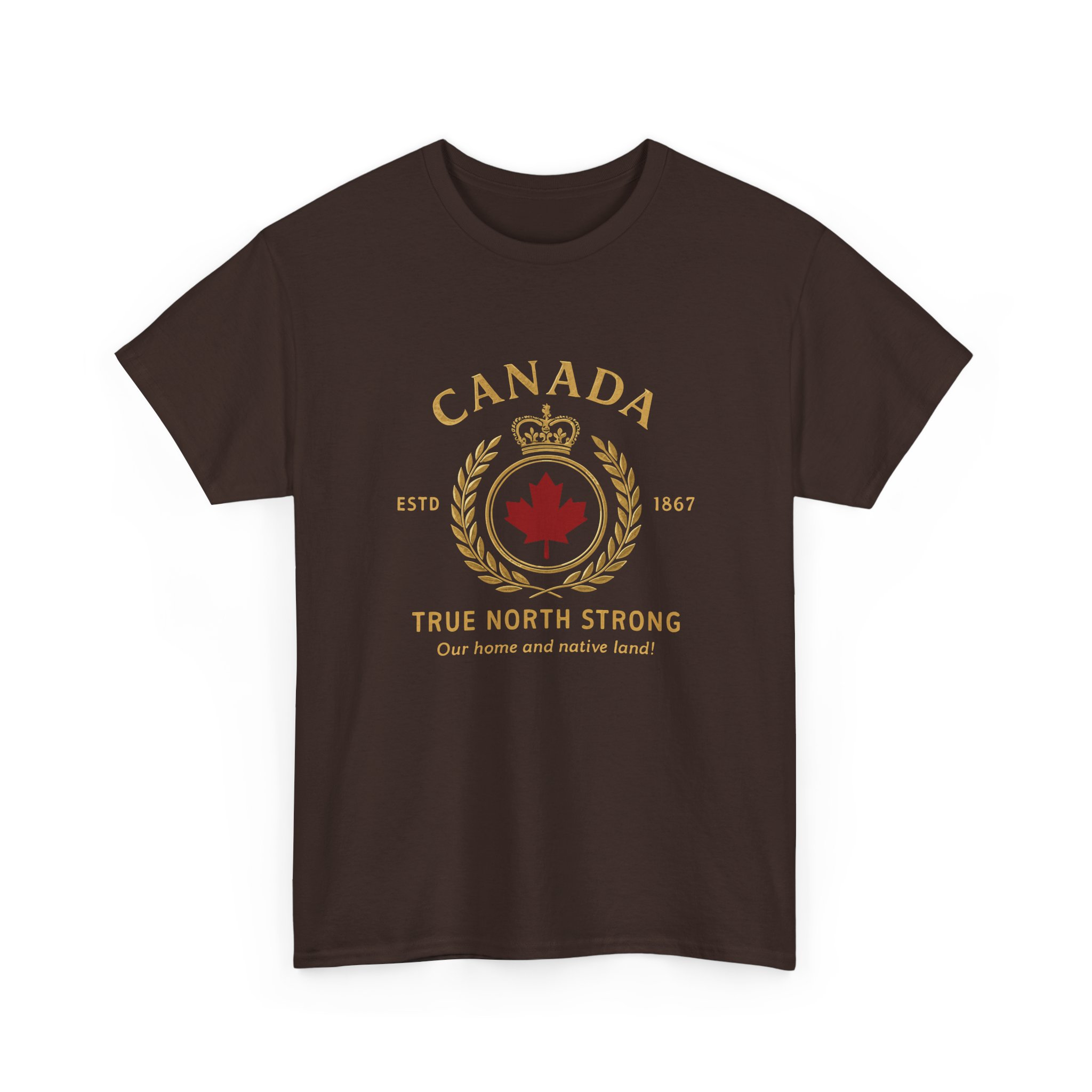 A classic short-sleeve tee that carries a quiet, nostalgic pride. Soft, medium-weight cotton drapes with a relaxed fit while a vintage-inspired Canada crest print adds warm, worn-in character. Wear it on cool mornings at the cabin, while walking city streets, or layered under a flannel for evenings by the fire. The ribbed collar and shoulder tape keep the shape through repeated wear. Subtle natural flecks on the light-colored fabric and a tear-away label make this shirt comfortable and lived-in from day one.