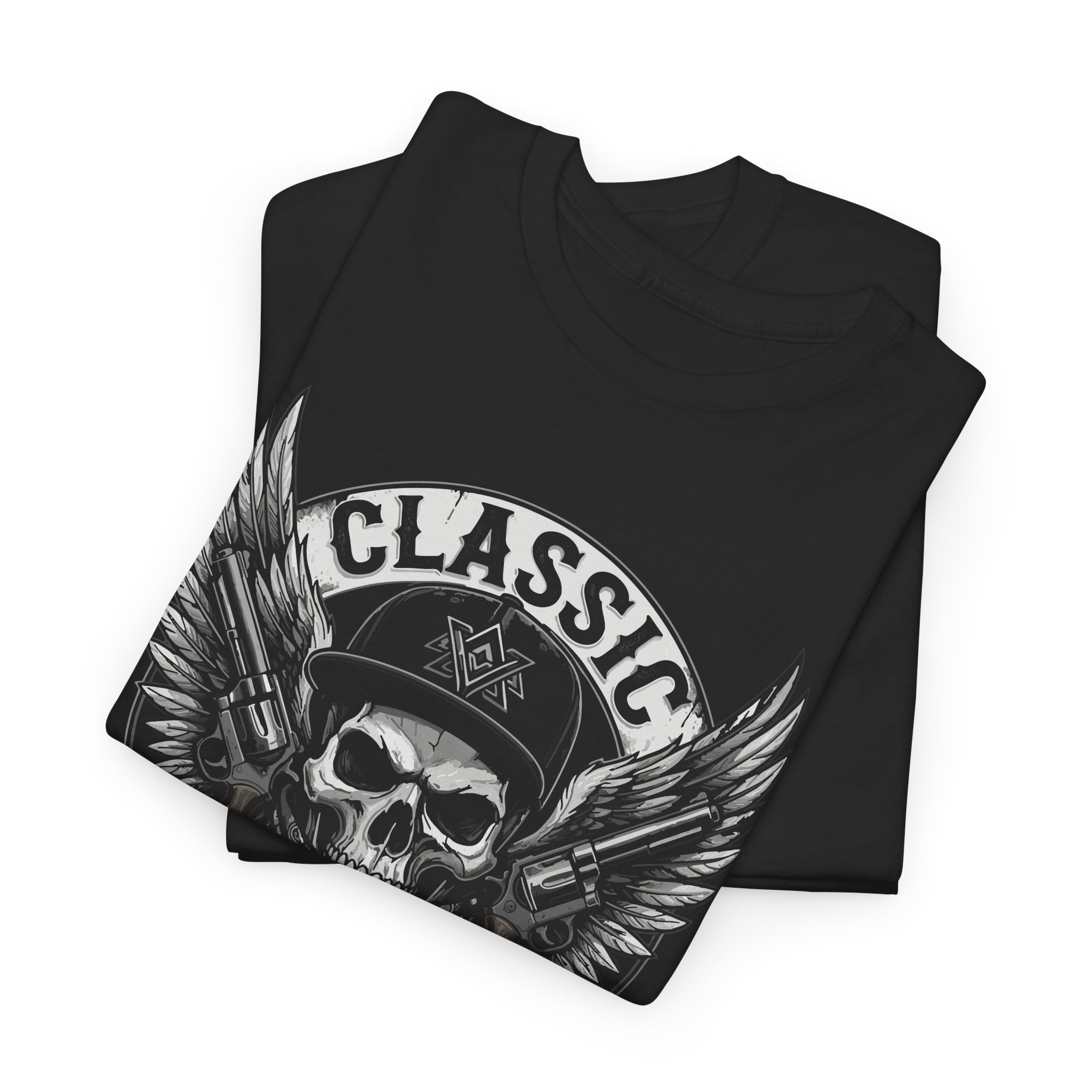 A rugged, vintage-inspired tee that brings motorcycle-club edge to everyday wear. The front art features a weathered skull in a captain’s cap, framed by outstretched wings and the bold wording “Classic Criminal” — rendered in distressed greys that read like a worn patch on matte black cotton. The shirt sits loose in a classic fit, with a clean crew neckline and a soft, mid-weight hand that drapes comfortably from morning rides to late-night hangs. It feels lived-in from the first wear: tough but breathable, with printing methods that keep the graphic crisp and detailed wash after wash. Wear it with a leather jacket, denim, or layered under an open flannel to lean into the outlaw aesthetic.