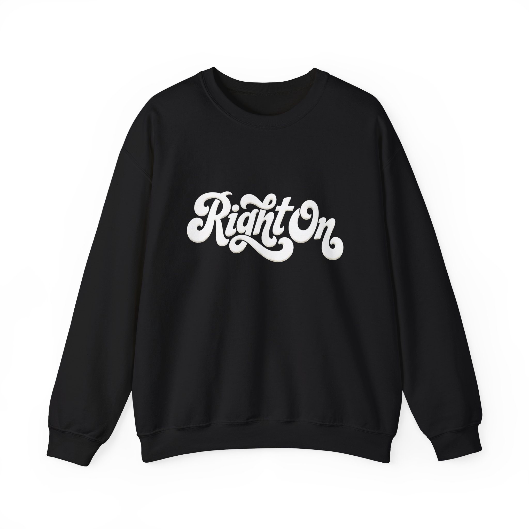 This cozy crewneck sweatshirt carries a confident, vintage-inspired vibe. The bold, swirled “Right On” script sits across the chest in raised embroidery, giving the design tactile depth and a handcrafted feel. The medium-heavy cotton-poly blend feels substantial without being stiff, and the tubular knit construction creates a clean, seamless look. Soft ribbing at the collar, cuffs, and hem keeps the shape after repeated wear. It’s the kind of sweatshirt you reach for on slow weekend mornings, while running errands around town, or layered for a bonfire with friends — comfortable, durable, and quietly expressive.
