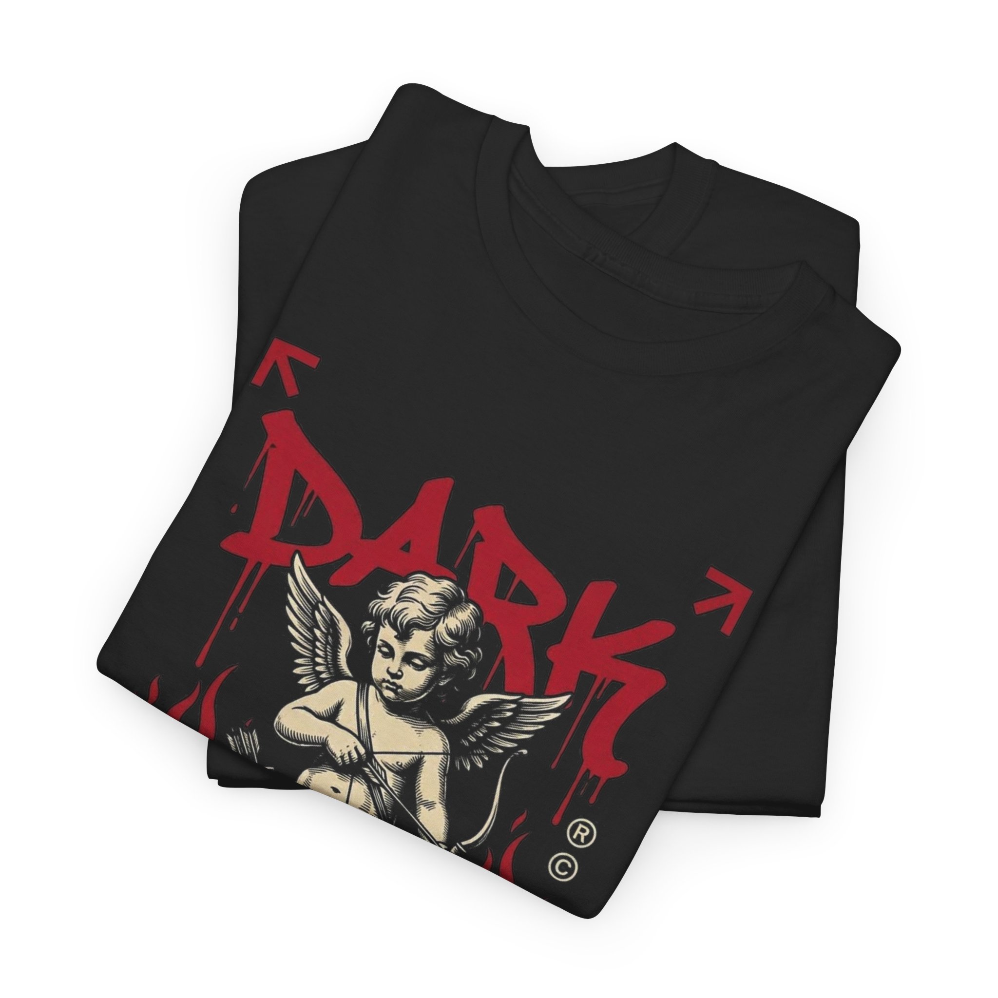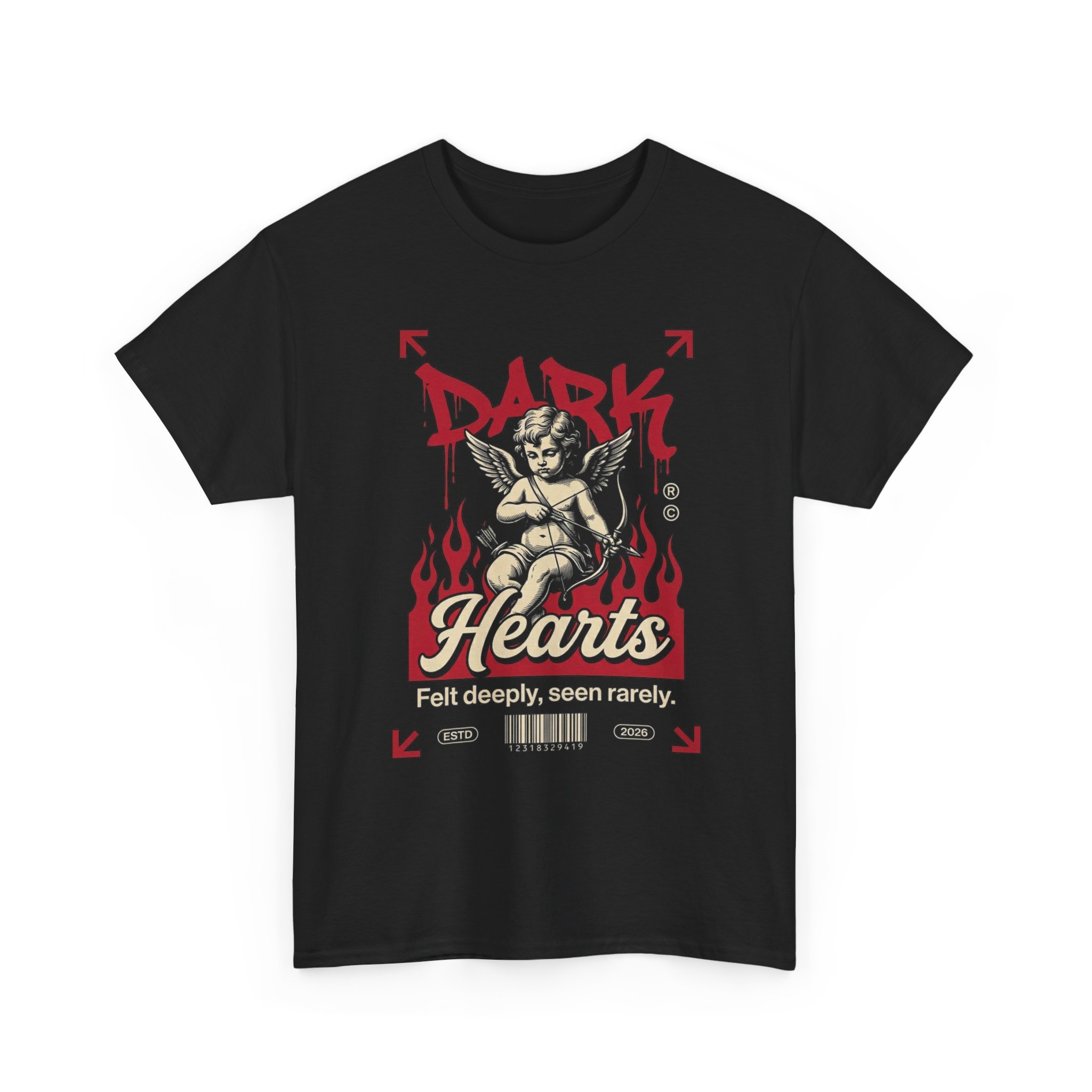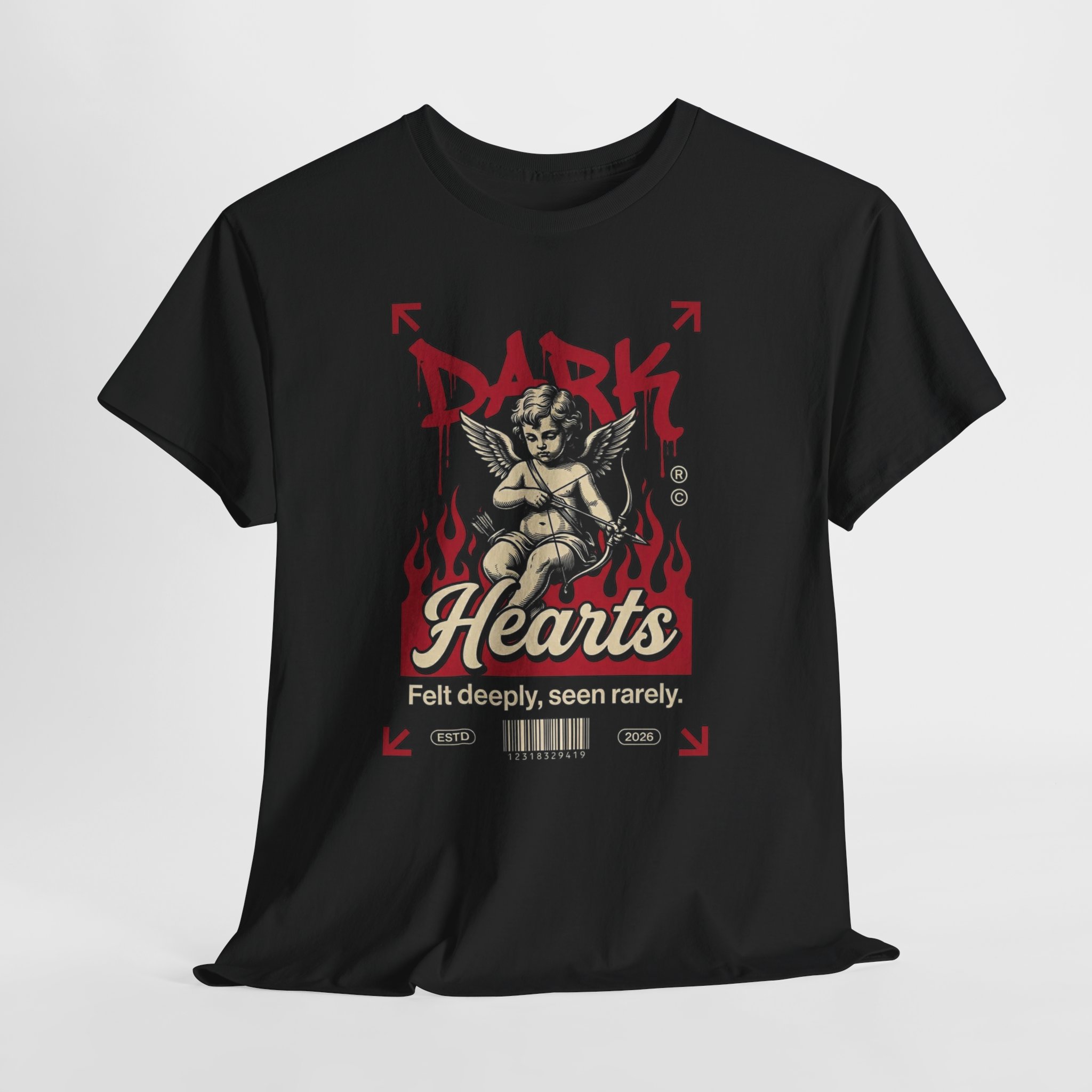 Slip into a tee that speaks in quiet, restless tones. This classic black shirt carries a vintage-inspired graphic — a cherub perched among stylized flames beneath the words “Dark Hearts” — that feels like an echo from late-night playlists and city-sidewalk introspection. The soft, slightly structured cotton holds the print crisply while the relaxed cut lets you layer a worn flannel or wear it alone on warmer nights. It’s the kind of shirt you reach for when you want your look to whisper moody confidence: understated, a little rebellious, and unmistakably personal.