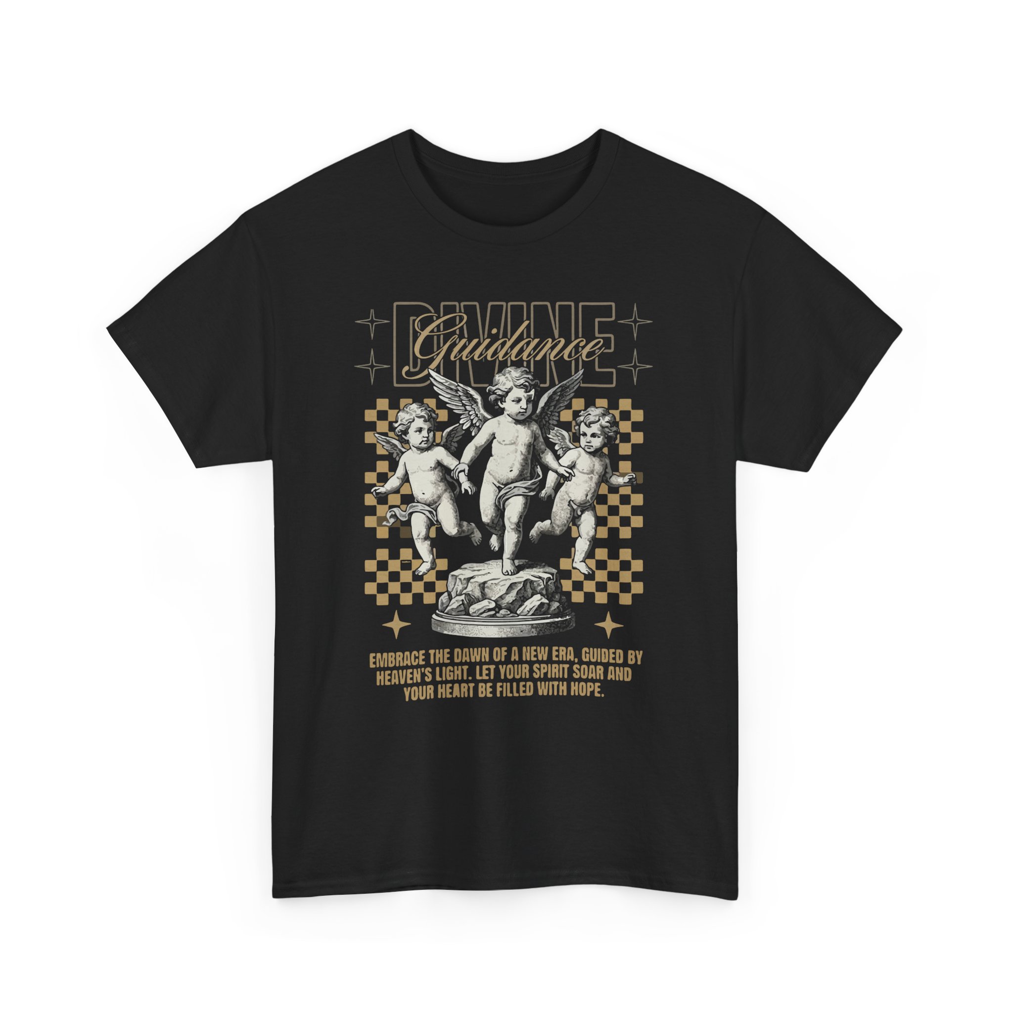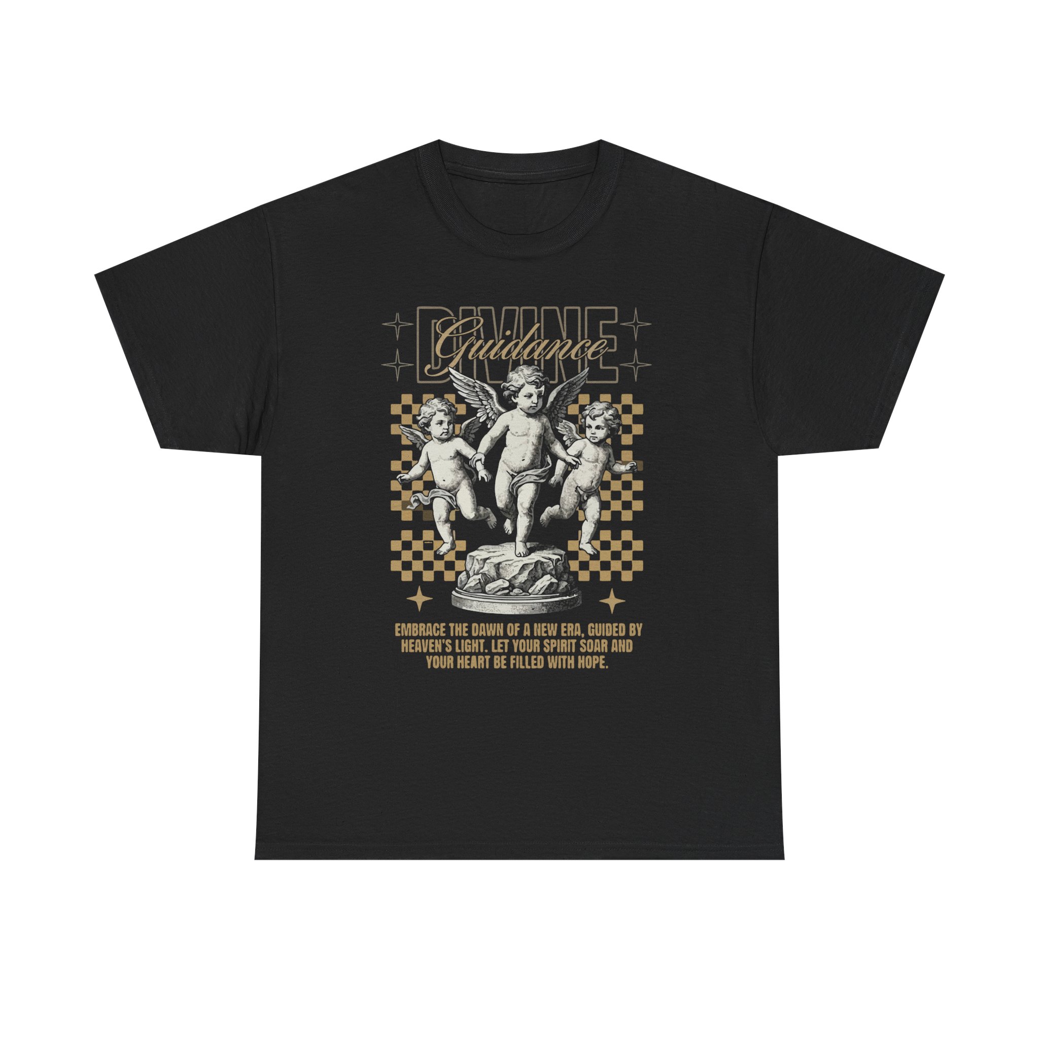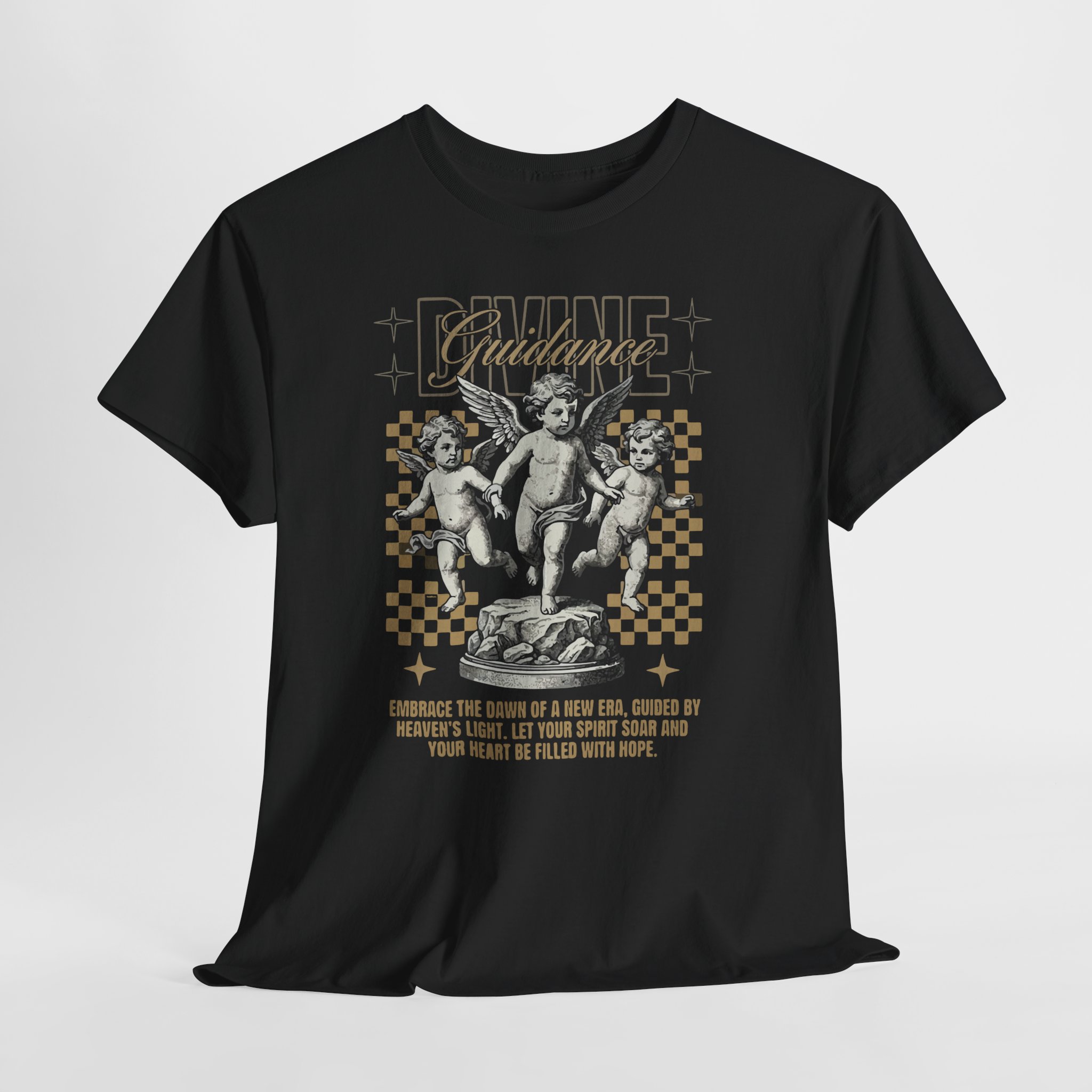 A vintage-inspired cotton tee that blends classical art with modern streetwear attitude. Soft yet sturdy, the black shirt showcases an ornate cherub illustration set against a checkerboard grid and subtle metallic accents. The graphic reads like a found poster — wear it layered under a denim jacket or on its own to add artful contrast to everyday outfits. The relaxed, boxy silhouette and crew neckline make it easy to move in while the smooth, high-quality print stays crisp wash after wash. This shirt feels like a small, wearable rebellion: thoughtful, a little nostalgic, and quietly bold.