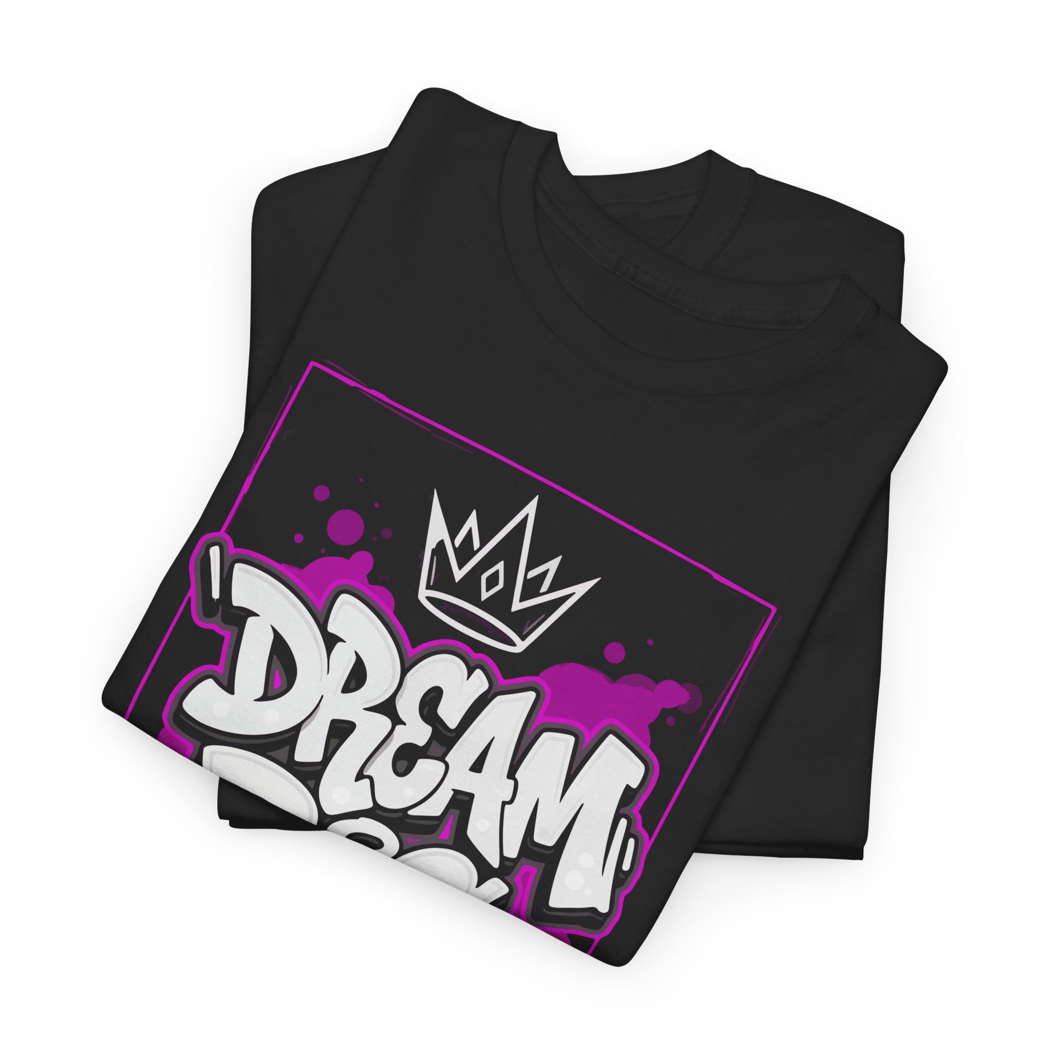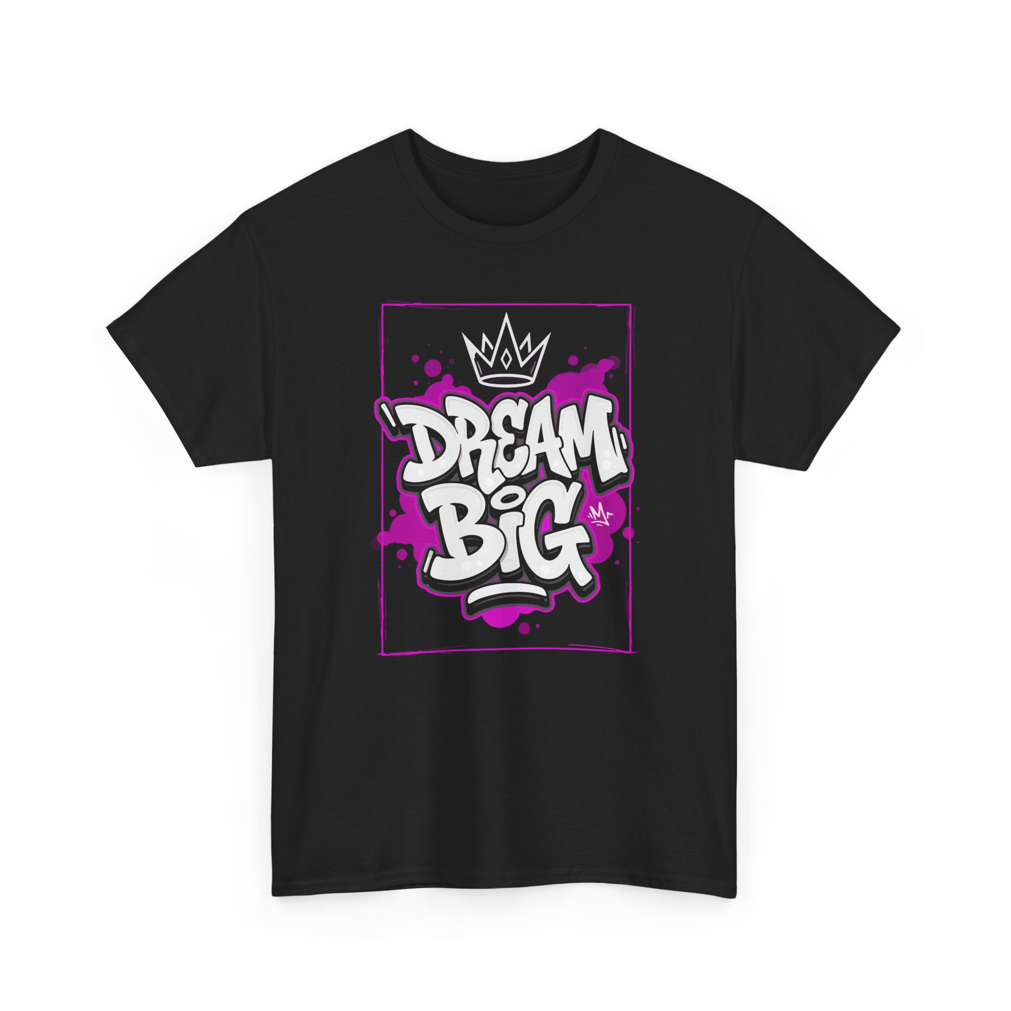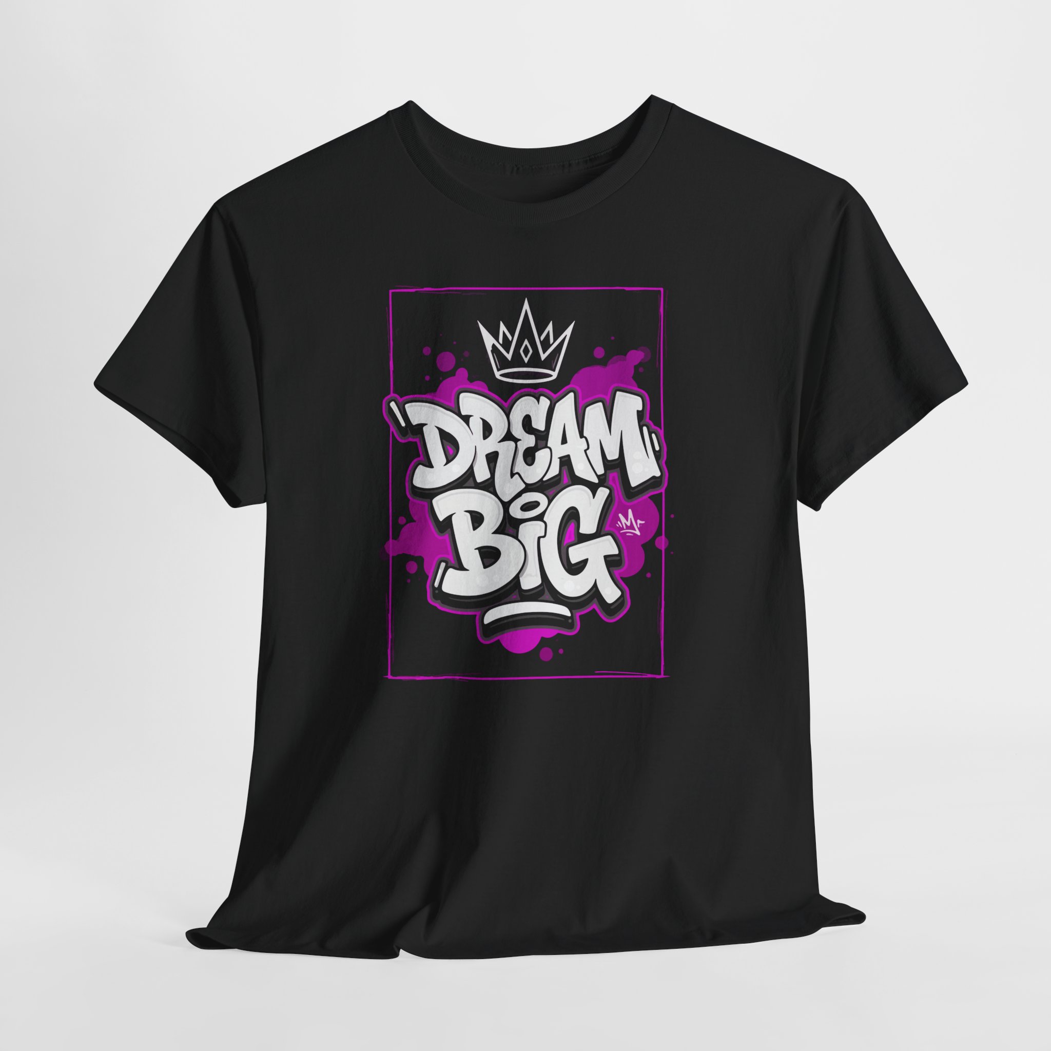 This tee carries an urban pulse — a bold graffiti-style “Dream Big” graphic in white and purple framed like a street mural. It sits relaxed on the body with a clean crew neck and boxy silhouette, so it layers easily under jackets or stands out alone. Wear it to skateparks, late-night jam sessions, or creative meetups; the design announces ambition and grit without shouting. The soft, sturdy cotton feels familiar from the first wear and holds up wash after wash, keeping that printed artwork crisp thanks to high-detail printing methods. Slip it on when you want your goals to be seen and your style to speak for itself.