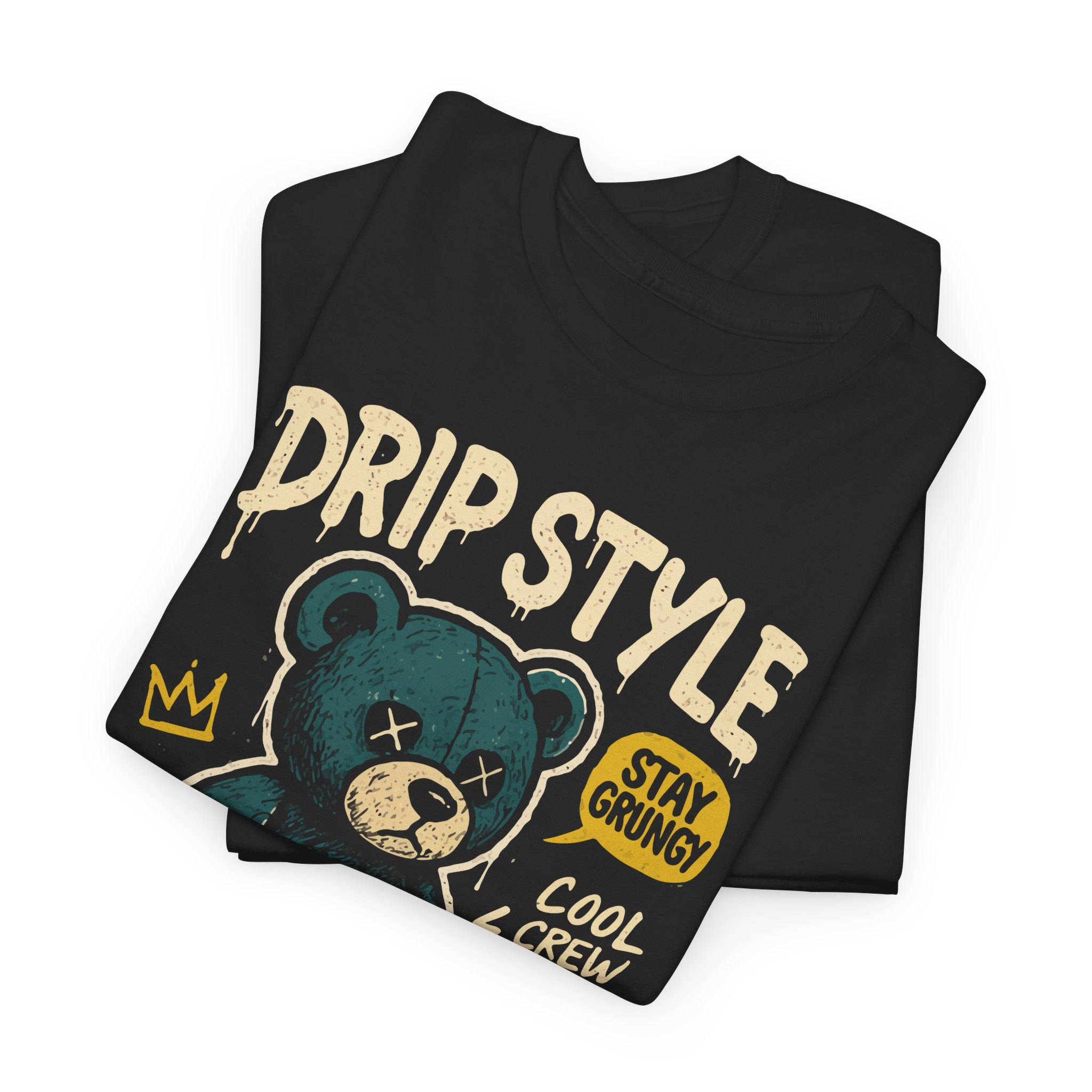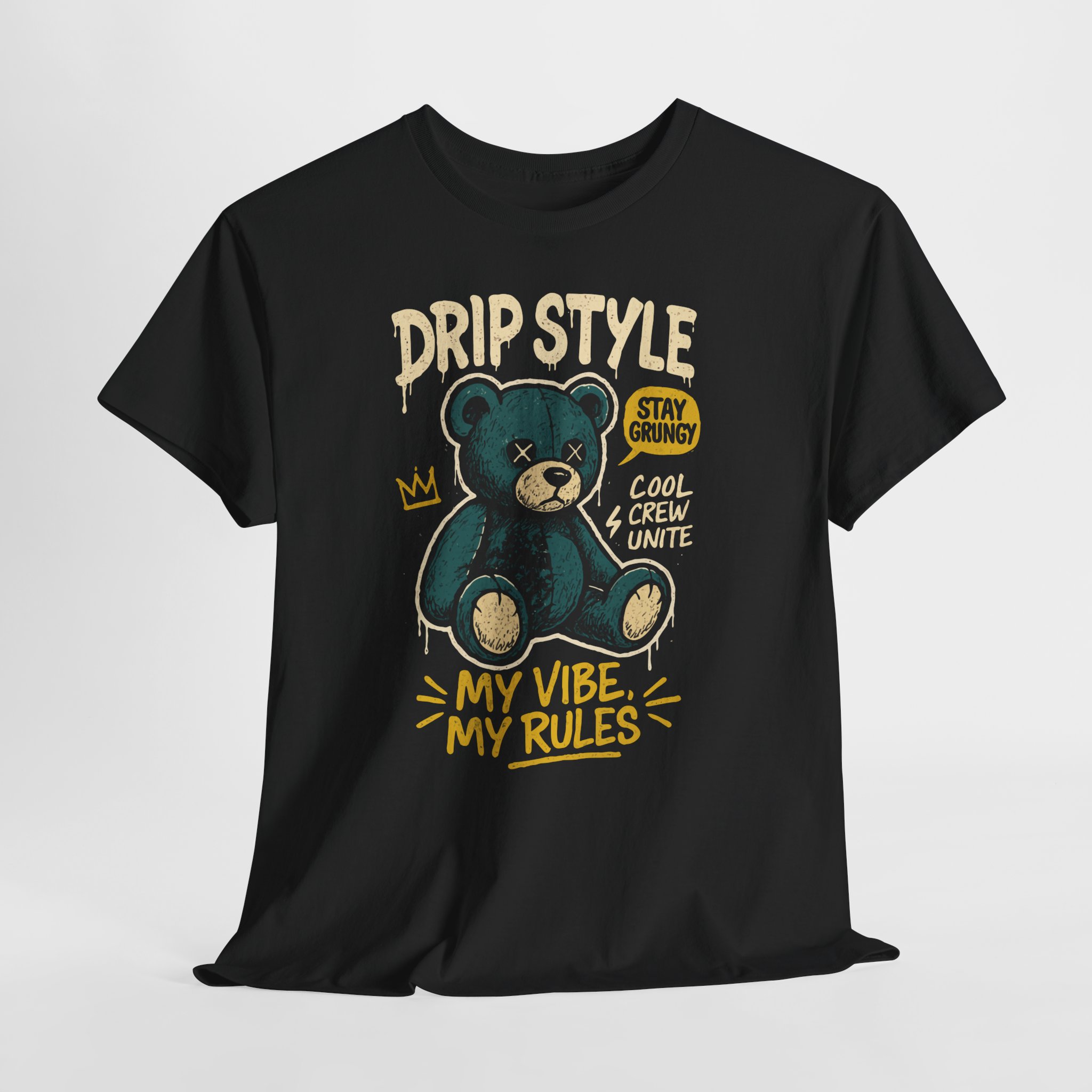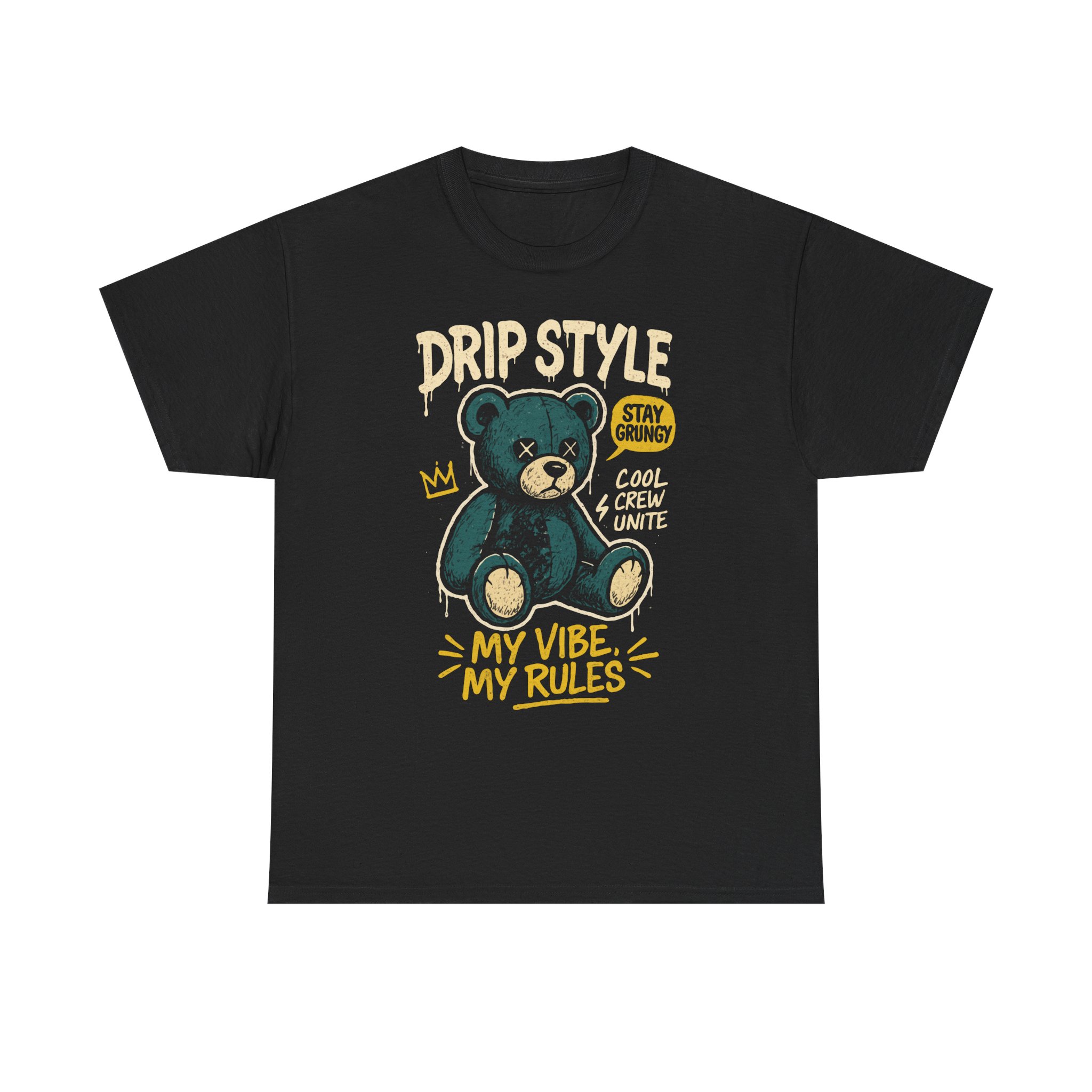 This black cotton tee carries a playful, streetwise energy. Front art shows a slightly grungy teal teddy bear wearing a crown with hand-lettered lines that read “DRIP STYLE,” “MY VIBE MY RULES,” and small tags like “STAY CHILLIN’” and “COOL & CREW UNITE.” The look feels like a mix of skateboard sticker art and nostalgic toy rebelliousness — casual but unmistakably confident. Soft, midweight fabric and a classic crew shape make it comfortable to layer under a jacket or wear on its own. The print’s textured, slightly worn style keeps the vibe lived-in and personal, so it slots naturally into everyday wardrobes for people who favor expressive, laid-back streetwear. Wear it to hangouts, skate sessions, or low-key nights out when you want an easy way to show attitude without shouting.
