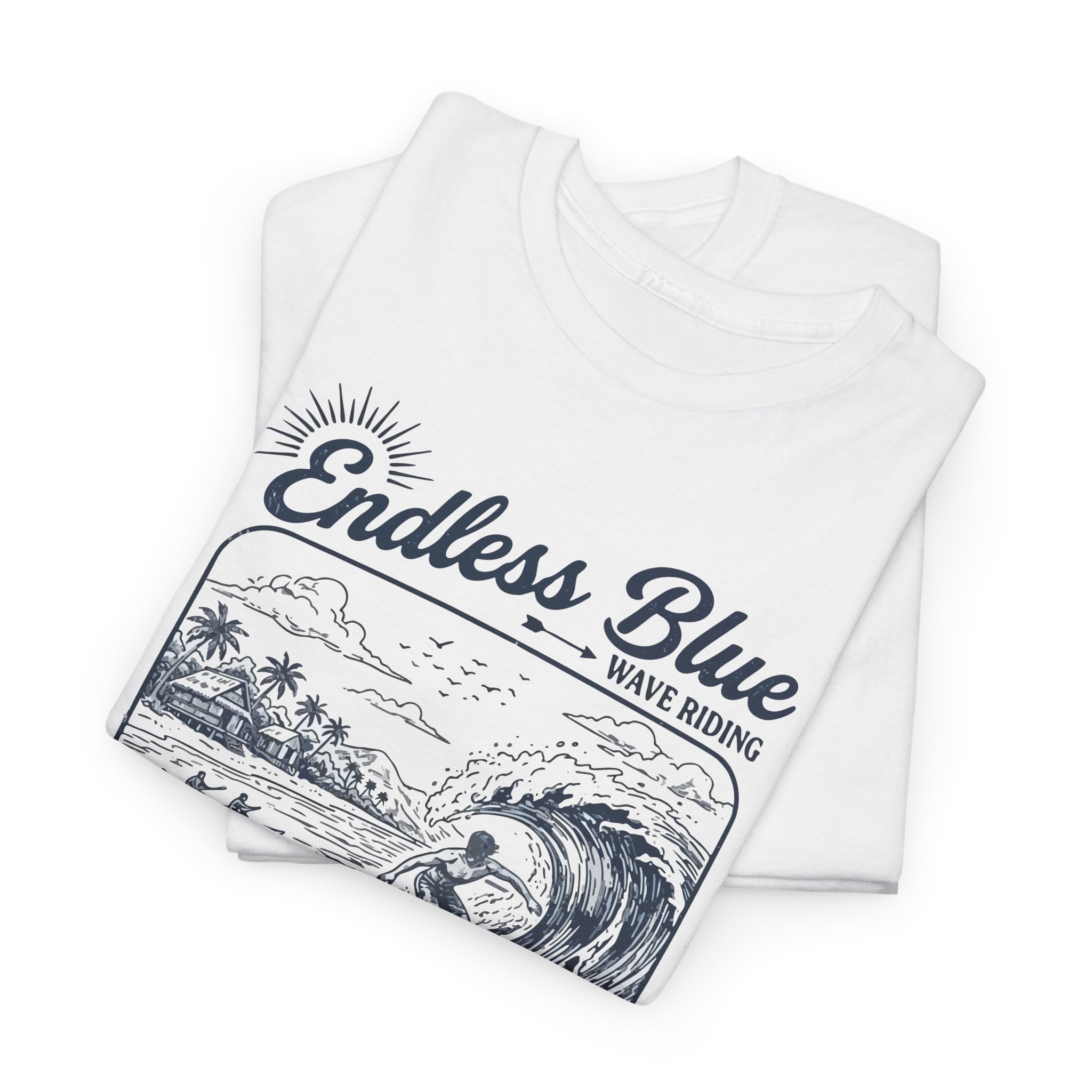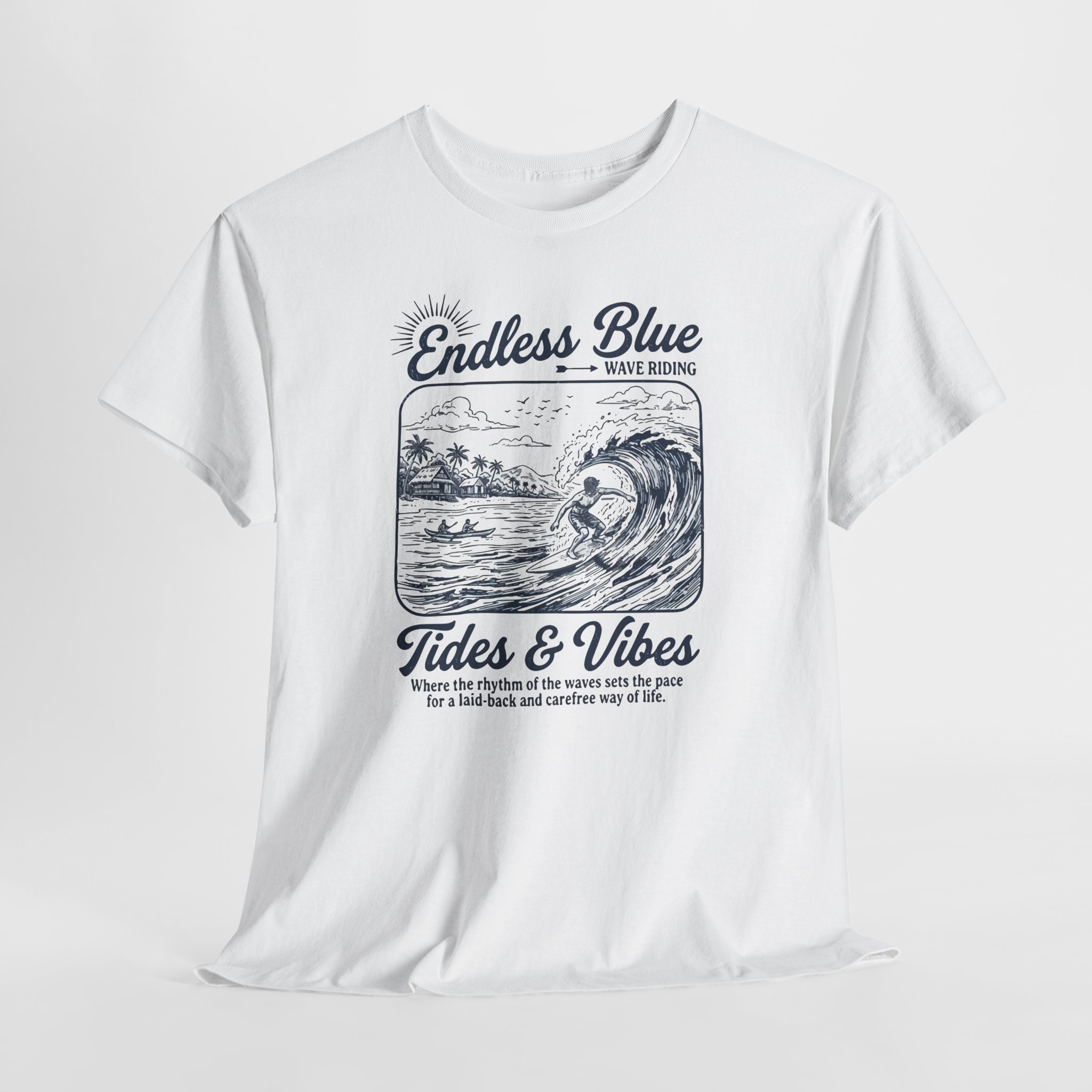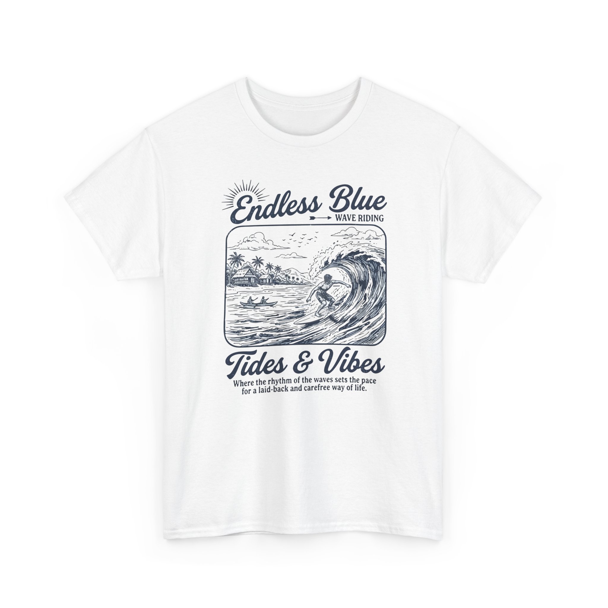 Feel the salt air and slow rhythm of the shore with this relaxed tee. The vintage surf sketch—rolling wave, distant palms, and a calm sun—invites daydreams of early morning lineups and quiet beach walks. Printed in detailed navy tones on soft cotton, it drapes casually over shorts or layered under an overshirt. Wear it to capture that laid-back coastal mood: surfing at dawn, lounging at a seaside café, or bringing a little ocean calm to everyday life.