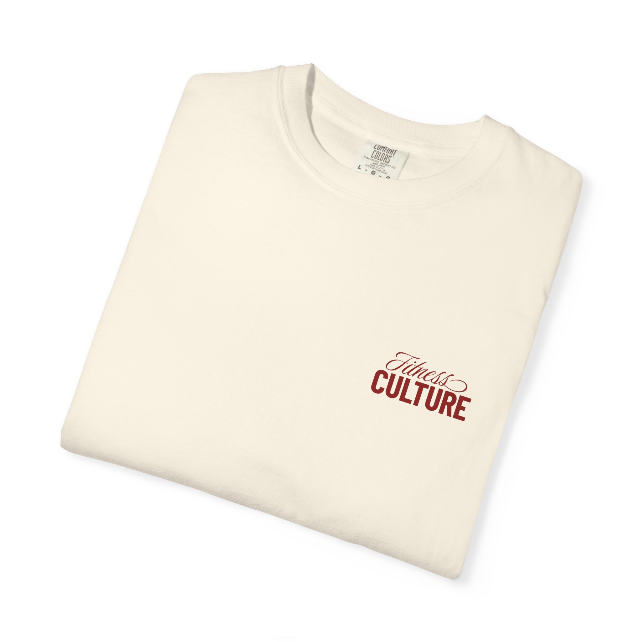 This heavyweight garment-dyed tee brings a lived-in, vintage-soft feel to everyday wear. The front features a small, elegant script logo, while the back reads “Fitness CULTURE” in bold, collegiate-inspired lettering — a subtle yet confident statement for people who live movement and community. The relaxed cut and substantial 6.1 oz cotton give it structure without stiffness. It layers easily over a long-sleeve on cool mornings or stands alone after a sweat, the muted dye and clean typography blending into both gym routines and weekend hangs. Wear it to post-workout coffee, community classes, or casual meetups — it feels like the shirt you reach for when you want your look to say you care about strength, consistency, and the people you move with.