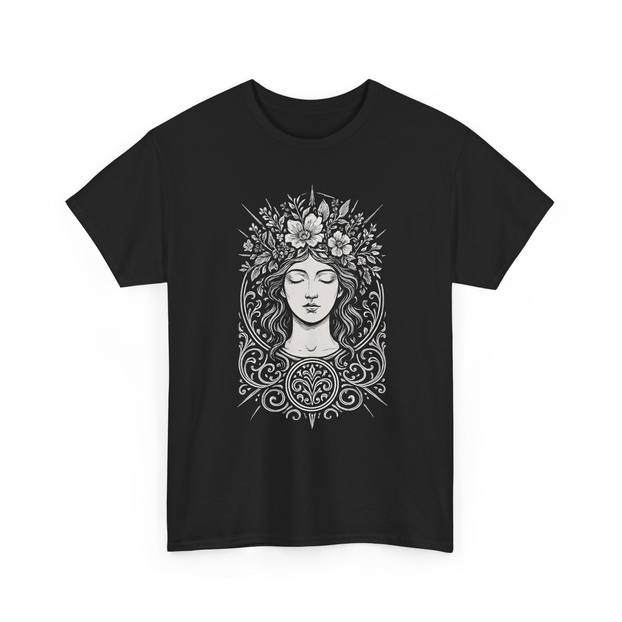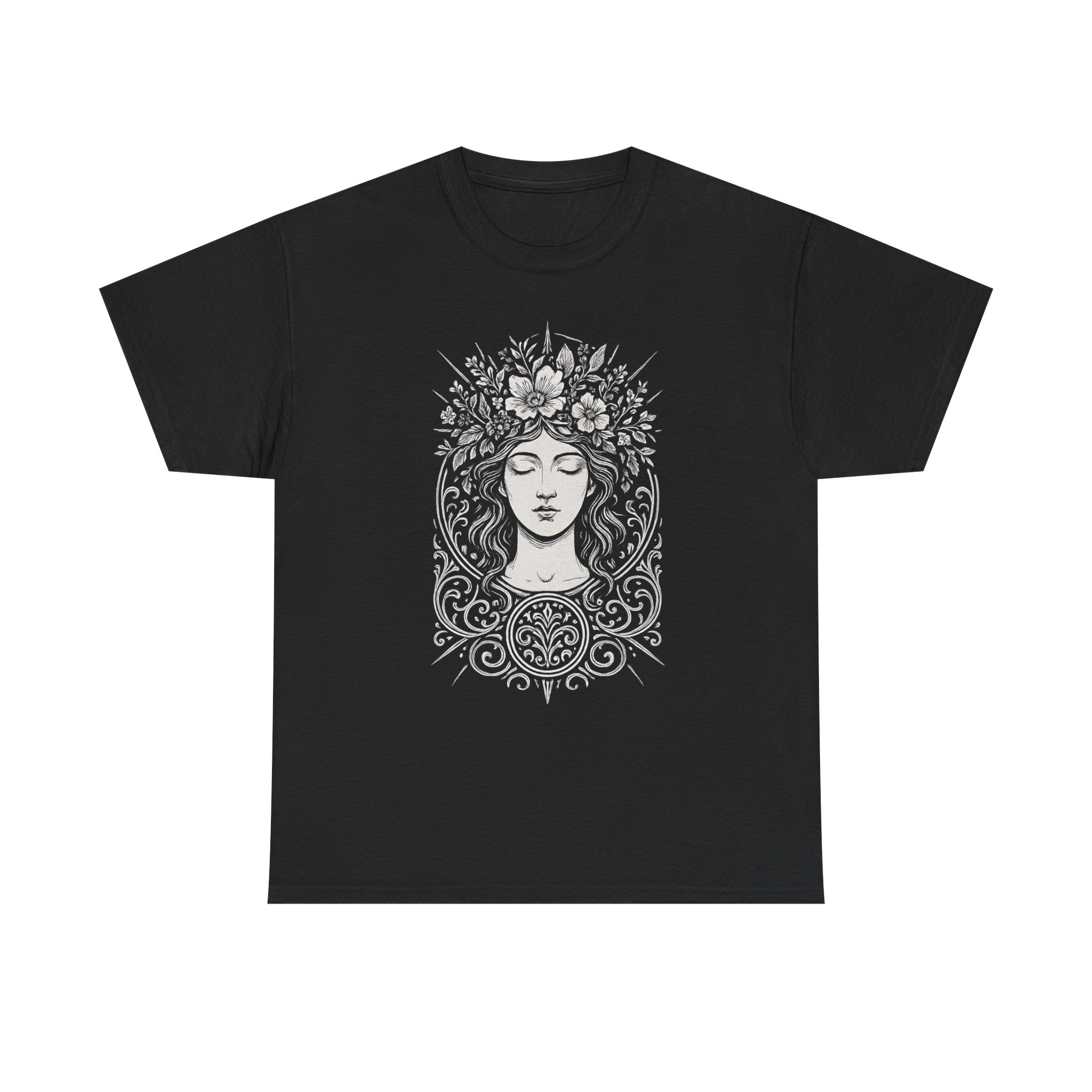 Soft, breathable cotton sits against your skin while a calm, moonlit portrait anchors the front—eyes closed, flowers braided into hair, ornate flourishes framing the face. This tee feels like slipping into a quiet evening: thoughtful, grounded, a little mysterious. Wear it to wander city streets after dusk, to sketch in a sunlit studio, or to share a slow conversation over coffee. The image reads like folklore brought into everyday life—subtle enough to layer under a jacket, expressive enough to stand alone.