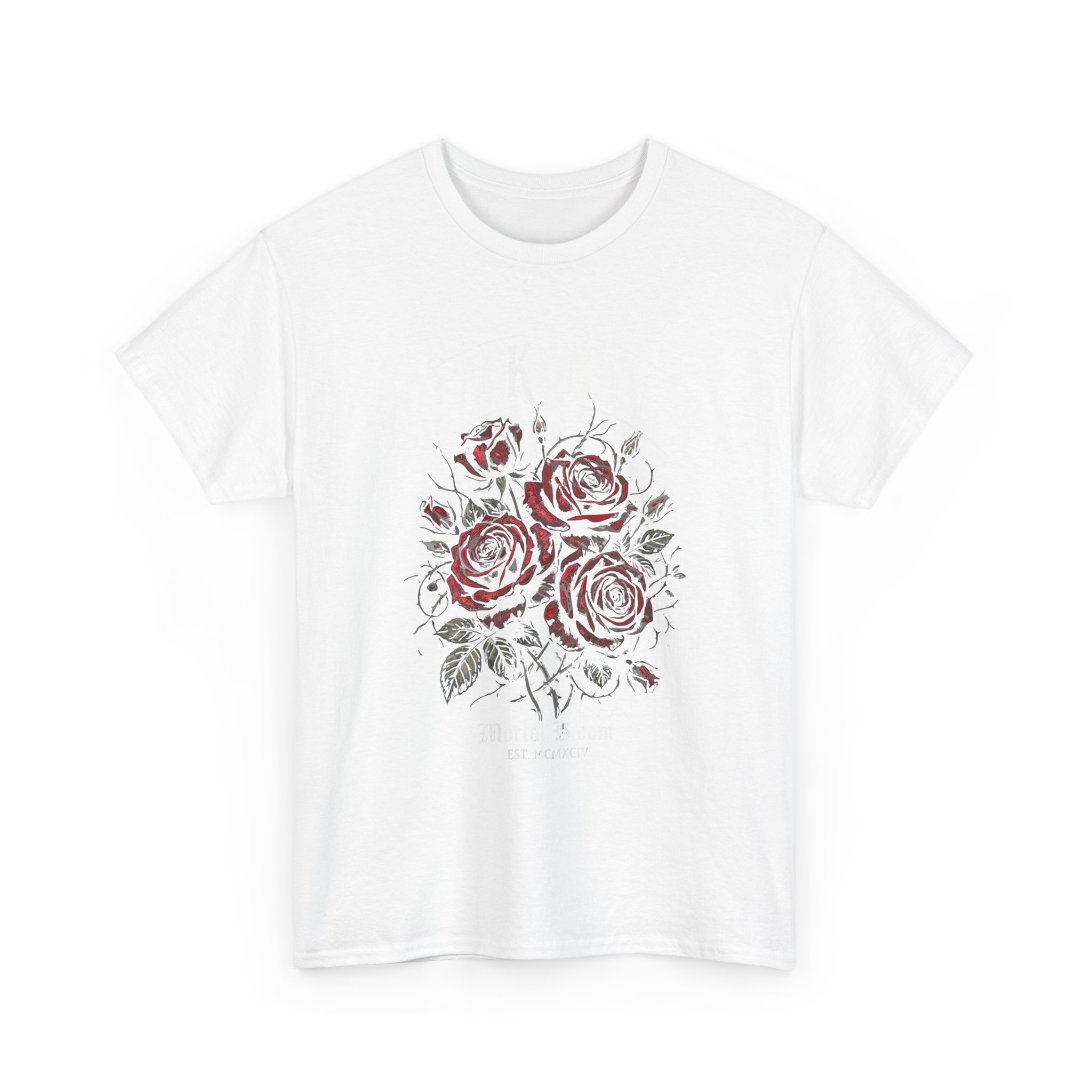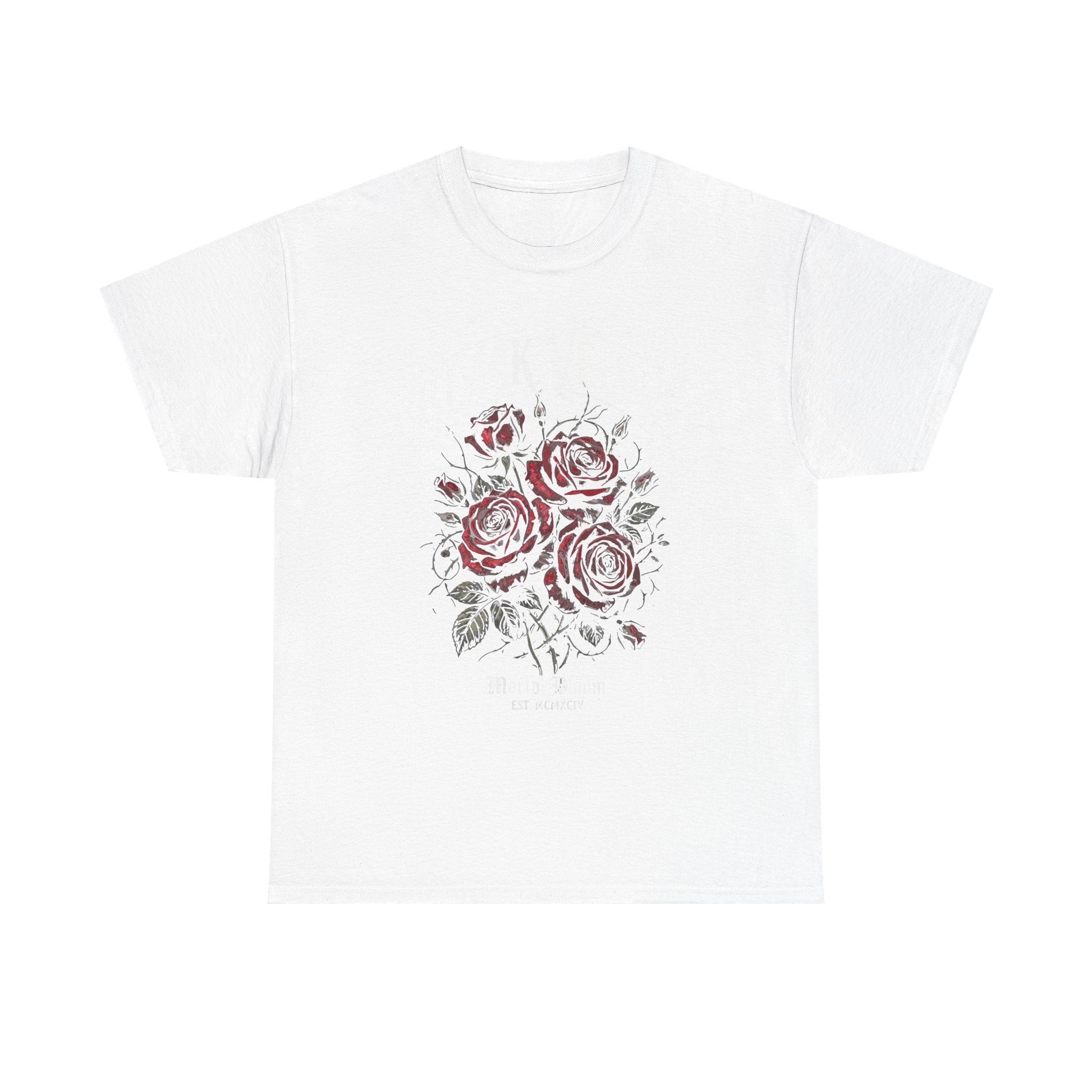 A soft, everyday tee that carries a quiet, vintage bloom. Hand-drawn roses sit gently at center chest, their muted reds and charcoal stems feeling like a worn sketch pulled from a travel journal. The shirt drapes in a relaxed, classic silhouette so the floral art reads like a natural part of your outfit — subtle, thoughtful, and slightly nostalgic. Wear it on slow mornings with coffee, at markets when you want something easy and expressive, or layered under a jacket for a softened pop of botanical detail.