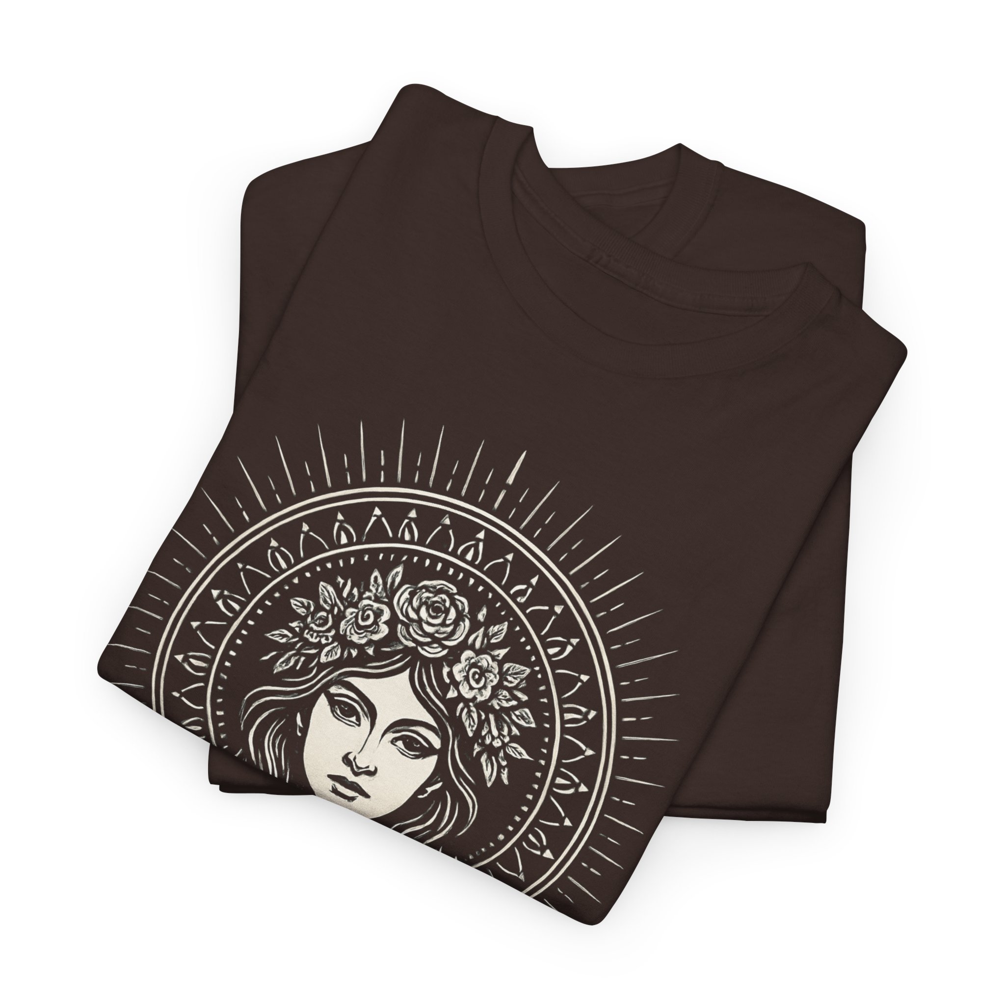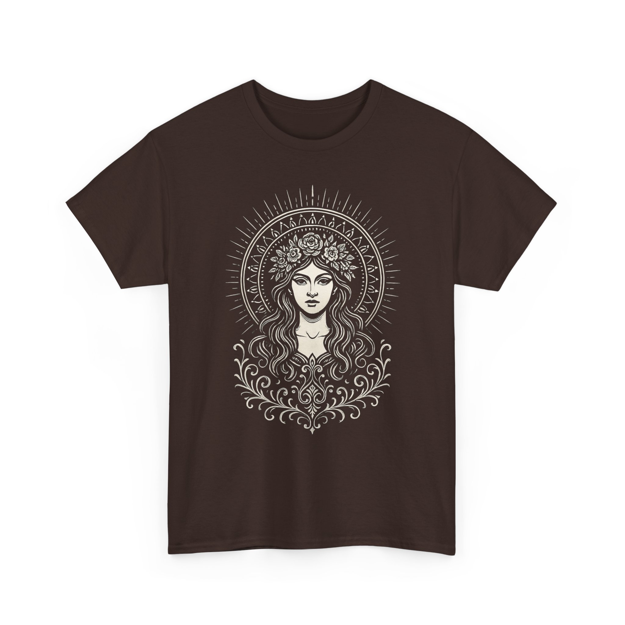 Soft, breathable cotton meets timeless, mystical art. This classic crew tee carries an intricate goddess illustration framed by radiating lines and floral details — a quiet piece that reads like a wearable talisman. It drapes with relaxed, everyday comfort and wears well layered under a jacket or alone on slow, sunlit afternoons. The neutral print colors sit subtly against the deep, earthy fabric so the design feels like an heirloom rather than a loud logo. Reach for this shirt when you want to feel grounded, intentional, and a little bit enchanted.