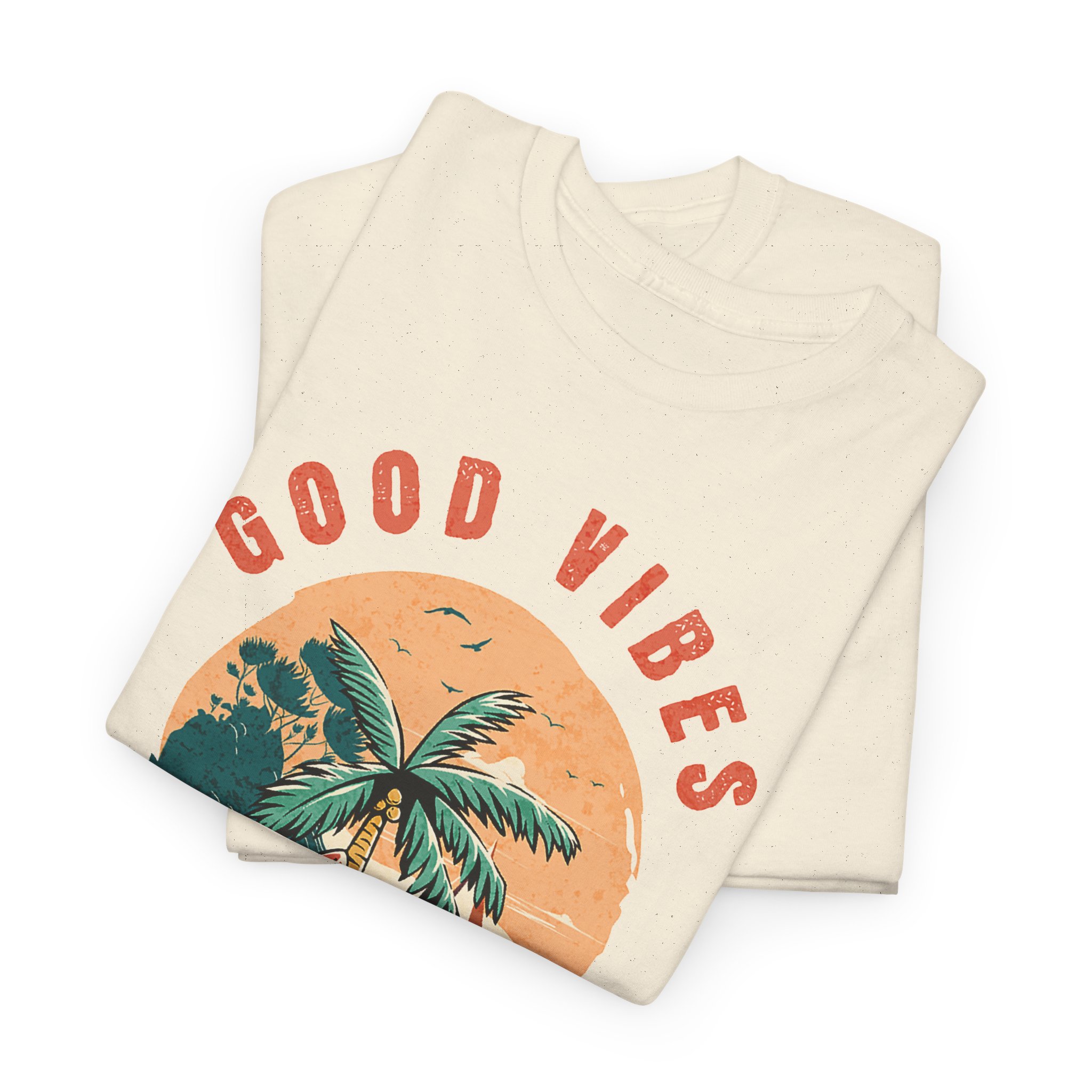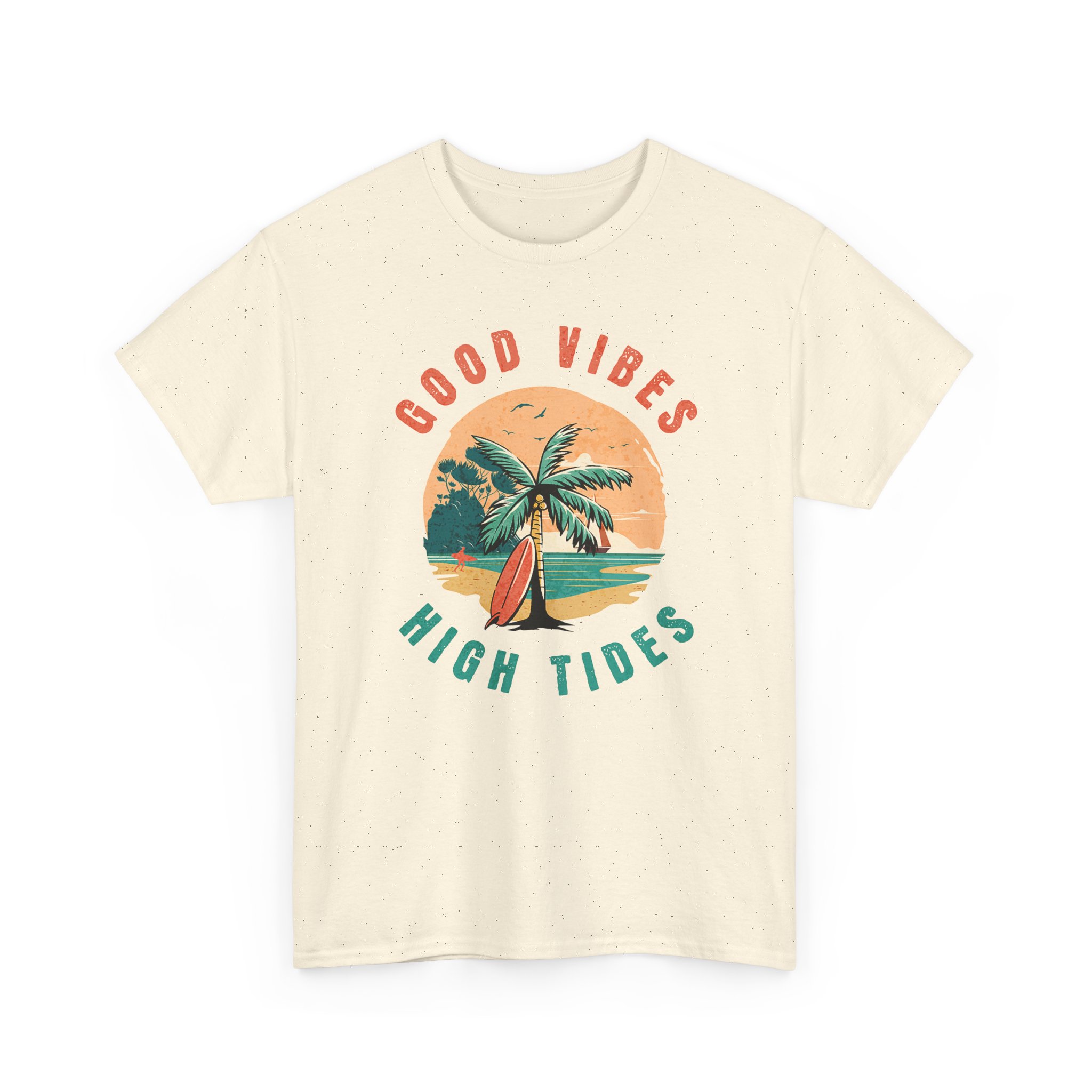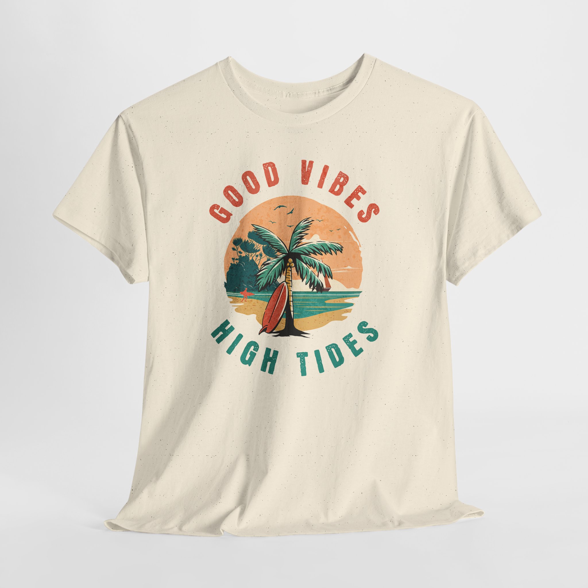 This shirt brings a soft, sun-warmed beach day to your everyday. A vintage surf circle—palm trees, a sunset wash, and a lone board—sits at the chest with the hand-lettered phrase “Good Vibes High Tides.” The natural speckled cotton gives the print an easy, lived-in look that feels like a favorite tee from the first wear. Wear it on slow mornings with coffee, after a day on the water, or paired with shorts and sandals for evenings by a bonfire. It’s relaxed, breathable, and made to age with you—fading and softening while keeping that coastal mood alive.