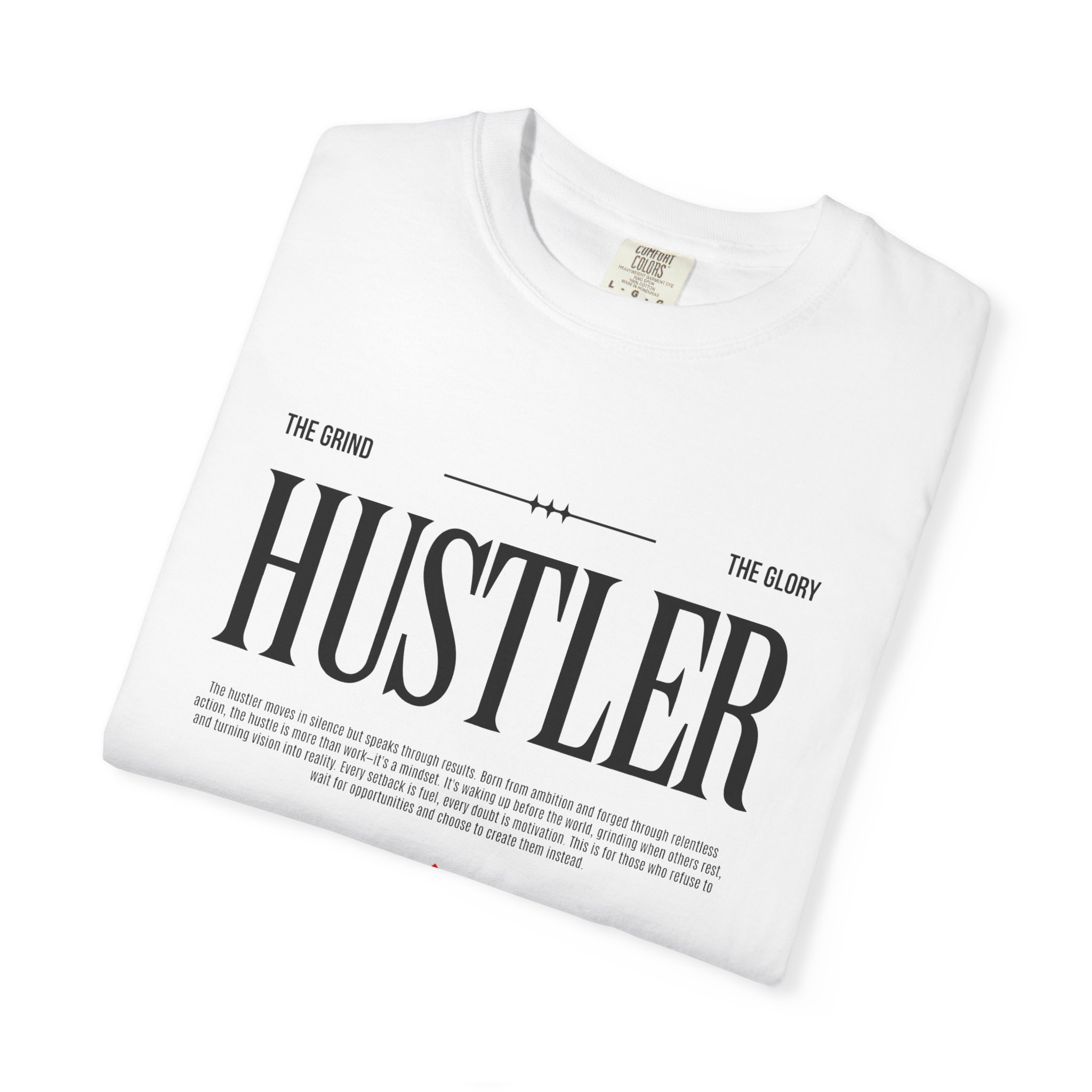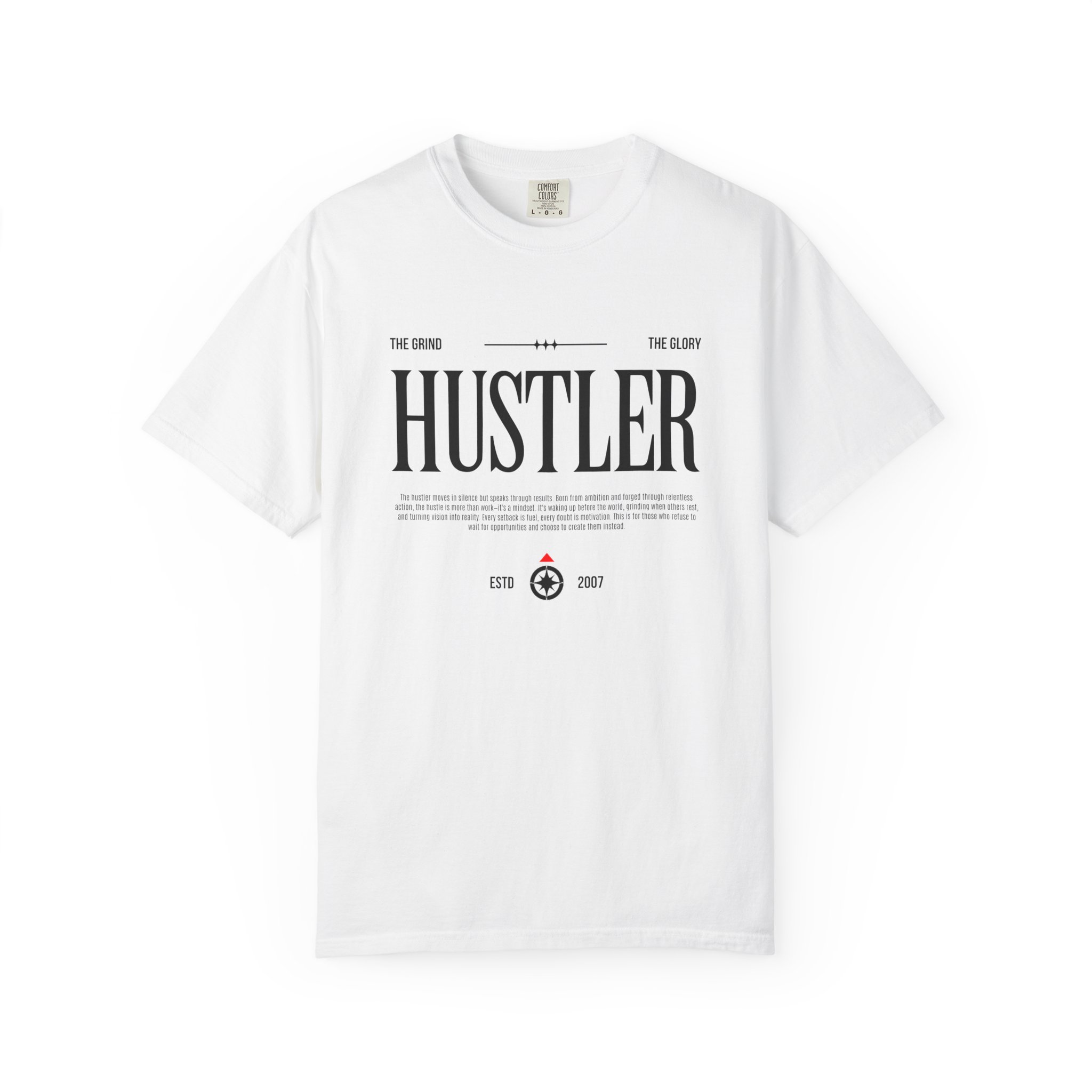 This relaxed-fit garment-dyed tee carries a quiet confidence. The bold “HUSTLER” chest print reads like a badge for people who grind without flash — entrepreneurs, creatives, side-preneurs who value craft and consistency. Soft, heavyweight cotton and the garment-dyed finish give the shirt a worn-in feel that settles comfortably into your rotation. Wear it with ripped jeans, a work jacket, or layered under a blazer on late nights when you’re pushing projects across the finish line. The clean white canvas and minimalist typography keep the message straightforward: steady work, calm focus, and late-night momentum.