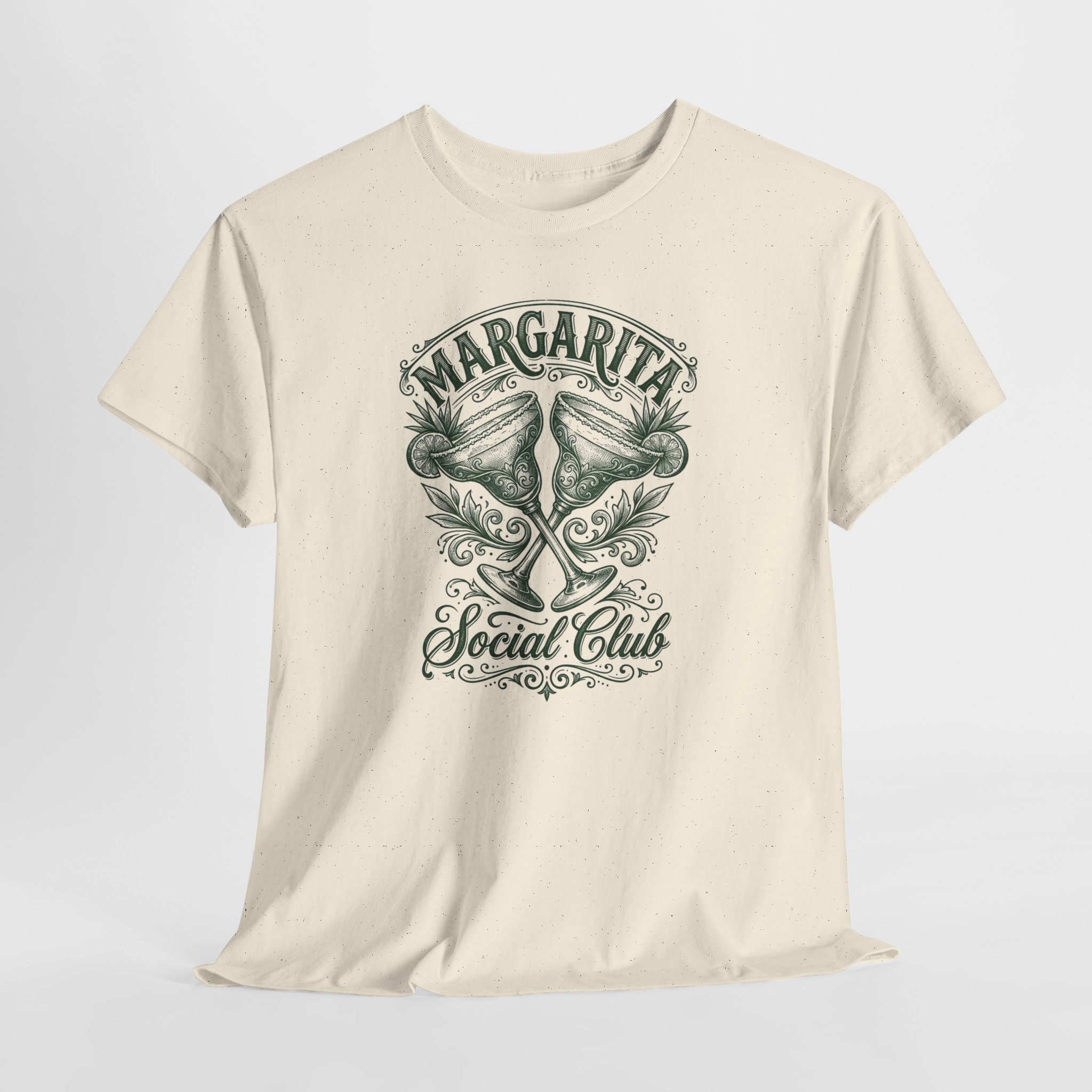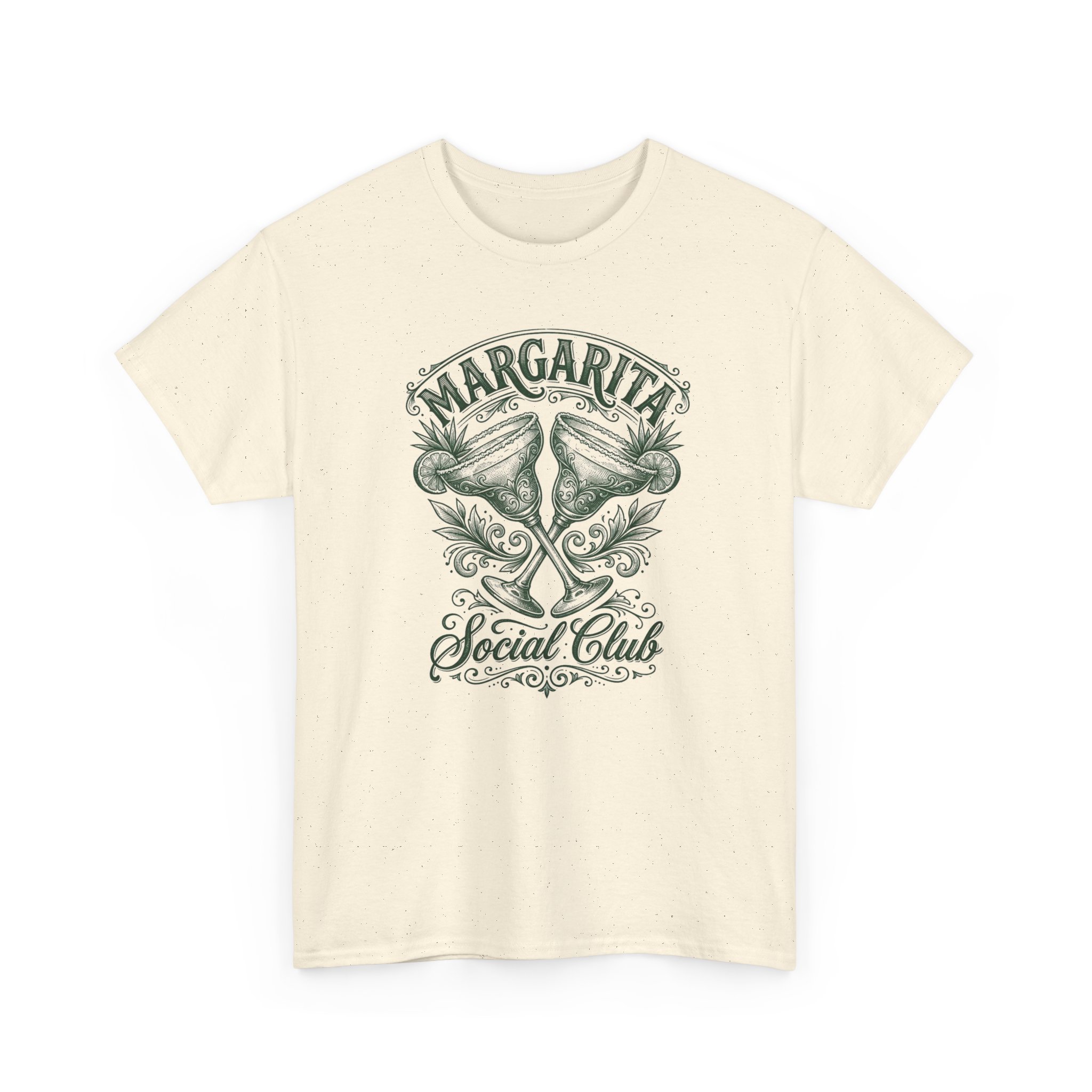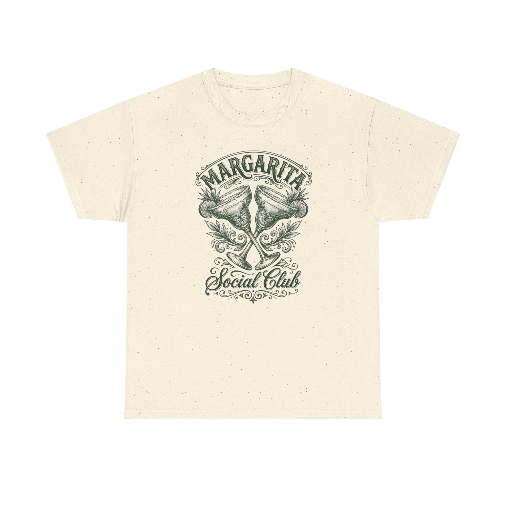 Soft, breathable, and quietly vintage — this natural cotton tee carries a faded Margarita Social Club design that feels like a memory of warm nights and salt air. The speckled natural fabric gives the print an authentic, lived-in look while the relaxed crew fit sits comfortably for long beach walks, backyard gatherings, or slow Sunday afternoons. Details like the ribbed collar, shoulder tape, and tear-away label keep the shirt feeling broken-in without losing shape. Wear it with worn denim, linen shorts, or layered under an open shirt for a casually curated vibe that says you value comfort and character.