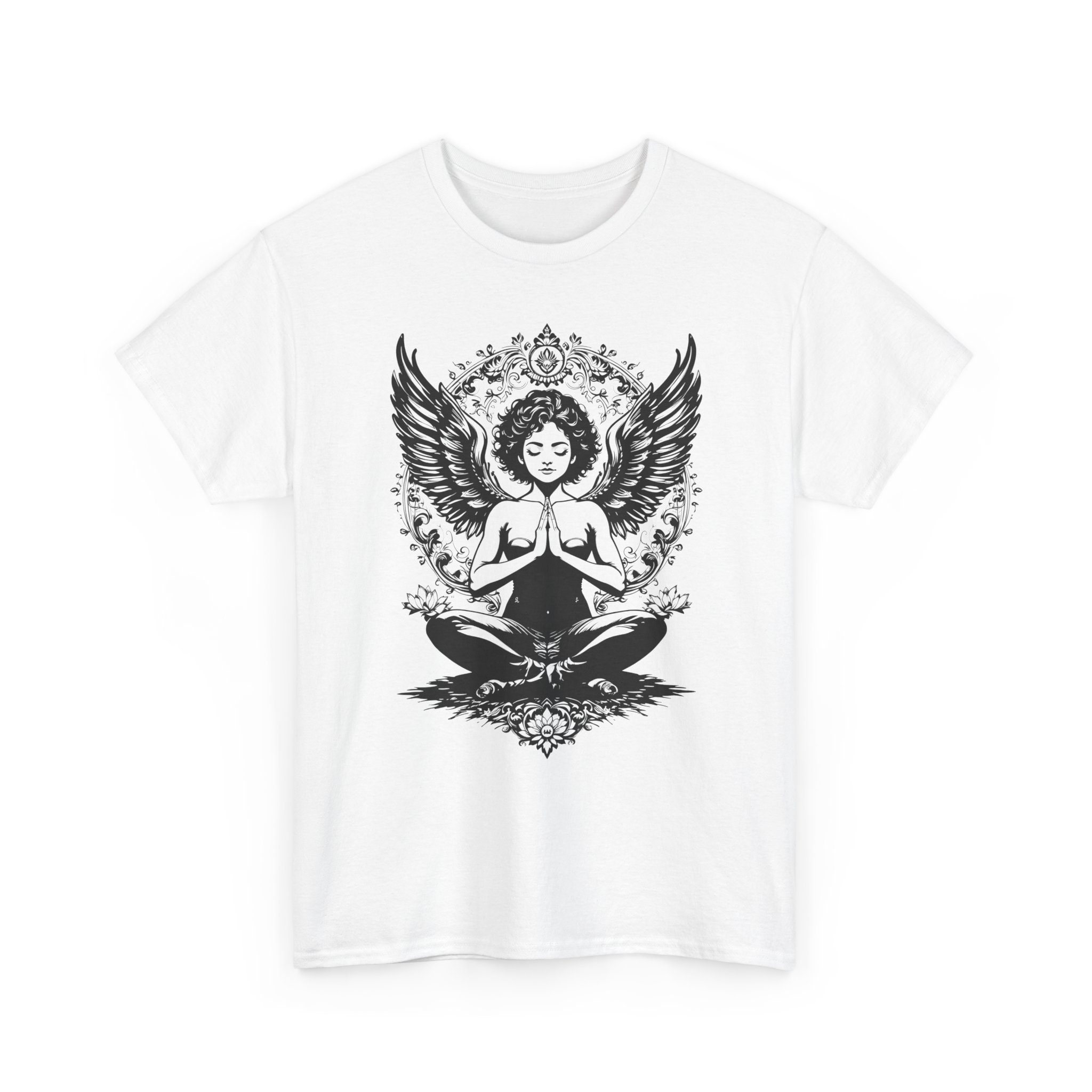 Soft, breathable, and built to last — this classic tee carries a calm, sacred energy. The front features a detailed black-and-white illustration of a meditative figure with wings and ornamental mandala accents. It reads like wearable art: quiet, spiritual, and a little rebellious. Wear it to your yoga class, on a slow morning walk, or layered under a jacket for a mindful city commute. The relaxed crew neck and classic fit let the artwork sit front-and-center without feeling tight or fussy. Thoughtful construction — from shoulder tape to a ribbed collar and tear-away label — keeps the focus on comfort…