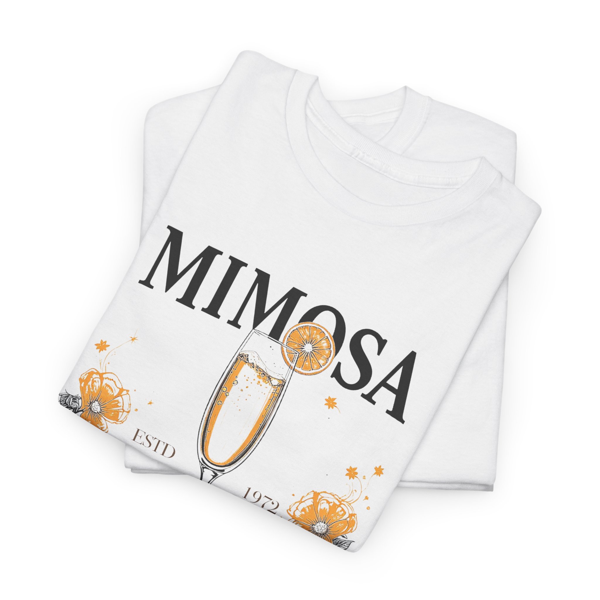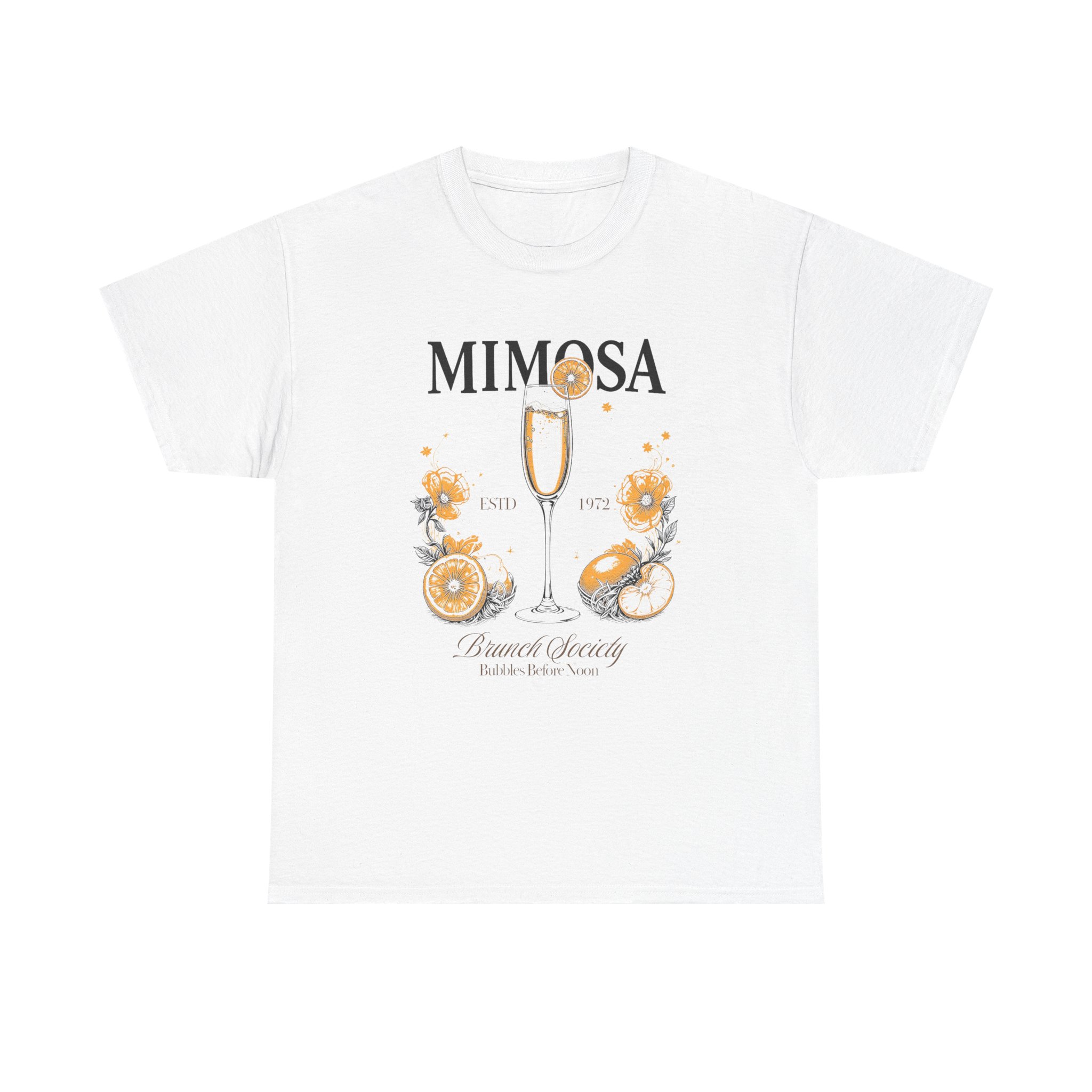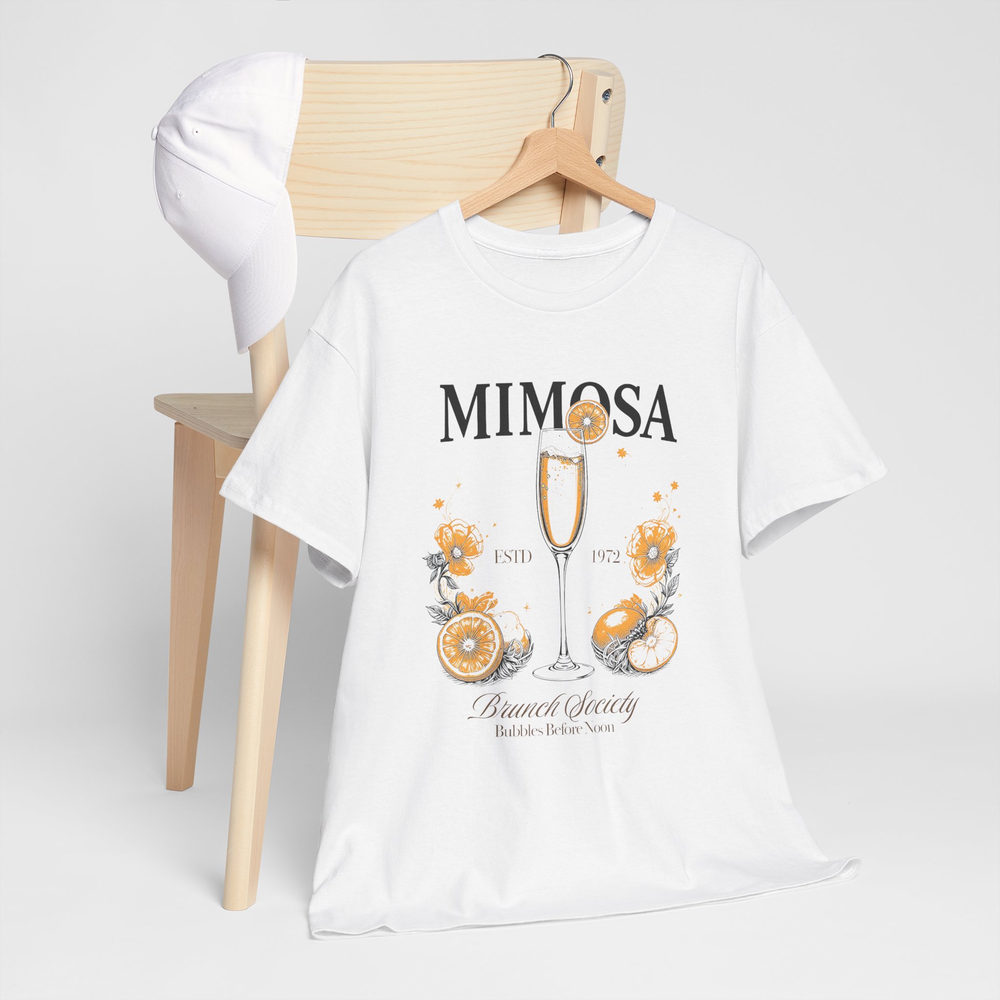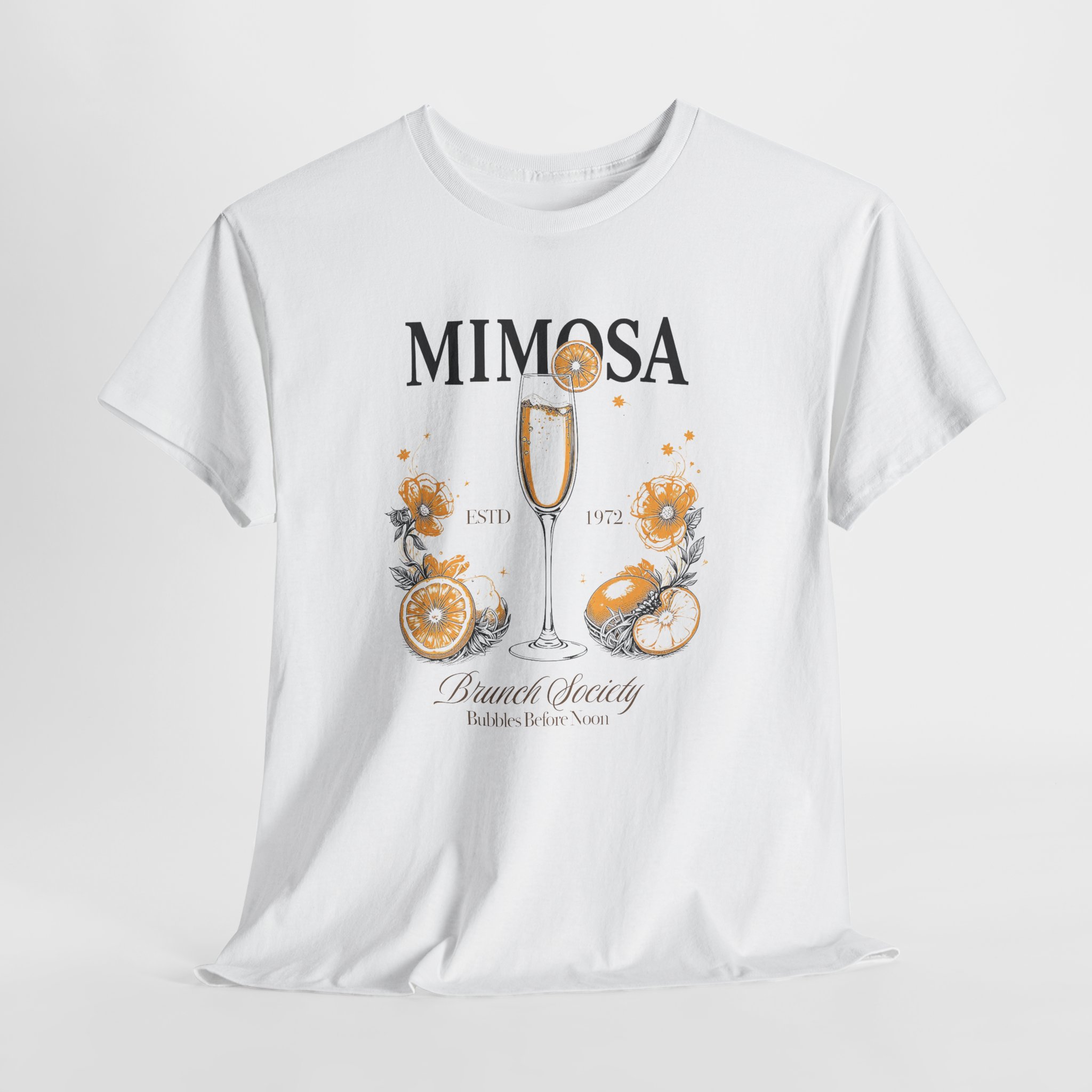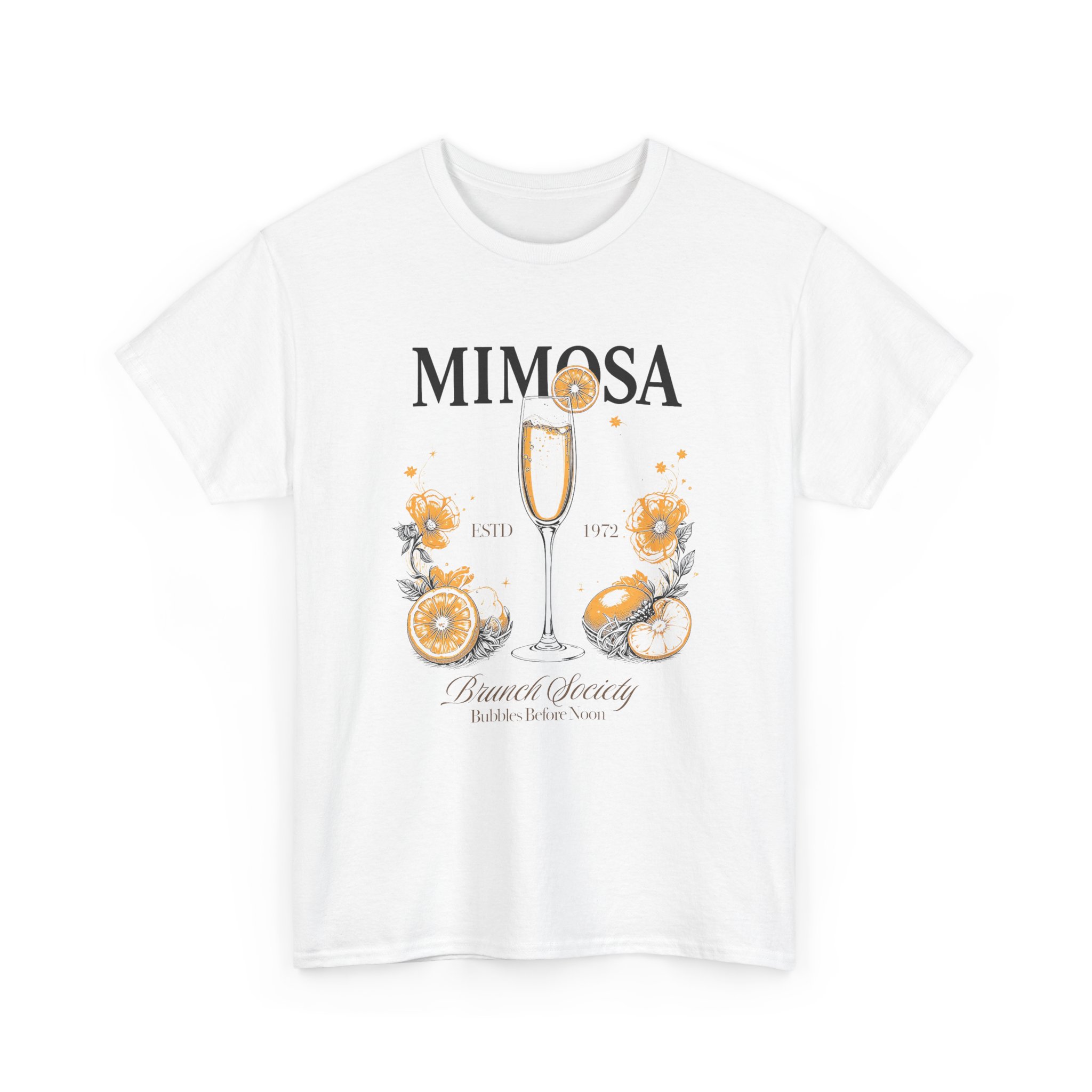 Soft, casual, and charming — this tee celebrates slow brunches and sunlit toasts. A delicate illustration of a mimosa flute surrounded by citrus blooms and pastries sits at the chest in warm golds and creams. The relaxed crew silhouette and medium-weight cotton feel like an easy Sunday: breathable, slightly structured, and built to hold its shape through washes. Wear it with high-waisted jeans, linen shorts, or a cozy cardigan while you linger over coffee and conversation.