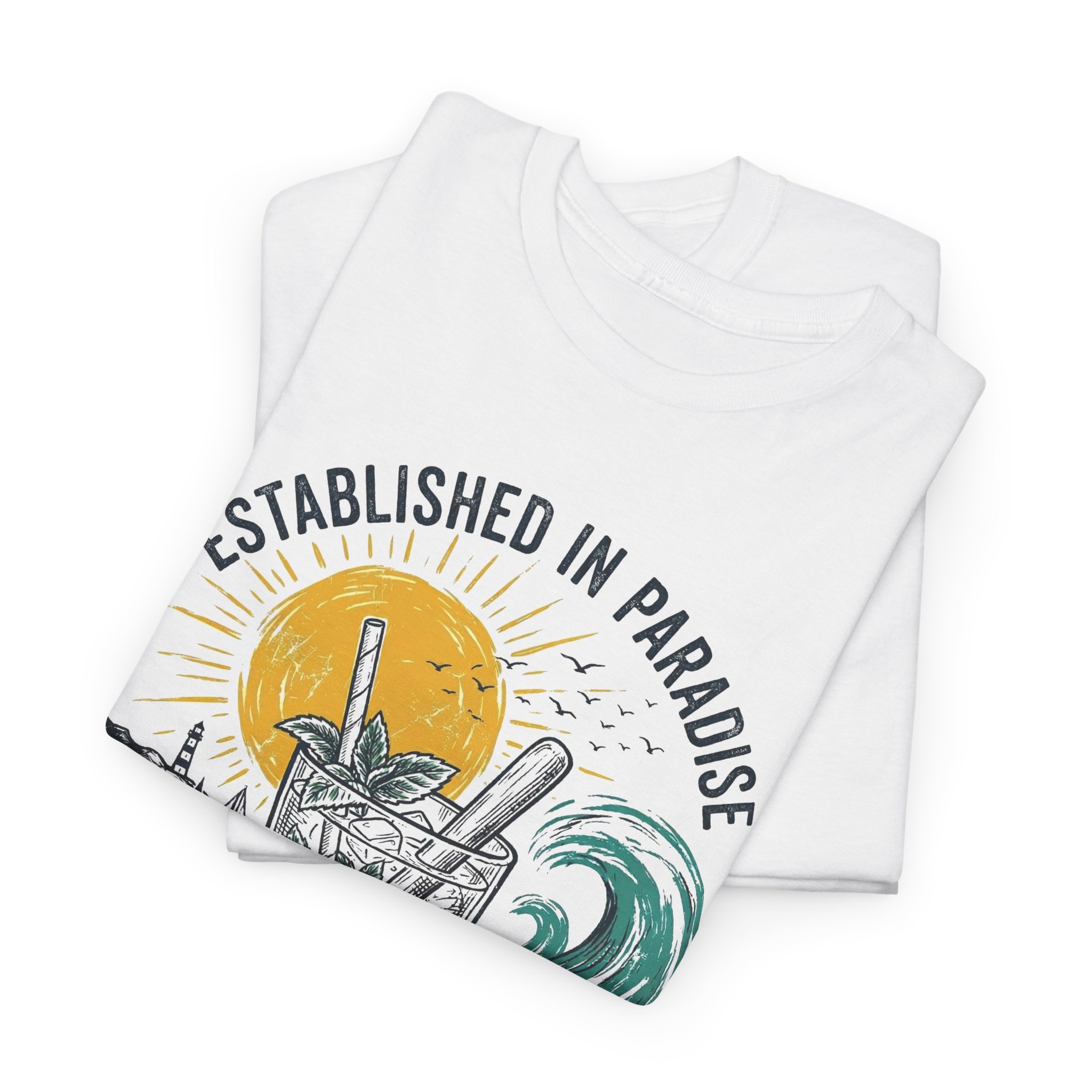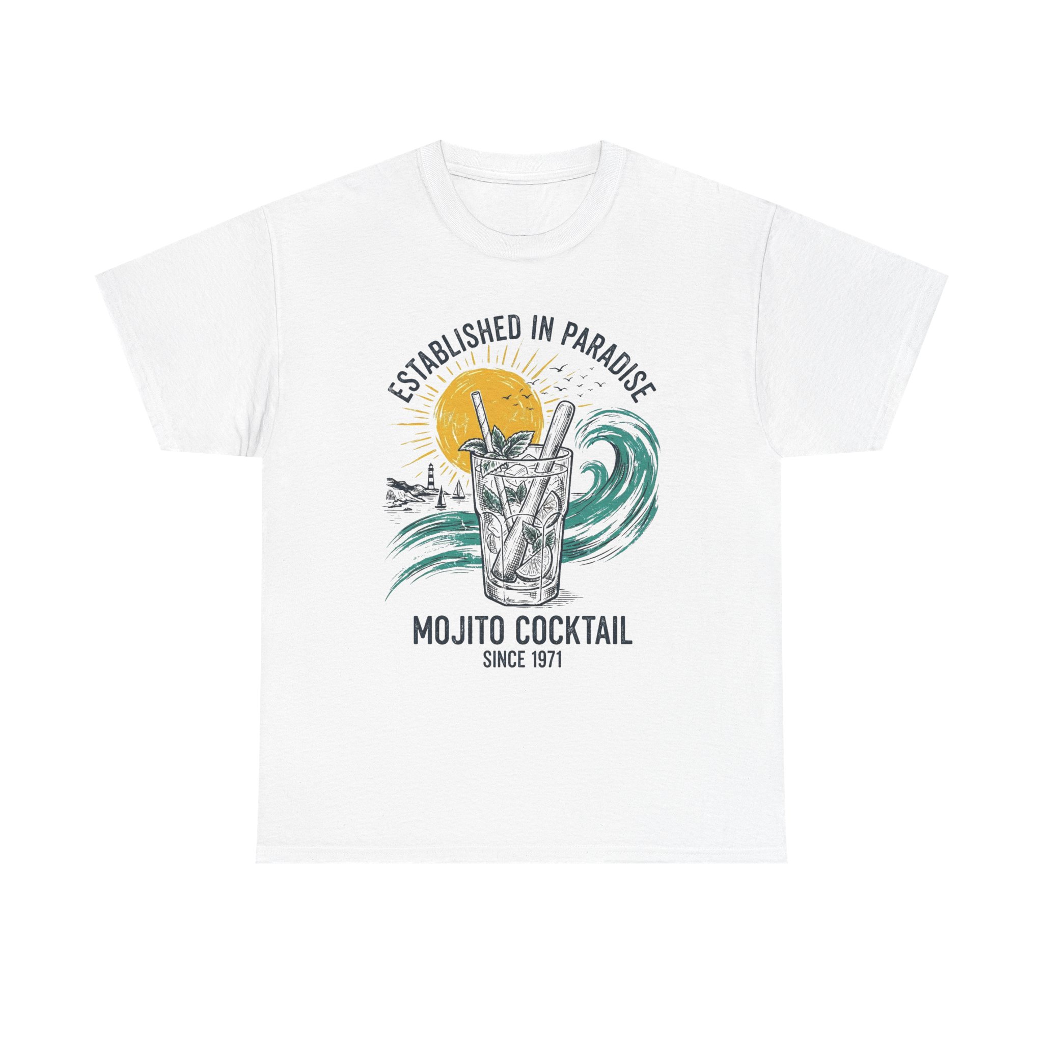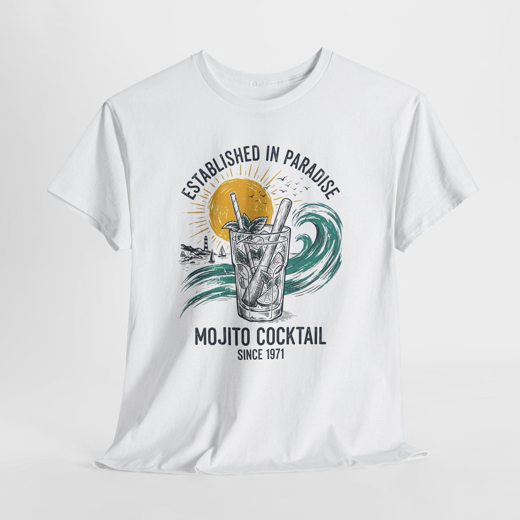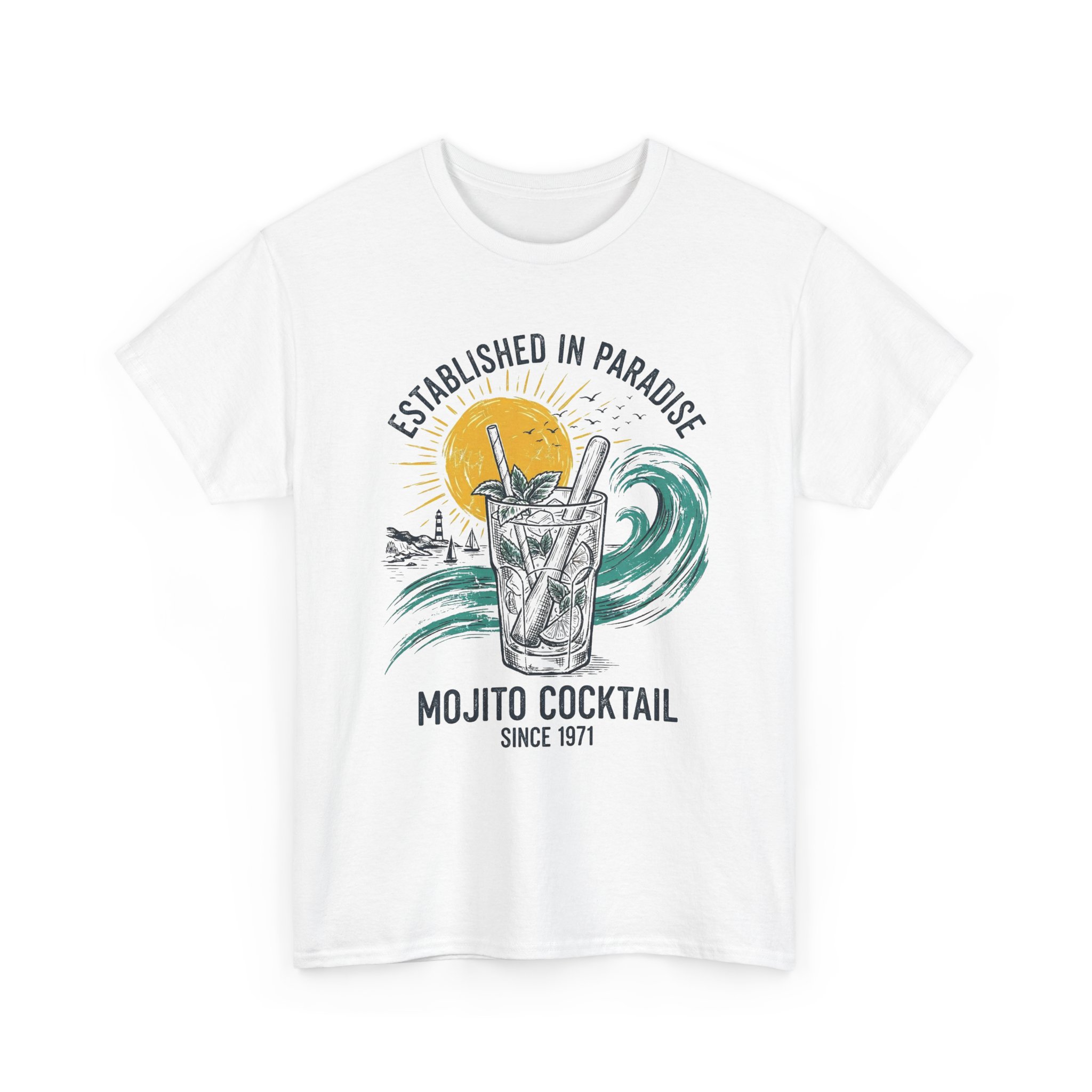 This lightweight cotton tee carries a relaxed, sun-soaked vibe — a hand-drawn mojito illustration, rolling wave strokes, and a warm sunset behind the glass. Wear it when the day is slow and the horizon calls: it sits easy over boardshorts at the beach, layers under a linen shirt for an evening bar by the marina, or folds into a weekend bag for a coastal road trip. The soft, breathable fabric and classic crewneck keep the focus on comfort so the design feels like a natural part of your laid-back routine. It’s made to age gently: the print technique preserves detail while the medium-weight cotton holds its shape, giving you a tee that looks lived-in and loved after every wash.