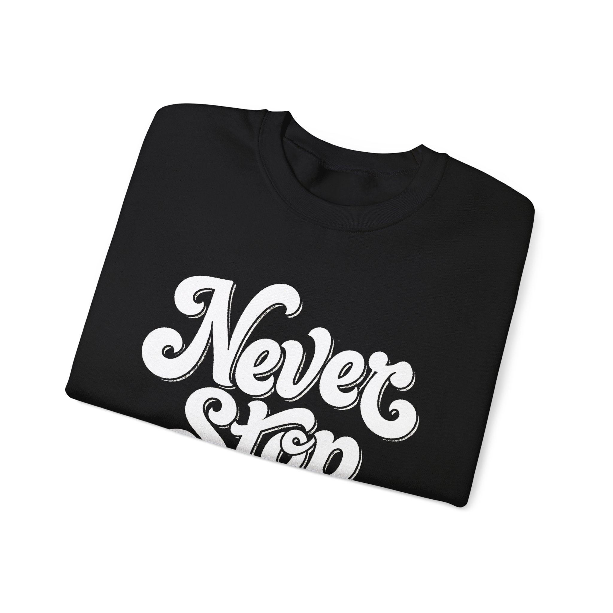Slip into a sweatshirt that quietly speaks of grit and steady hustle. The bold hand-lettered “Never Stop” embroidery sits crisp against a deep black background — a simple, confident reminder you can wear like armor on early mornings, late-night runs, or those in-between days when motivation needs a nudge. The medium-heavy cotton-poly blend feels warm without weight, and the ribbed collar and reinforced seams keep the shape through repeat wear. It’s the kind of crew you grab for studio sessions, coffee-fueled work sprints, or slow weekend walks—comfort that keeps pace with whatever you’re building.