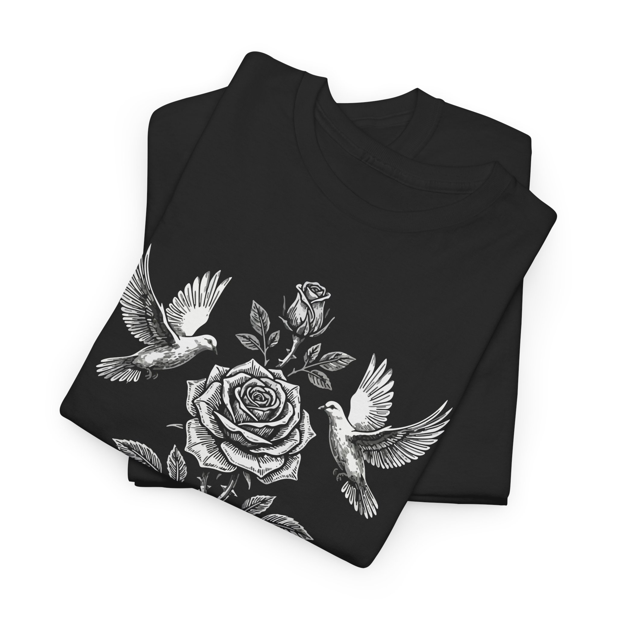 This black crewneck tee carries a quiet, rebellious spirit — a grayscale rose centerpiece flanked by two doves, with vintage gothic lettering that reads “rebellion.” The design blends botanical softness with punk attitude: delicate petals and leaves rendered in intricate monochrome shading sit above distressed, old-English type and subtle iconography. It wears like a statement without shouting — comfortable, sturdy cotton with a classic cut that layers easily under jackets or stands alone as the focal piece. Put it on when you want an everyday look that hints at resistance, romance, and the kind of nostalgia that still feels alive.