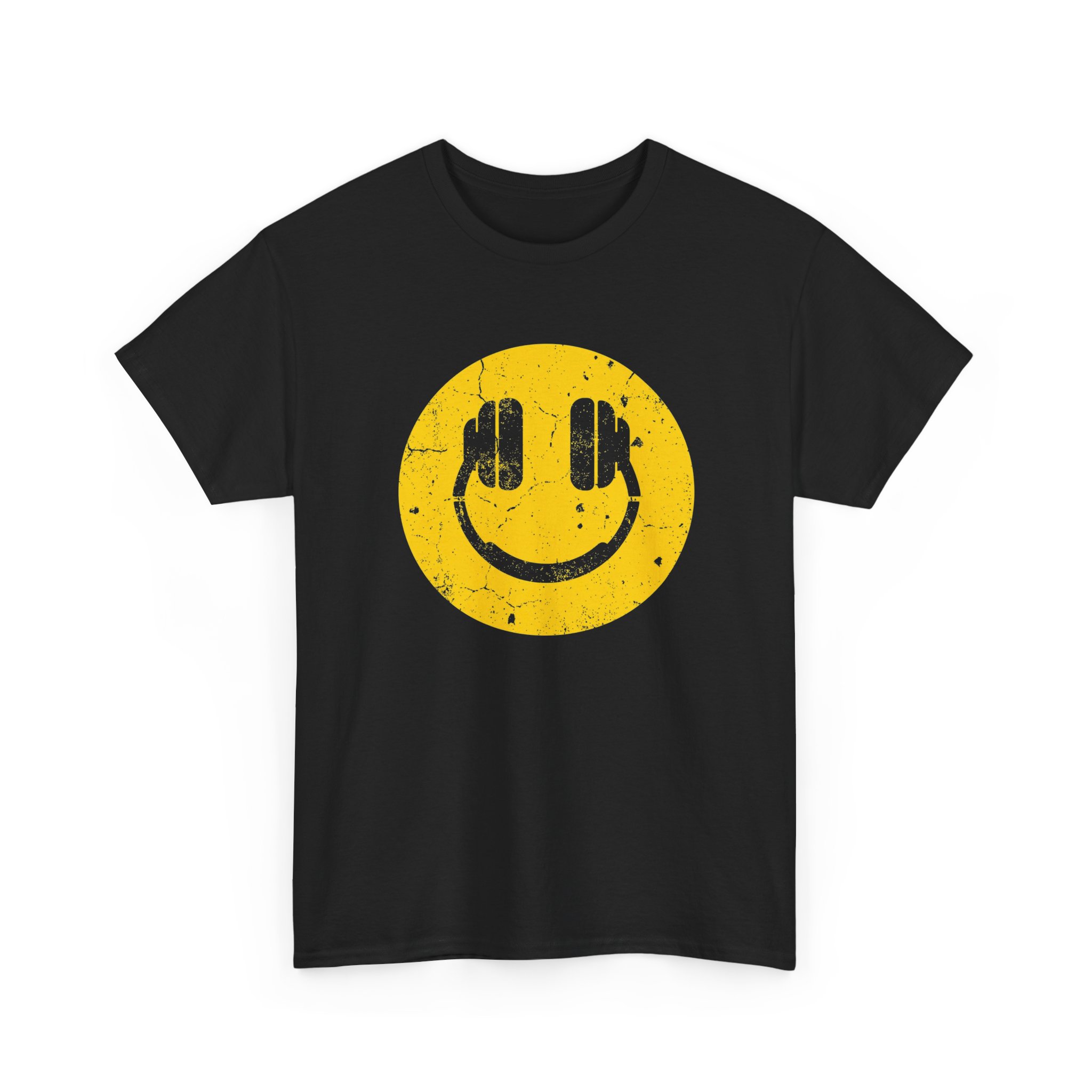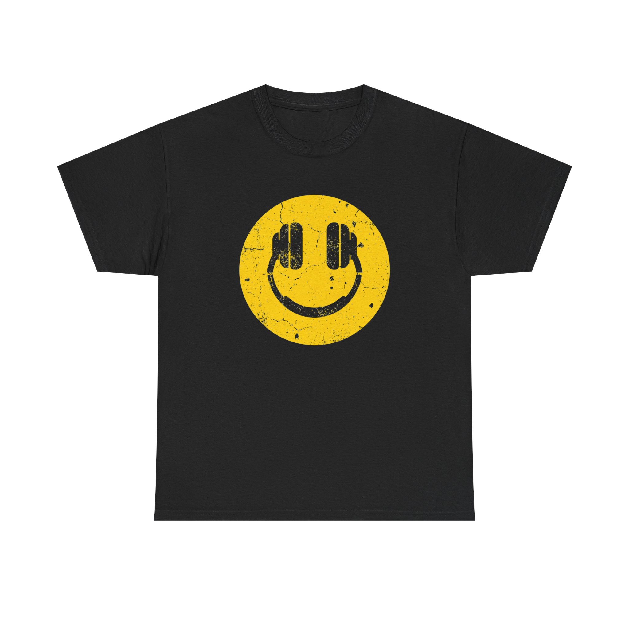 A vintage-inspired tee that wears like an old favorite from the first day. The soft, mid-weight cotton holds a distressed yellow smiley face—headphones formed by bold bars—so the design reads like a music-lover’s stamp of approval. Cut with a relaxed, classic fit and a crew neckline, this shirt sits comfortably for long sets, late nights, or weekend hangs. The simple black background makes the graphic pop while the subtle weathered texture gives it lived-in character. It’s the kind of shirt you reach for when you want effortless cool and a little nostalgia in your rotation.
