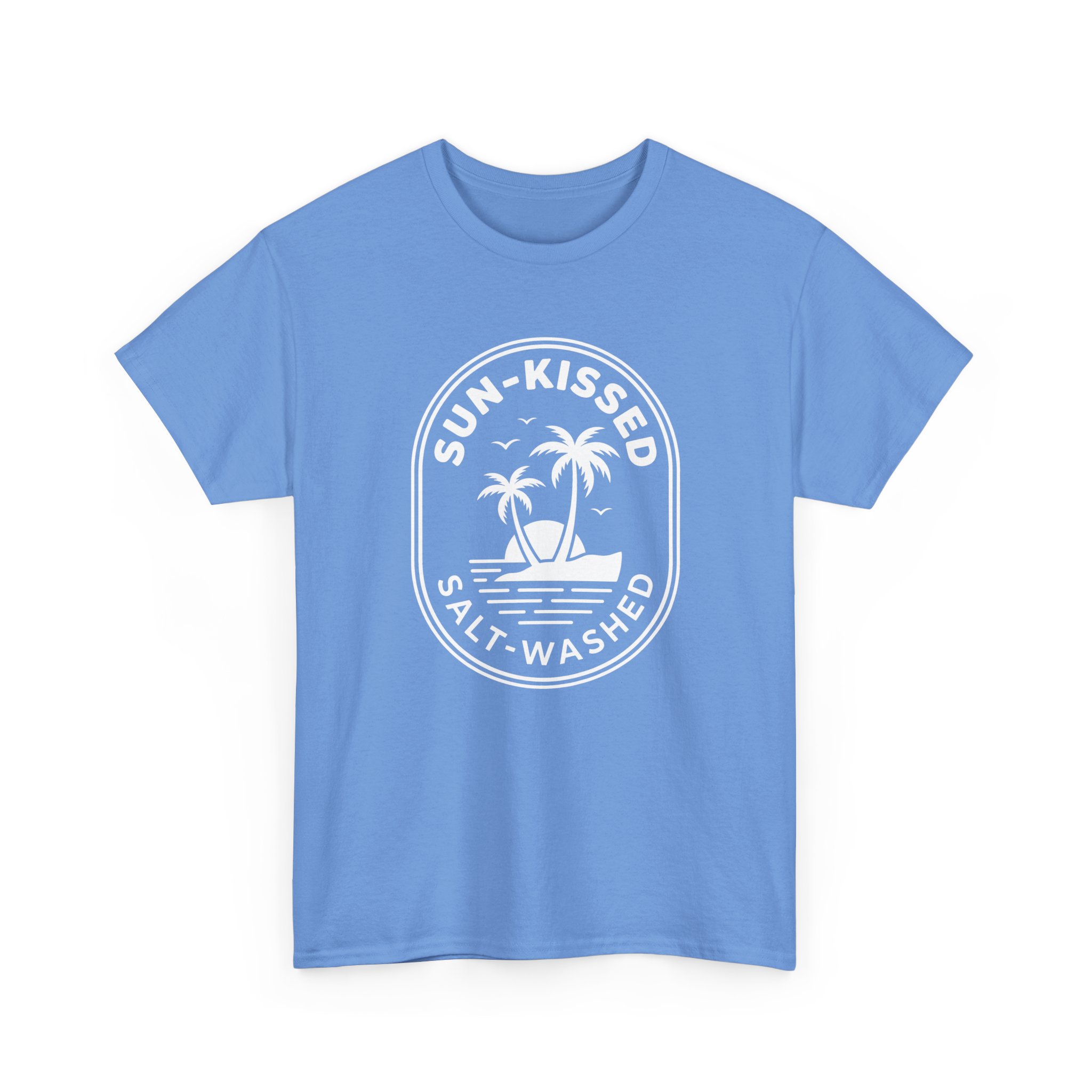 Sun-washed afternoons and barefoot mornings captured in a soft crew tee. This relaxed-fit cotton shirt carries a vintage-style badge print — palm trees, a small sail, and the words “Sun-Kissed / Salt-Washed” — that reads like a postcard from a slow beach day. The medium-weight fabric holds shape while feeling breathable; the tear-away label and ribbed collar keep comfort at the forefront. Wear it for long drives to the coast, slow coffee on a salty porch, or paired with cutoff shorts for a low-key summer night. It’s for people who collect light, salt air, and easy rhythms.