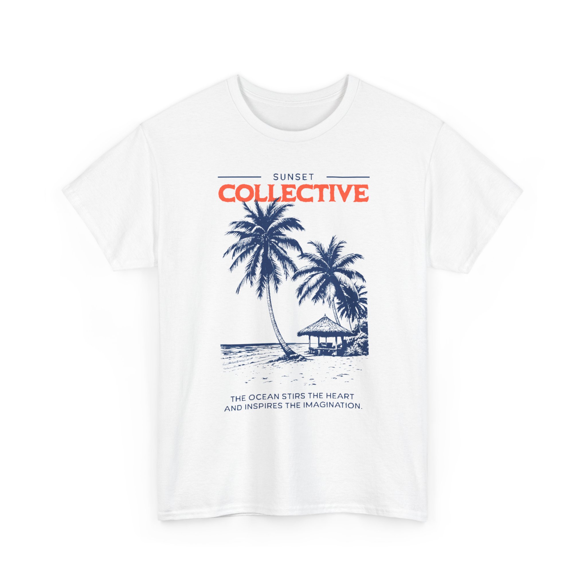 Lightweight, breathable, and built for easy days by the water — this classic tee carries a calm, sun-washed vibe. A soft white canvas showcases a vintage coastal print: skinny navy palm silhouettes, a low-slung beach hut, and a warm coral headline that reads “COLLECTIVE.” The composition feels like late-afternoon light on sand: unhurried, salty, and quietly nostalgic. Wear it on slow drives to the shore, evening bonfires, or when you need a reminder of open horizons. The roomy cut and crew neckline layer neatly under an overshirt or stand alone with your favorite shorts.
