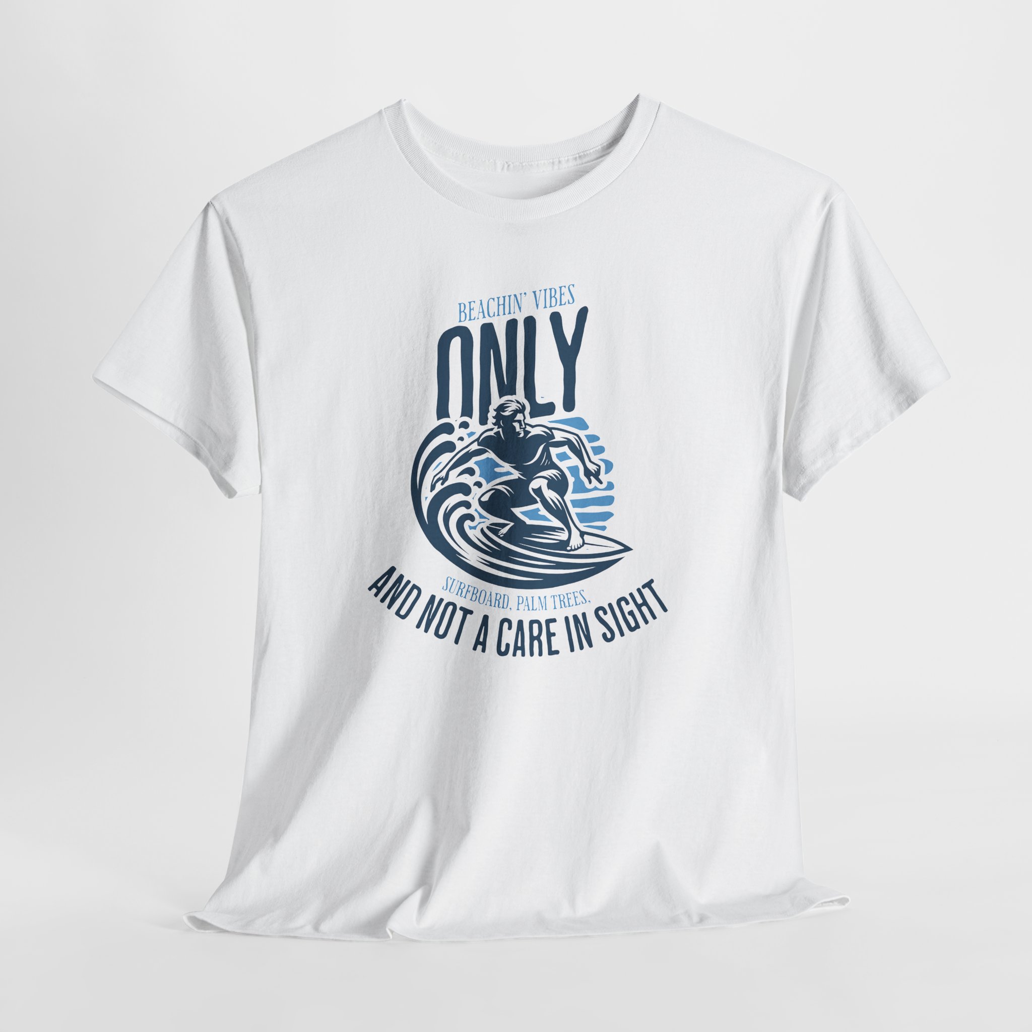 A soft, breathable cotton tee printed with a vintage surf-inspired graphic — a lone rider cutting through stylized waves beneath the phrase “Only and not a care in sight.” The shirt feels lived-in from the first wear: medium-weight fabric that holds its shape thanks to a ribbed collar and shoulder tape, with a relaxed classic fit that layers easily over boardshorts or under a light jacket. Subtle black flecks appear on Natural colorways for an authentic, organic look. Printed using crisp DTF and DTG methods so the seaside illustration stays detailed wash after wash. Ethically sourced cotton and OEKO-TEX certification make it a comfortable, dependable piece to reach for when you want an easy, salty-day vibe.