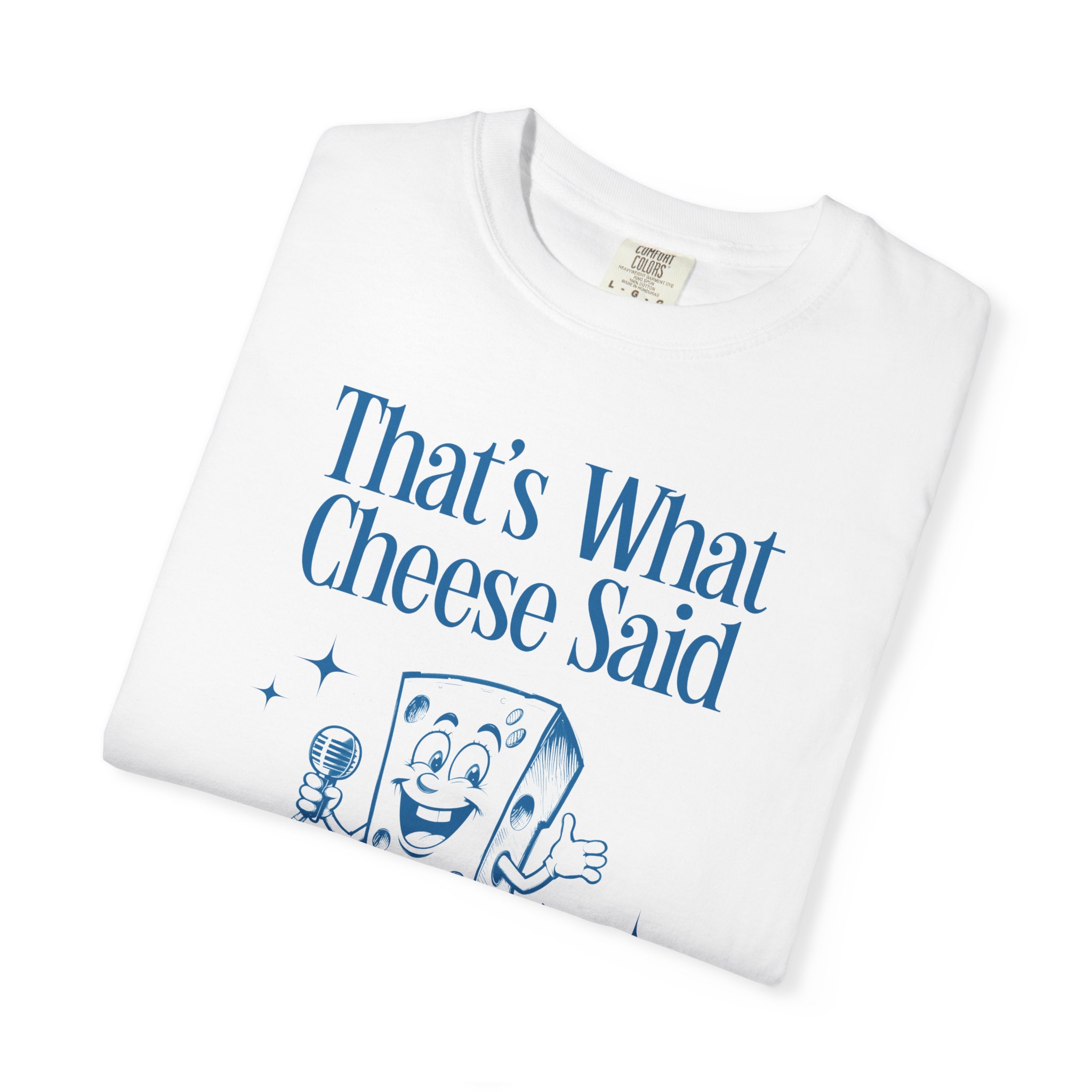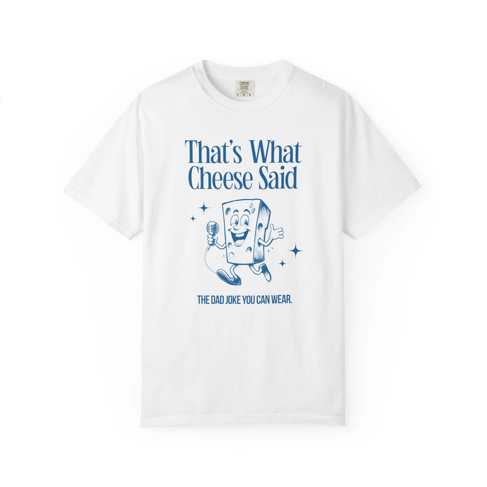 A relaxed, garment-dyed tee with a wink and a grin — this heavyweight cotton shirt wears a playful retro cartoon block of cheese and the headline “That’s What Cheese Said.” It feels lived-in from the first wear: soft, slightly faded color from the post-construction dye, and a roomy cut that drapes easily. Put it on for backyard barbecues, pun-filled family gatherings, or a casual day of errands when you want to spark a laugh without trying too hard. The simple single-color print and sewn-in label keep the vibe classic and low-key, while the sturdy double-needle stitching and tubular knit mean this shirt holds up through plenty of wears and washes.