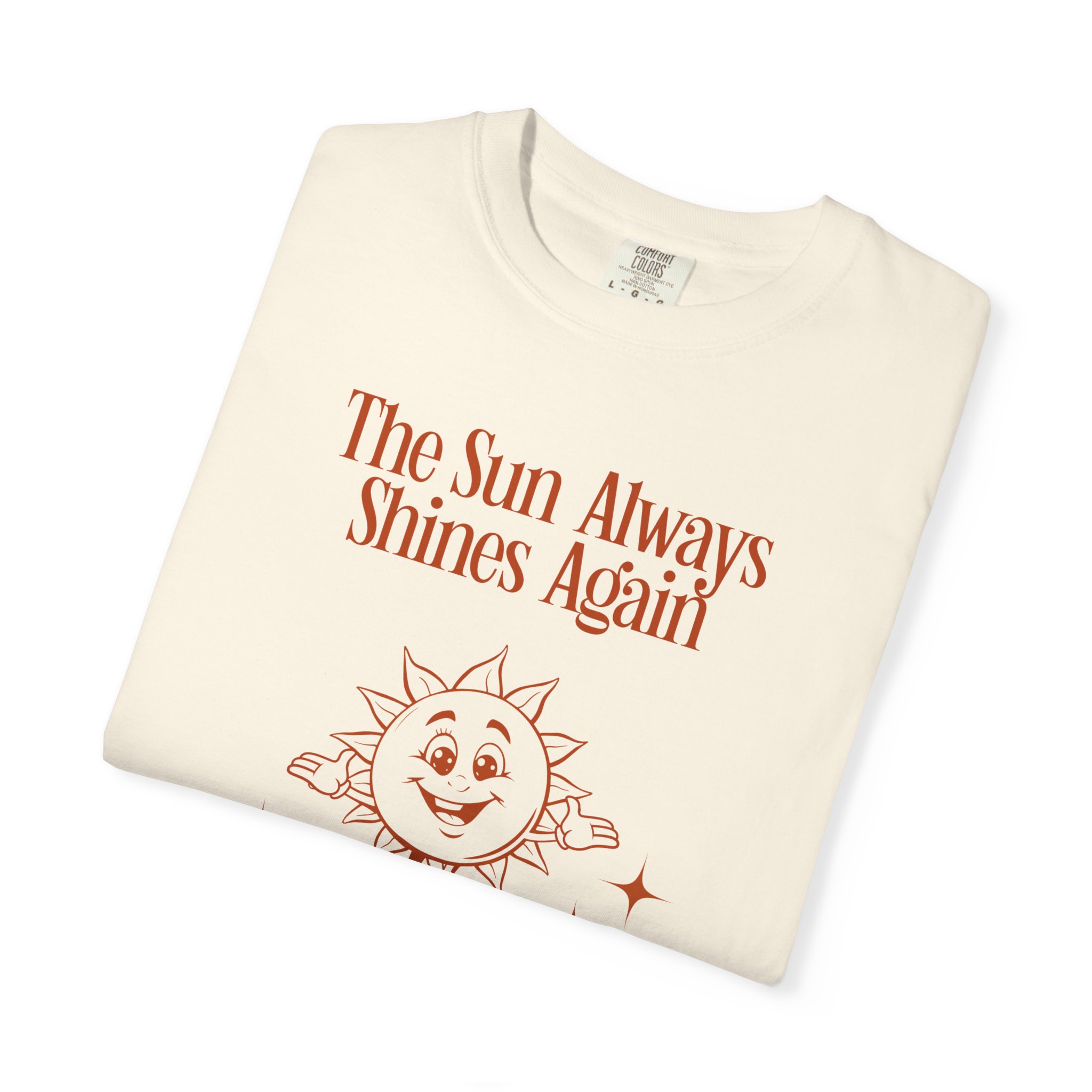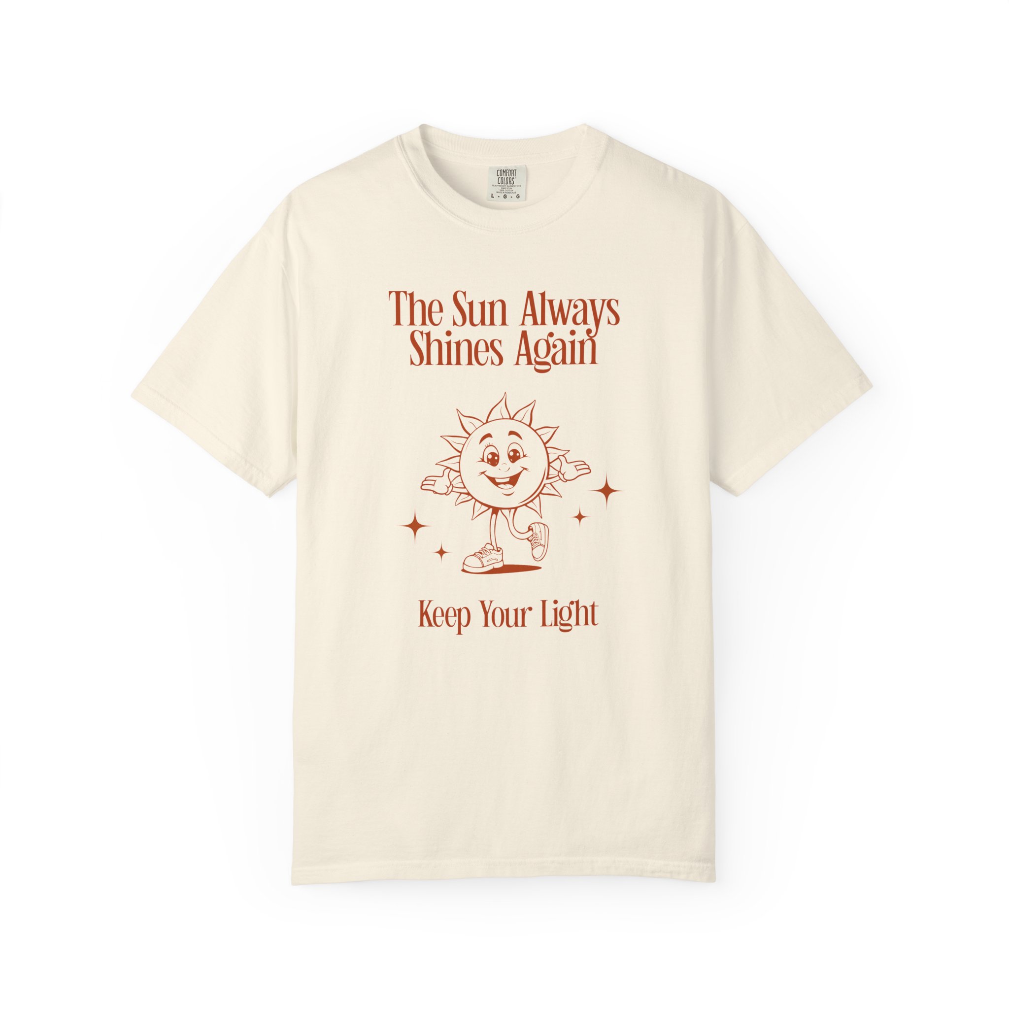 Soft, sun-warmed cotton with a gentle, retro-hearted design. This relaxed-fit tee carries a hand-drawn smiling sun and the reassurance “The Sun Always Shines Again — Keep Your Light.” Wear it on slow mornings, at cozy gatherings, or during walks when you need a quiet reminder to stay steady. The garment-dyed finish gives the color a lived-in softness and muted warmth that pairs with jeans, cardigans, or an oversized jacket. It settles comfortably on the shoulders and moves with you, offering a calm, optimistic accent to everyday outfits.