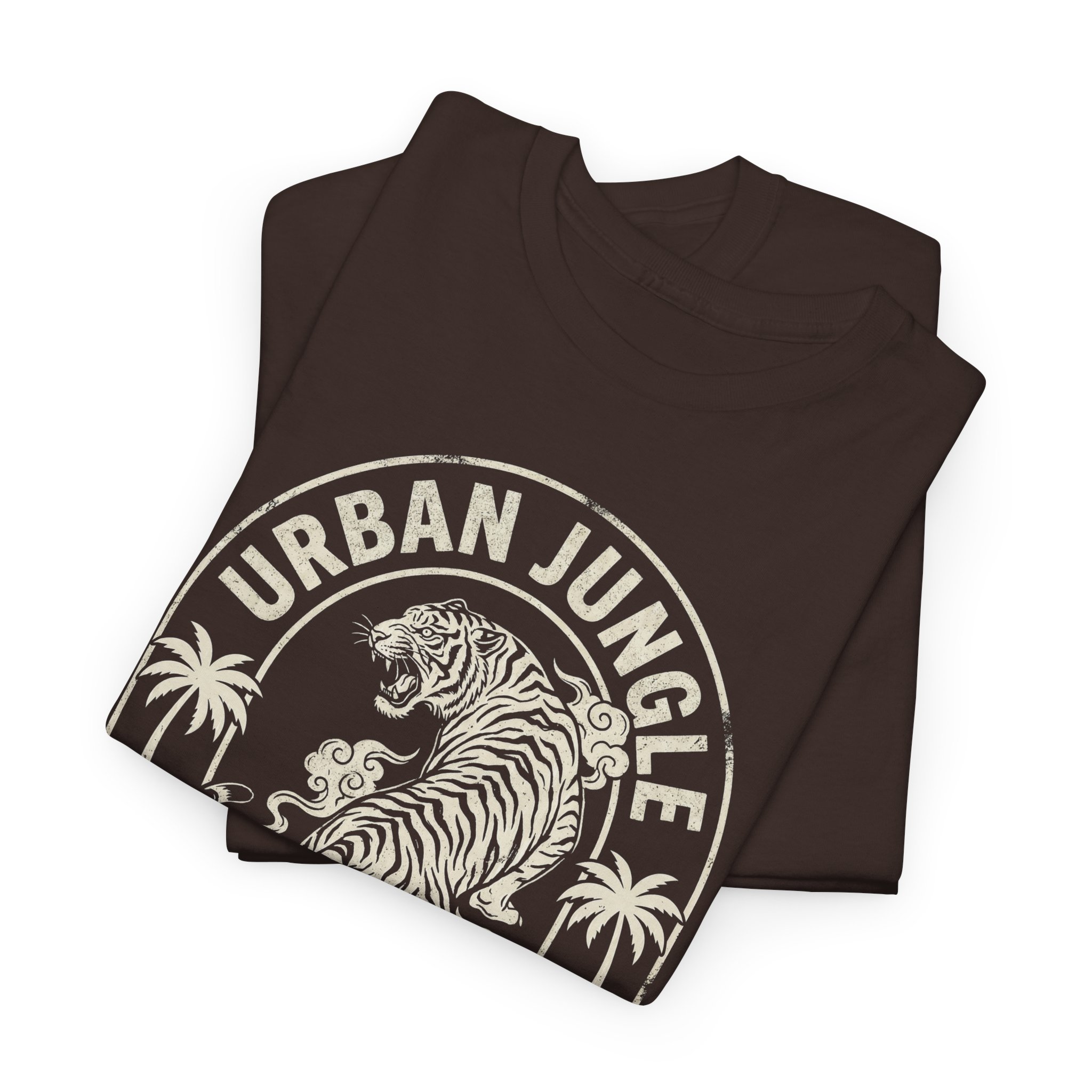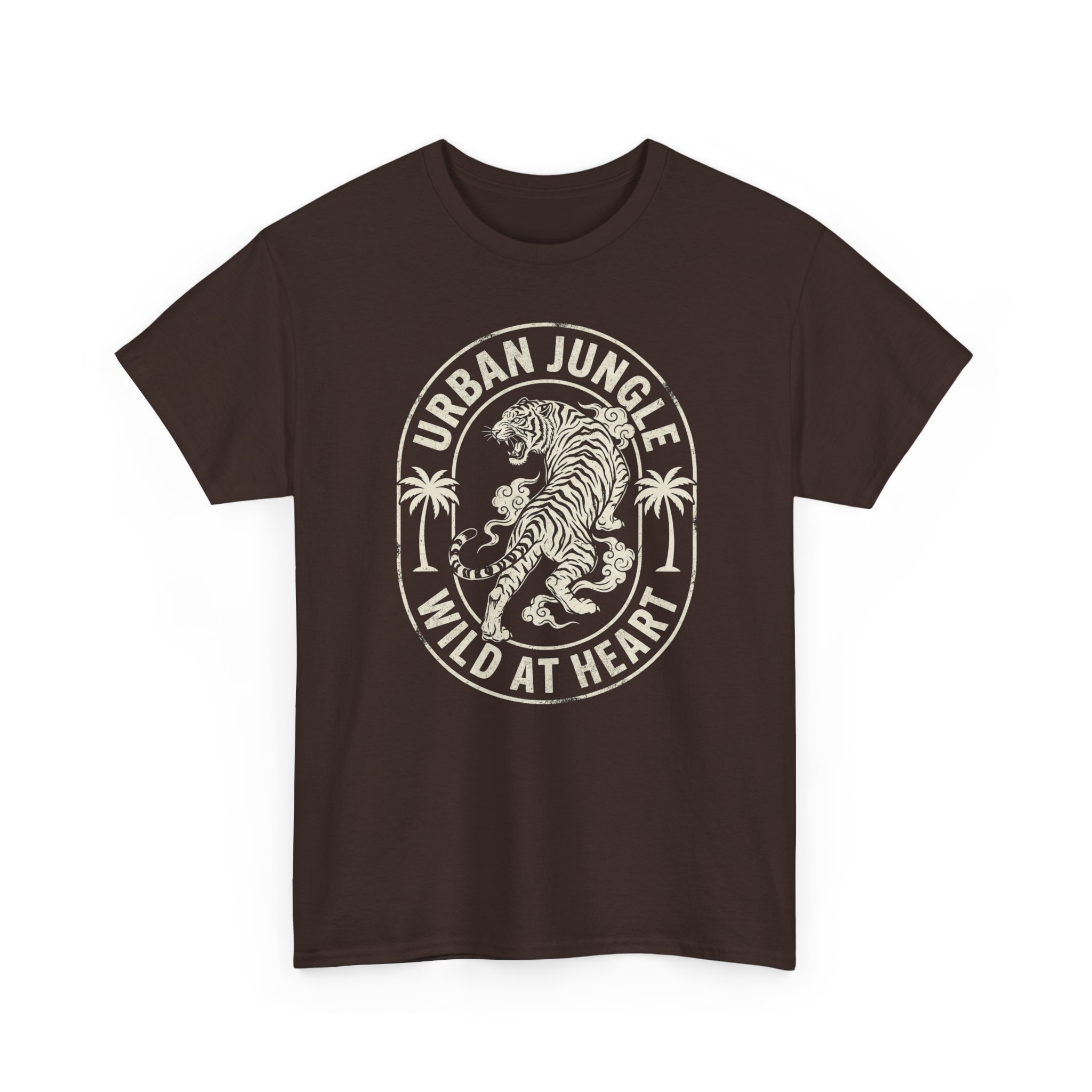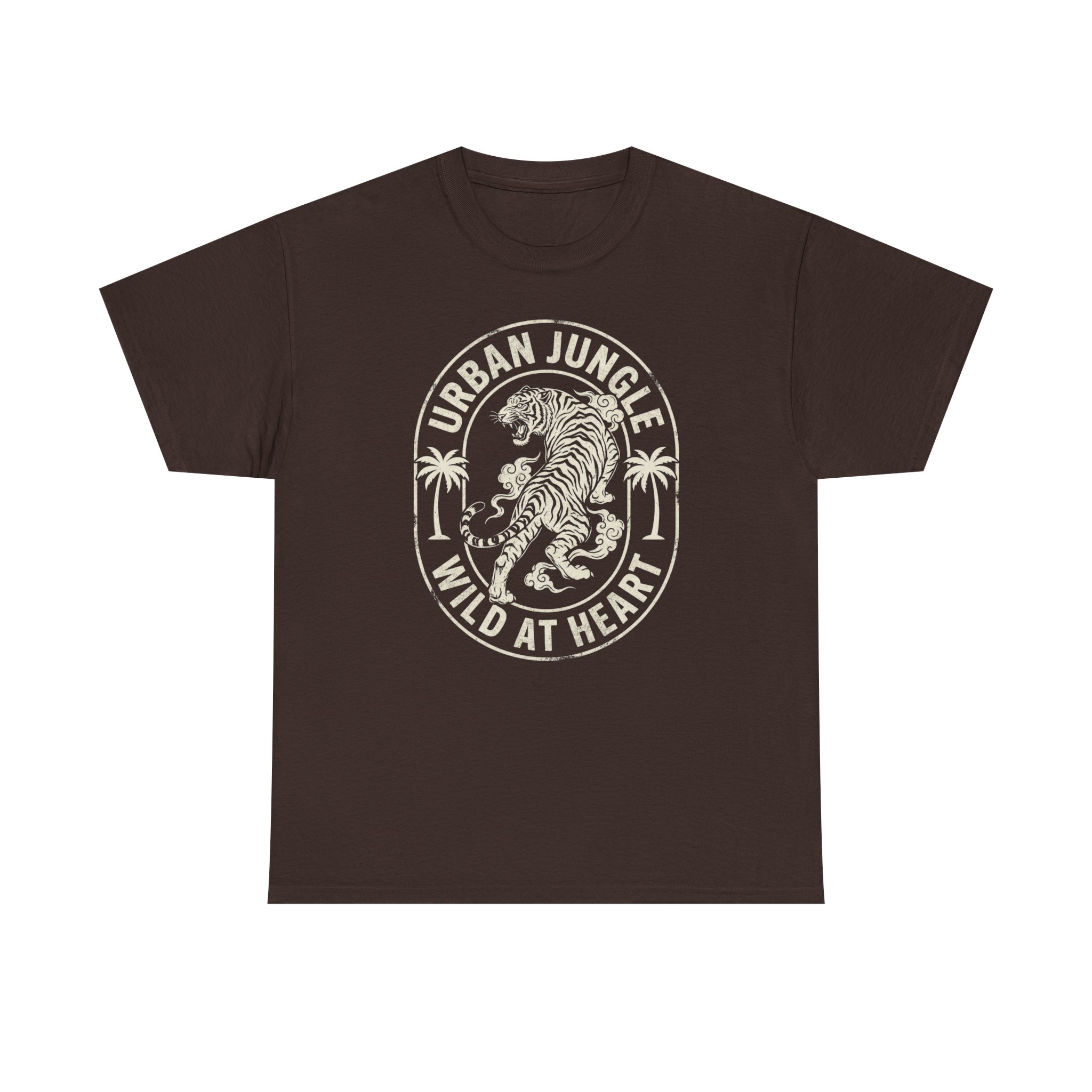 This tee brings a little wild into everyday life. Soft, sturdy cotton with a vintage-style tiger crest reads “Urban Jungle — Wild at Heart,” a faded-ink look that feels lived-in from the first wear. It sits with a relaxed, classic crew silhouette that layers easily under jackets or stands alone as a bold statement. Wear it on city walks, weekend coffee runs, or nights out when you want a touch of untamed energy without shouting for attention. The muted print and earthy shirt color create a low-key, adventurous vibe — familiar, honest, and ready for whatever urban trail you choose.