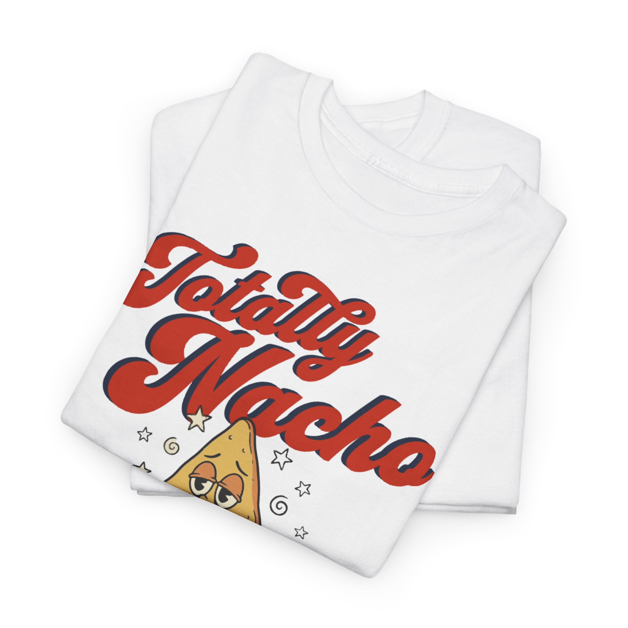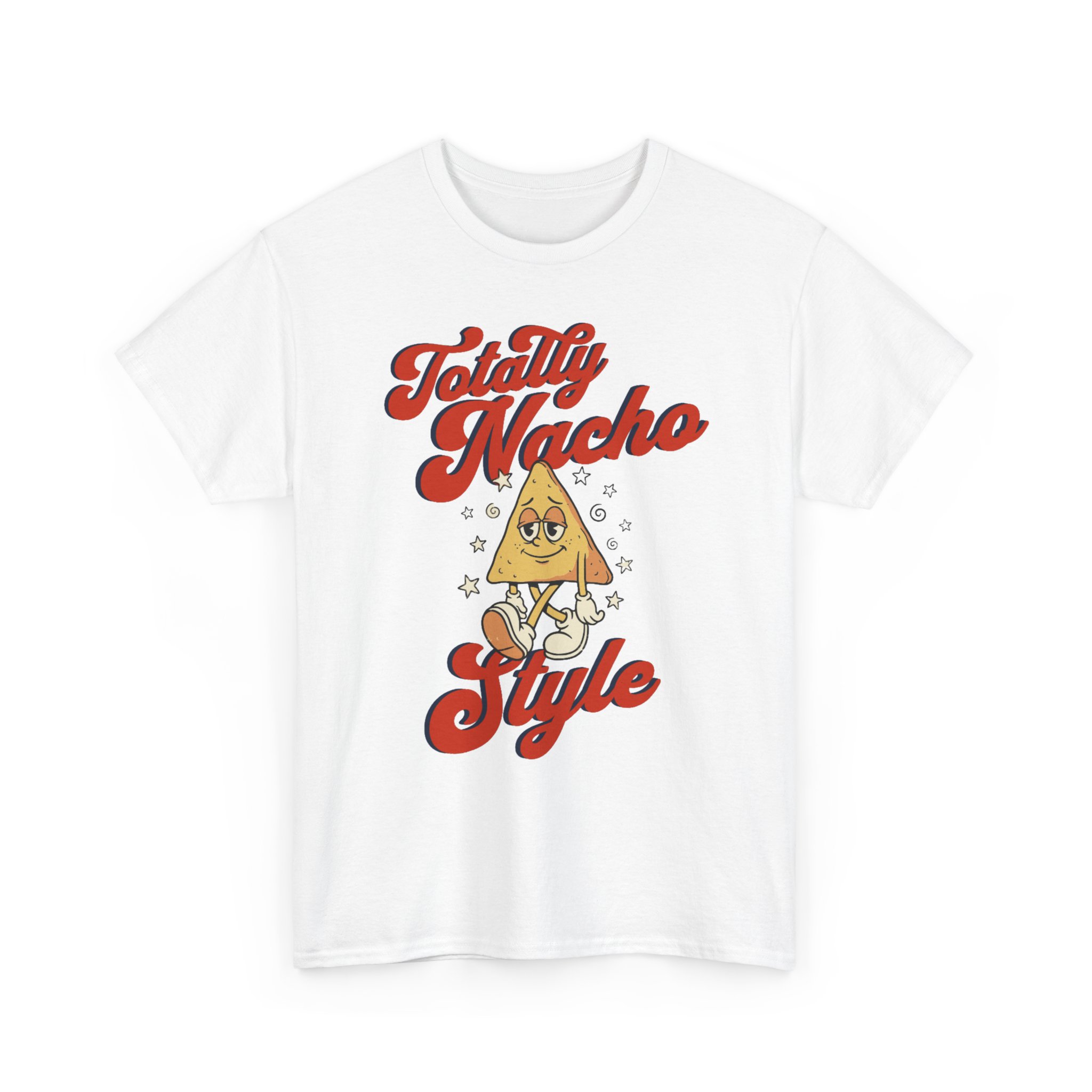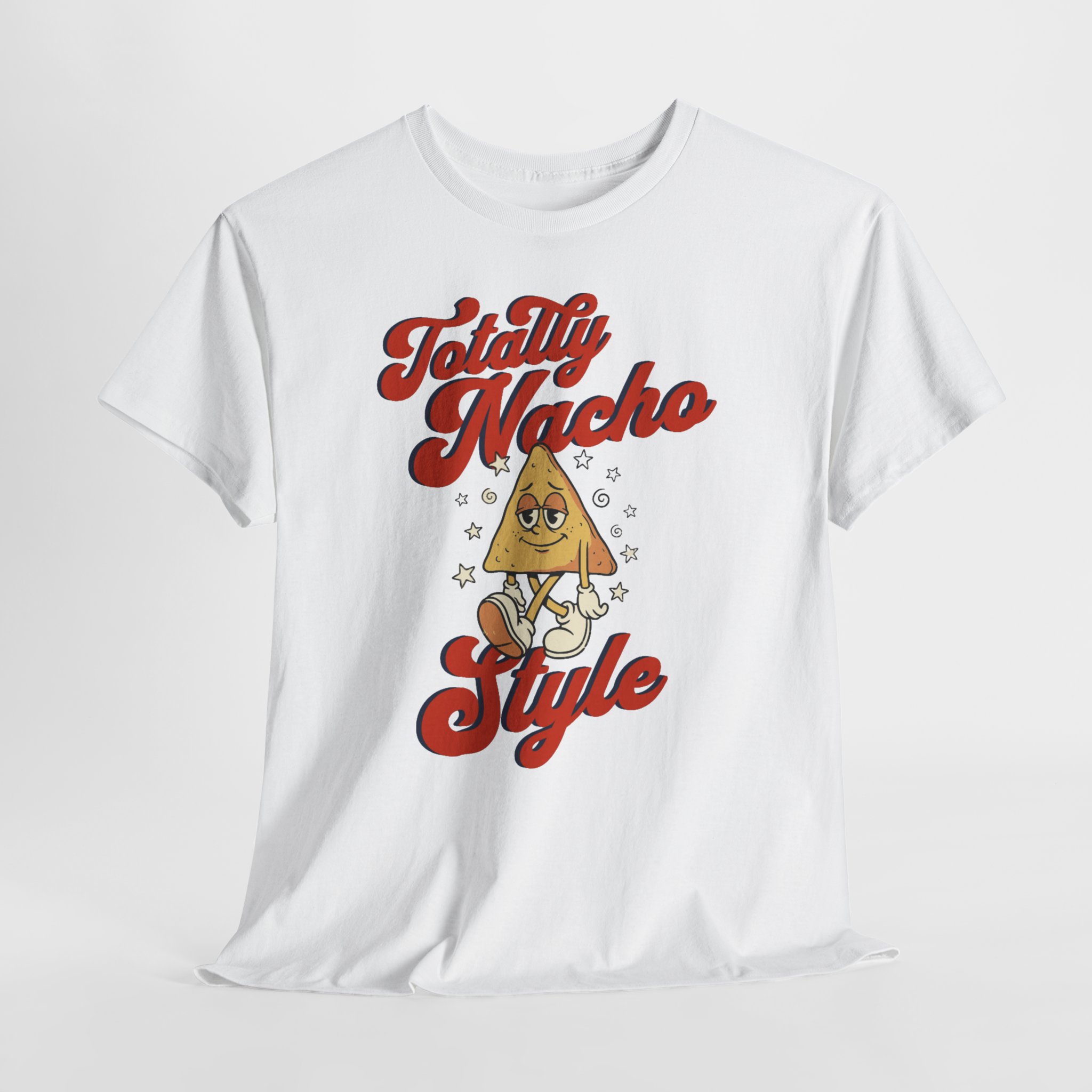 This soft, classic-fit tee brings a wink of playful nostalgia to everyday wear. A cheerful nacho character sits front-and-center, framed by retro script reading “Totally Nacho Style” in warm, vintage tones. Lightweight but durable 100% cotton holds the print with clarity and comfort — the ribbed collar and shoulder tape keep the shape through repeated wear. Wear it for casual hangouts, taco nights, or laid-back weekend strolls when you want to spark a smile and show off lighthearted personality.