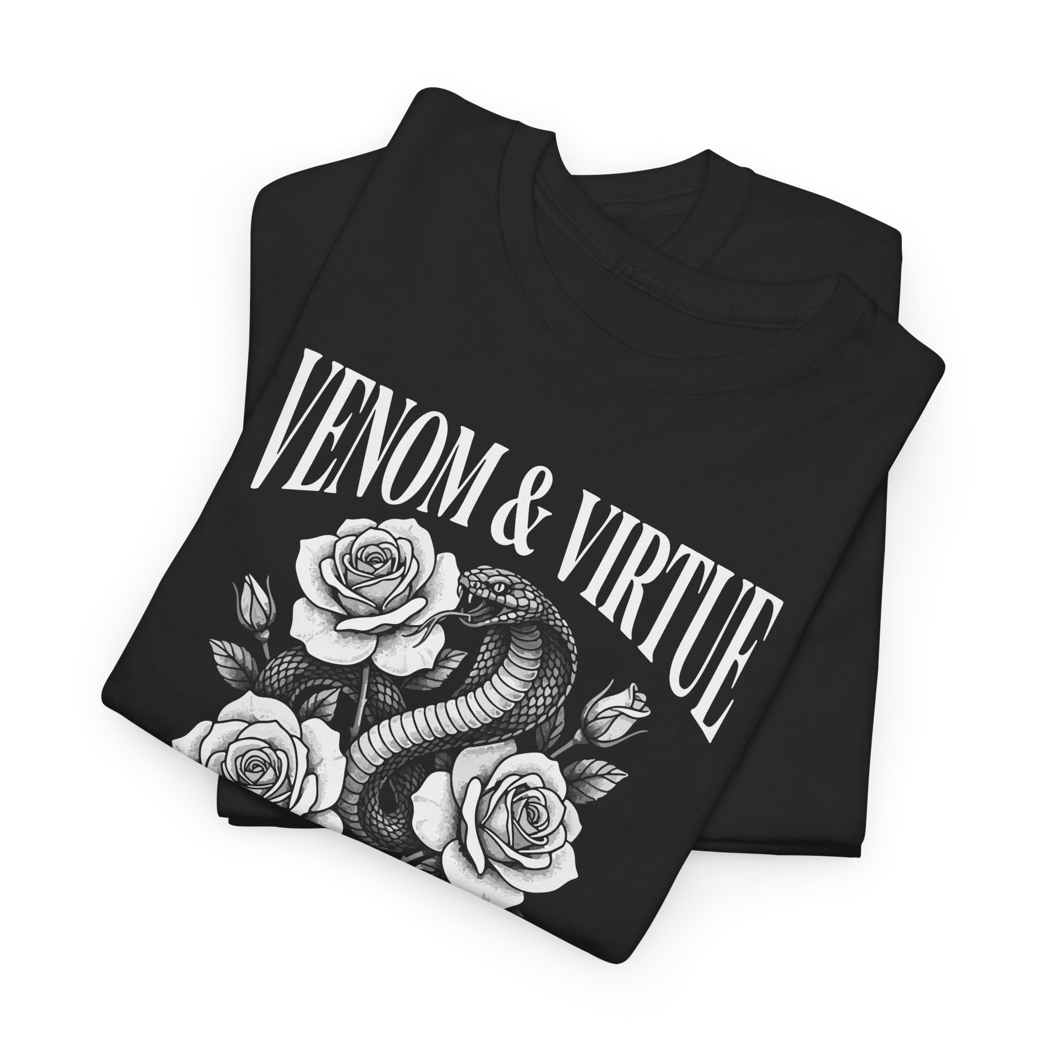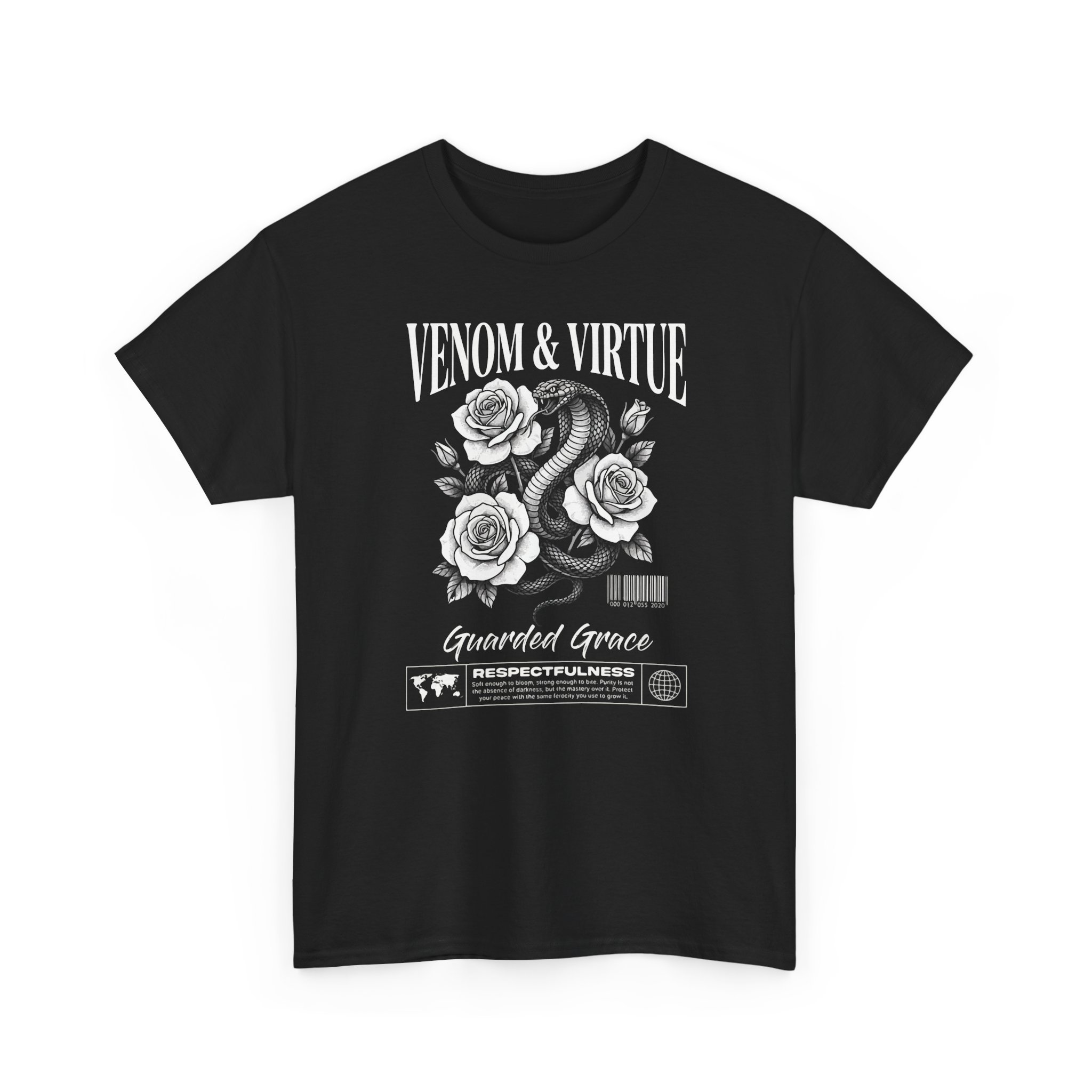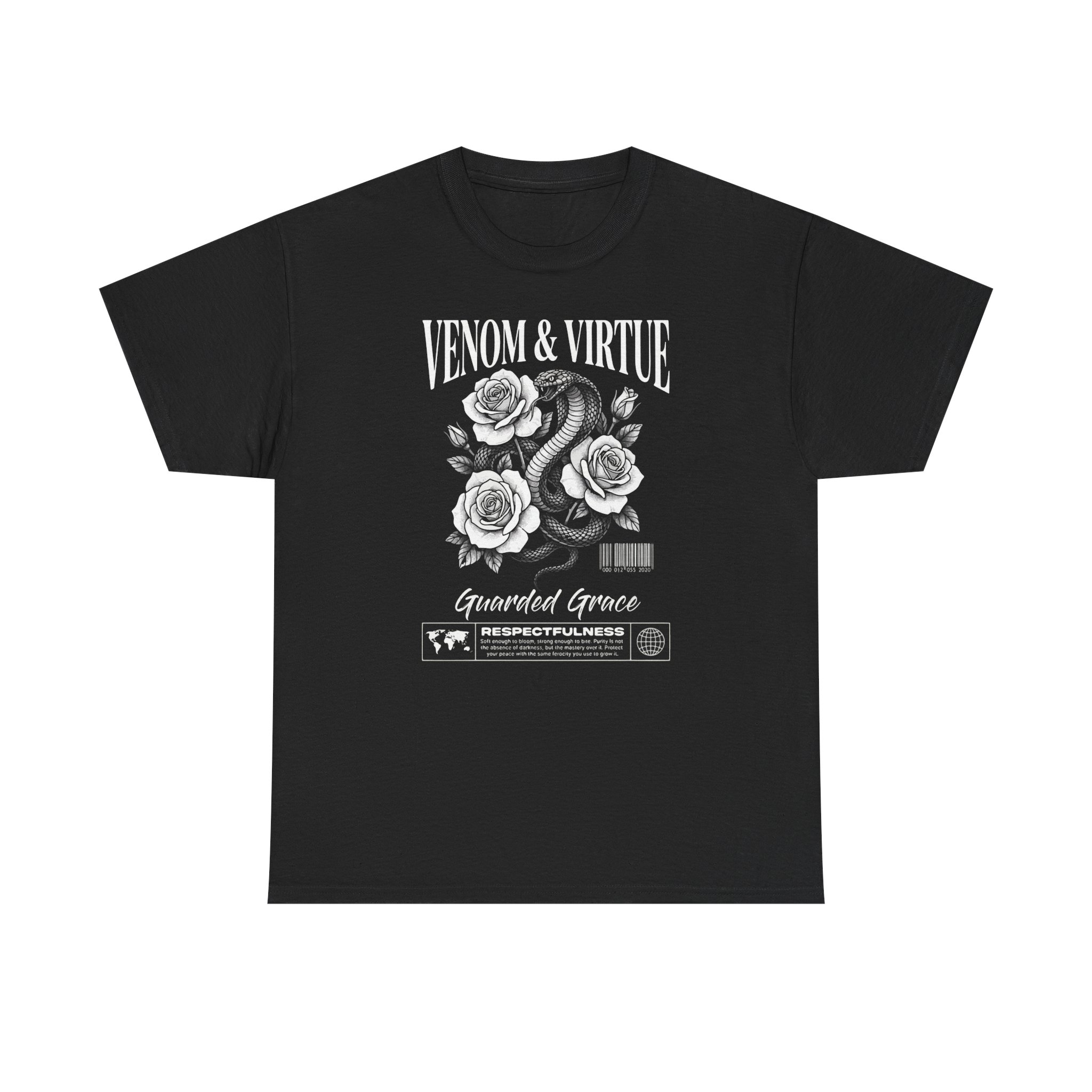 A bold black tee that wears like a statement. Soft, midweight cotton holds a high-contrast monochrome print: a coiled snake threaded through blooming roses, framed by vintage type and subtle label-style icons. The design reads like a quiet contradiction — danger and devotion — and sits centered on the chest so it reads from across a room. The shirt’s classic crew cut and relaxed fit make it easy to layer under a worn denim jacket or wear solo with high-waisted jeans. It settles comfortably against the skin and keeps its shape wash after wash, so the art stays sharp long after it becomes a favorite in your rotation. Wear it when you want to feel a little fierce and a little tender at the same time.