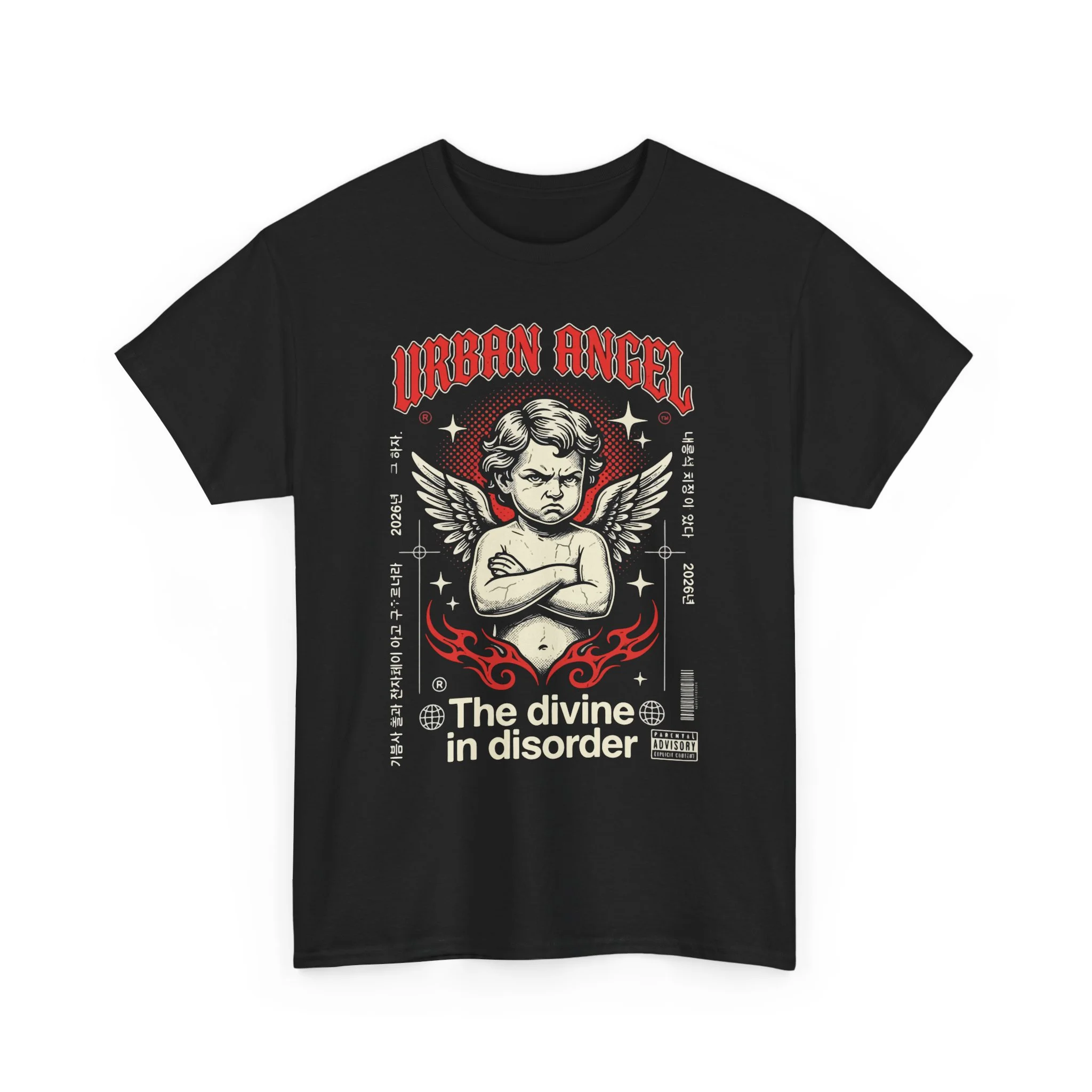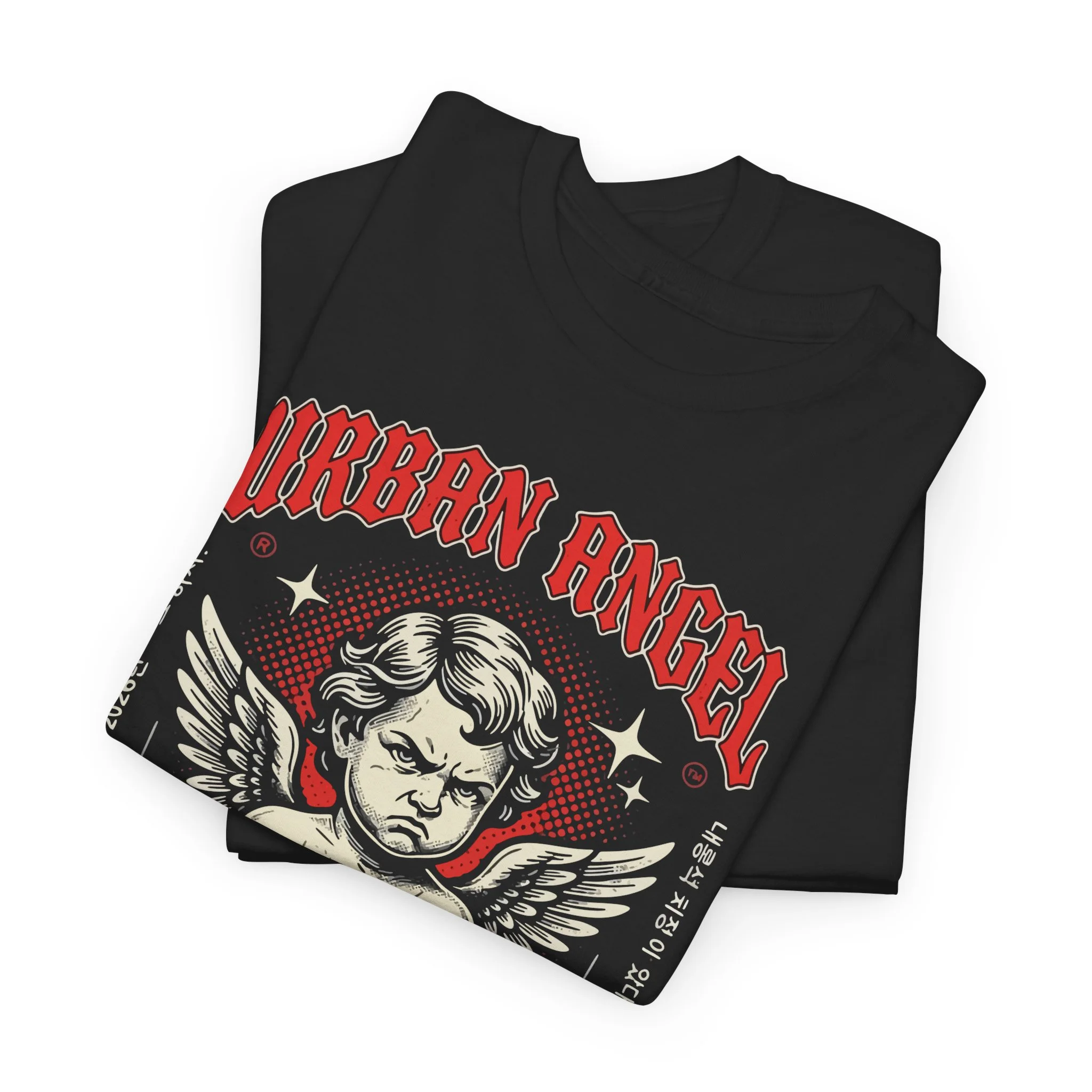 This bold tee wears attitude like a second skin. A vintage-styled cherub, wings folded and brow furrowed, sits amid gritty red flames and stark block text that reads “Urban Angel” and “The divine in disorder.” The design blends retro tattoo aesthetics with streetwise graphics — softened by the tee’s medium-weight cotton and classic crew neckline. It works as a daily statement piece: layer under a denim jacket, wear solo with black jeans, or let it anchor a moody, city-night outfit. The shirt feels lived-in from the first wear and holds its shape, while the detailed print stays sharp thanks to DTF and DTG techniques.