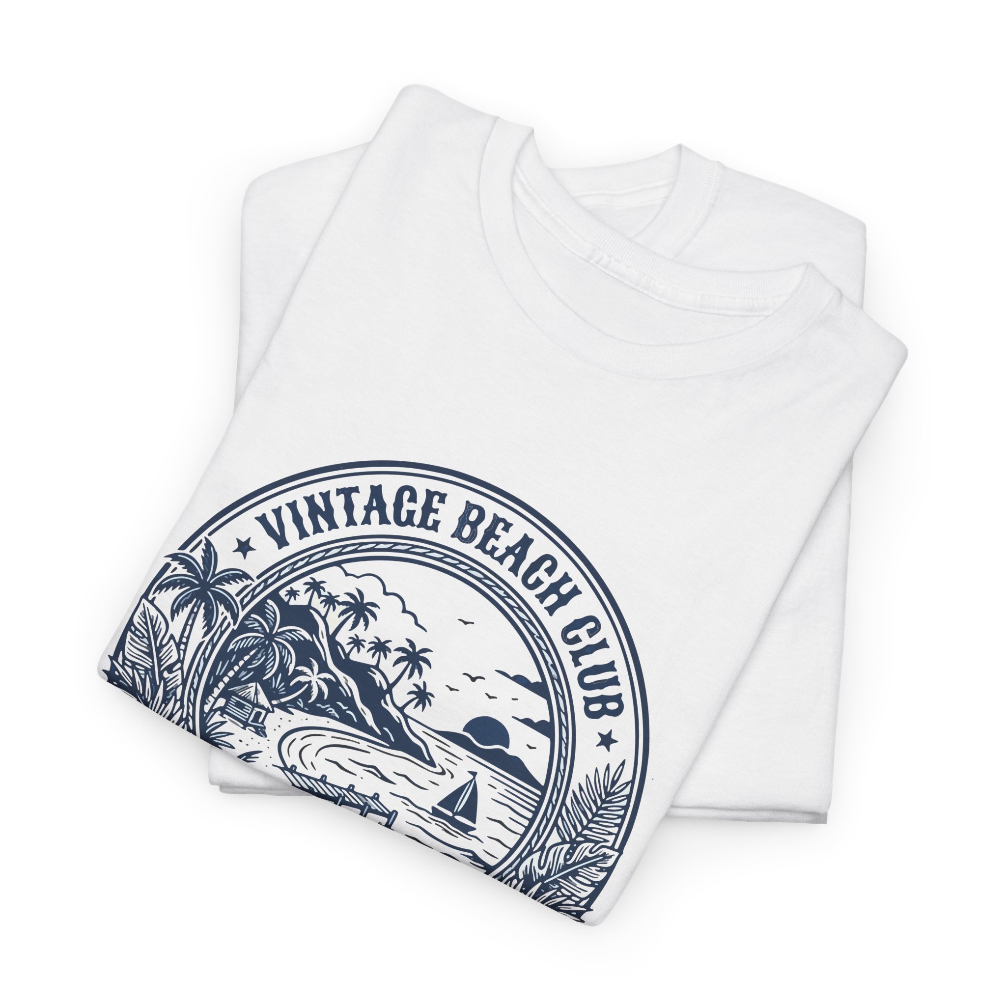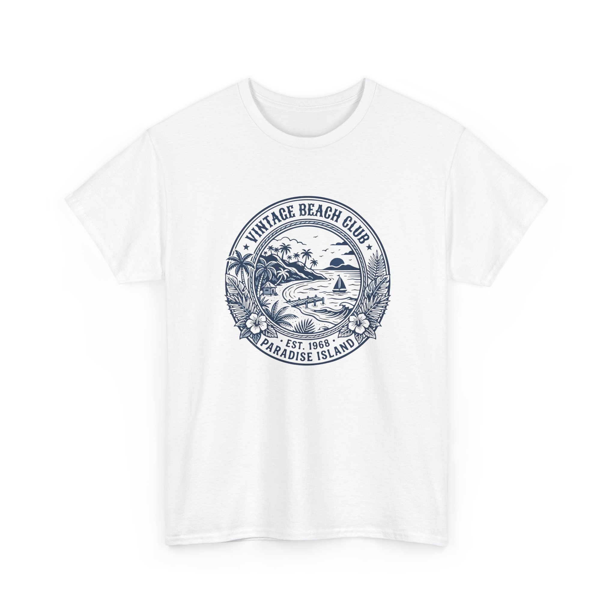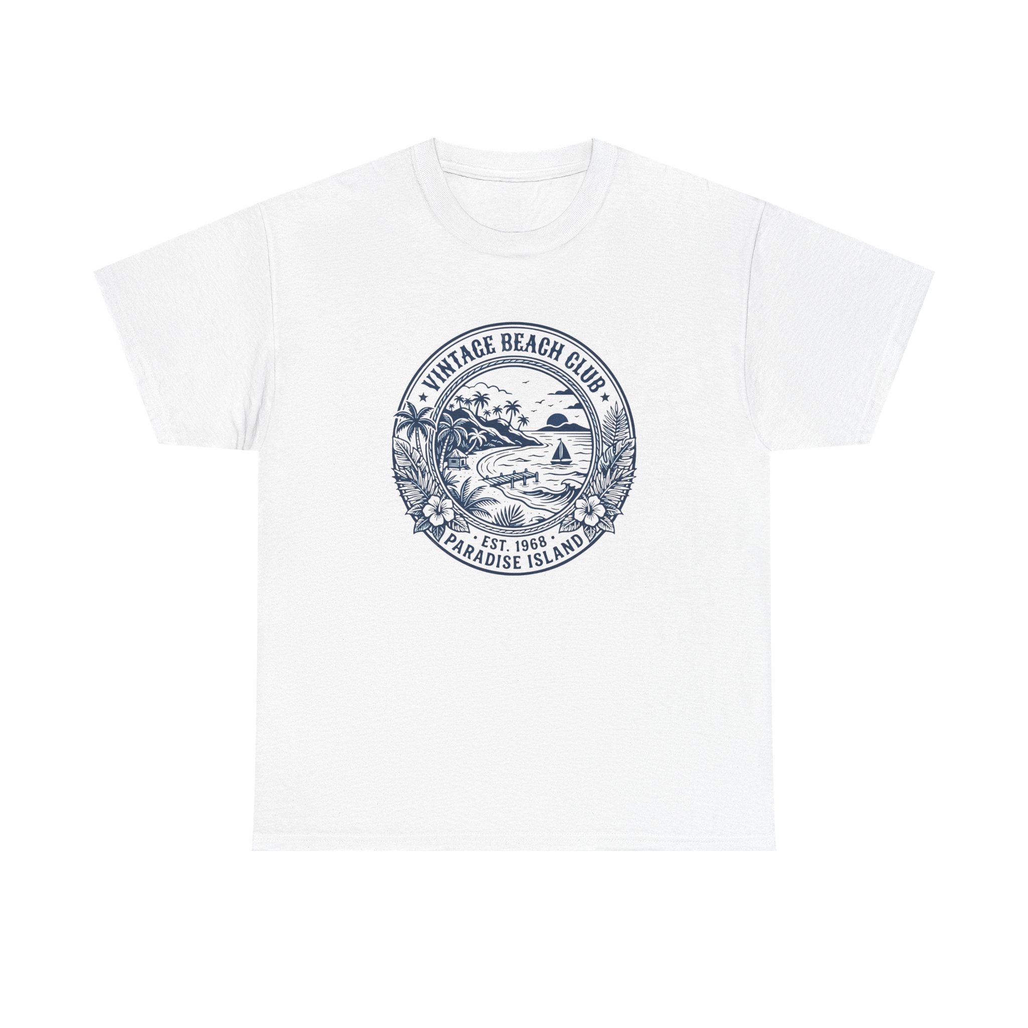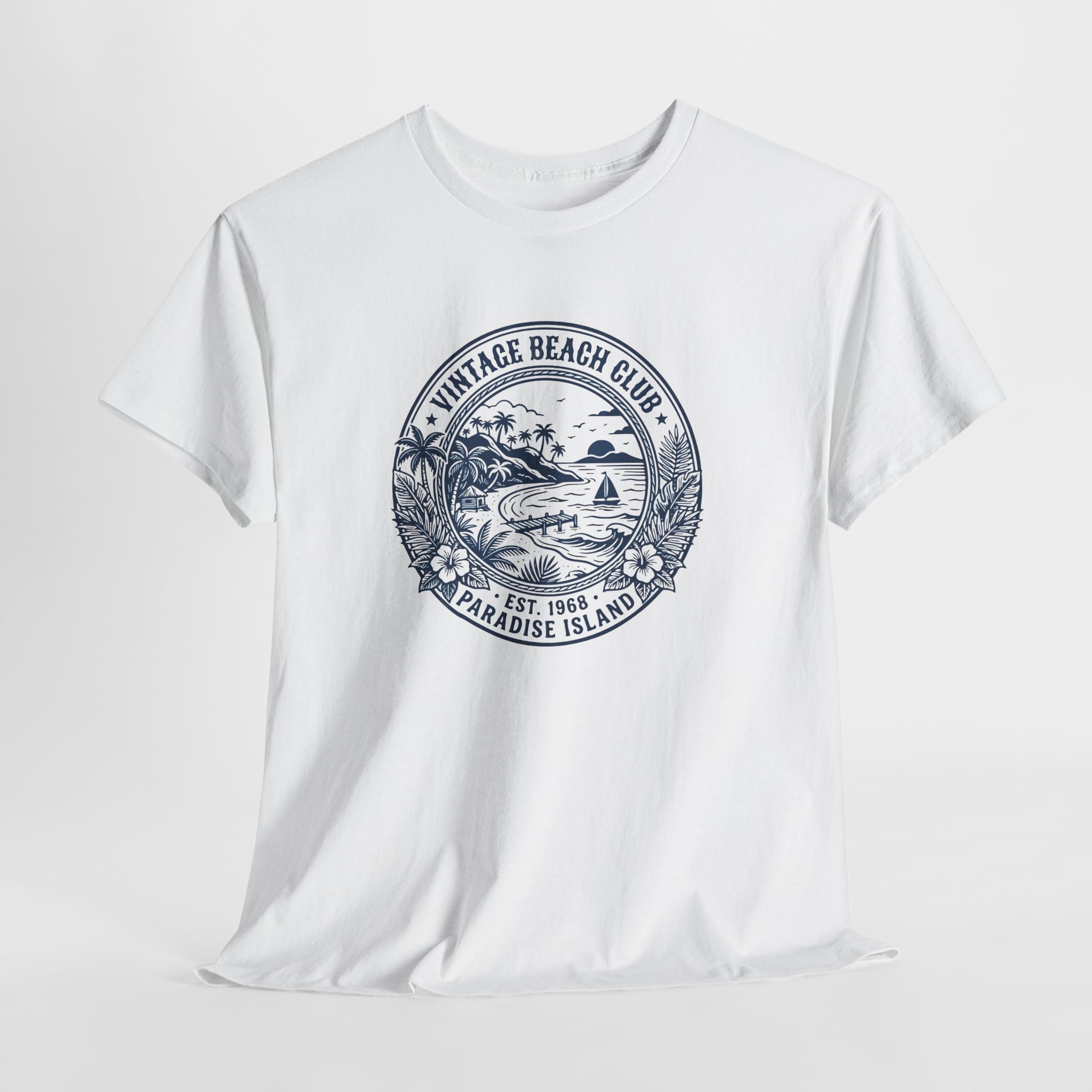 Salt-warmed air and the hush of early morning waves live in this vintage beach tee. A hand-drawn circular crest—palm silhouettes, a curved shoreline, and a tiny surf shack—sits softly on the chest in faded ink, like an old souvenir found in a coastal trunk. The shirt hangs relaxed across the shoulders and breathes with you on sunny walks, market runs, and slow evenings on a porch. It reads like a quiet invitation to slow down, chase light, and collect small seaside moments.