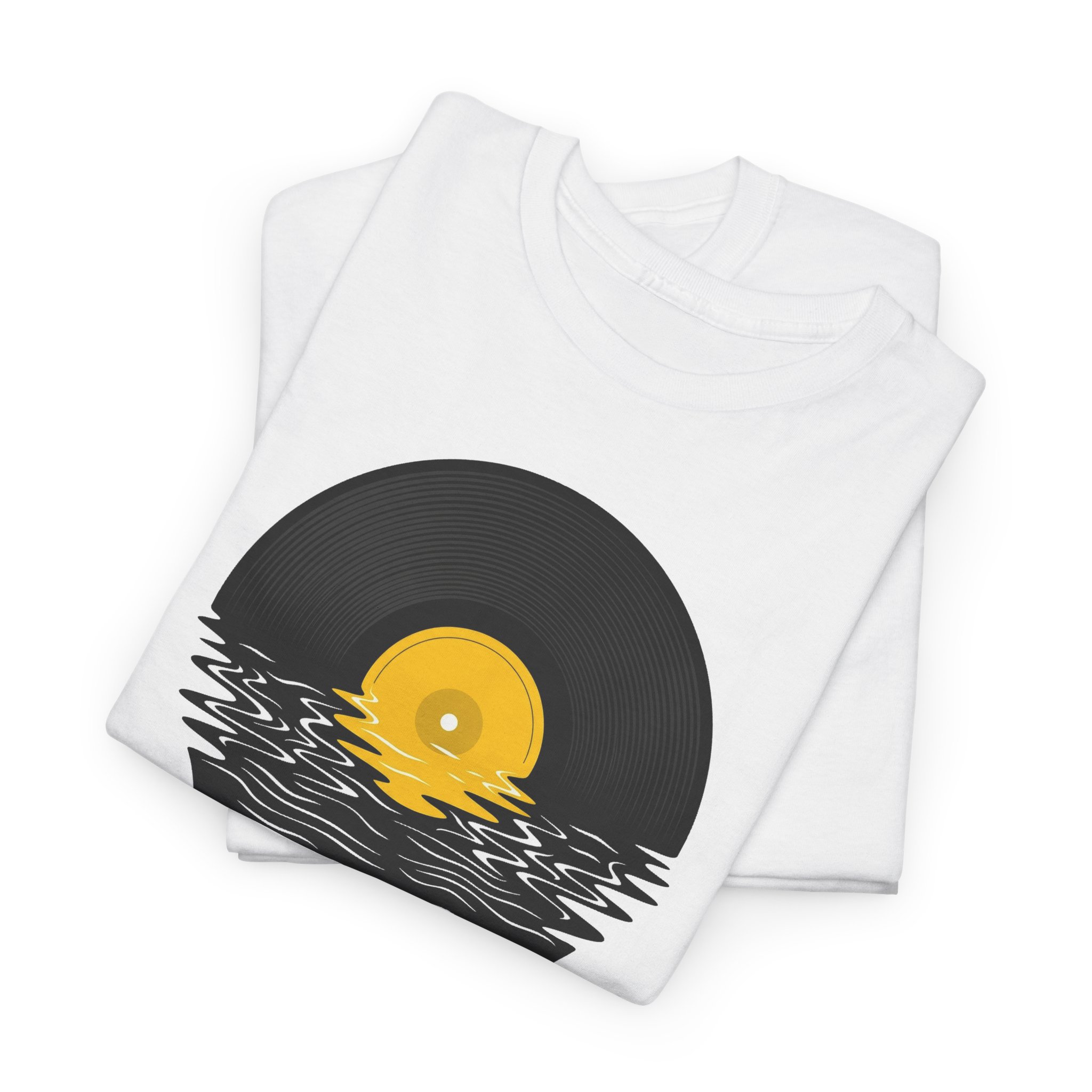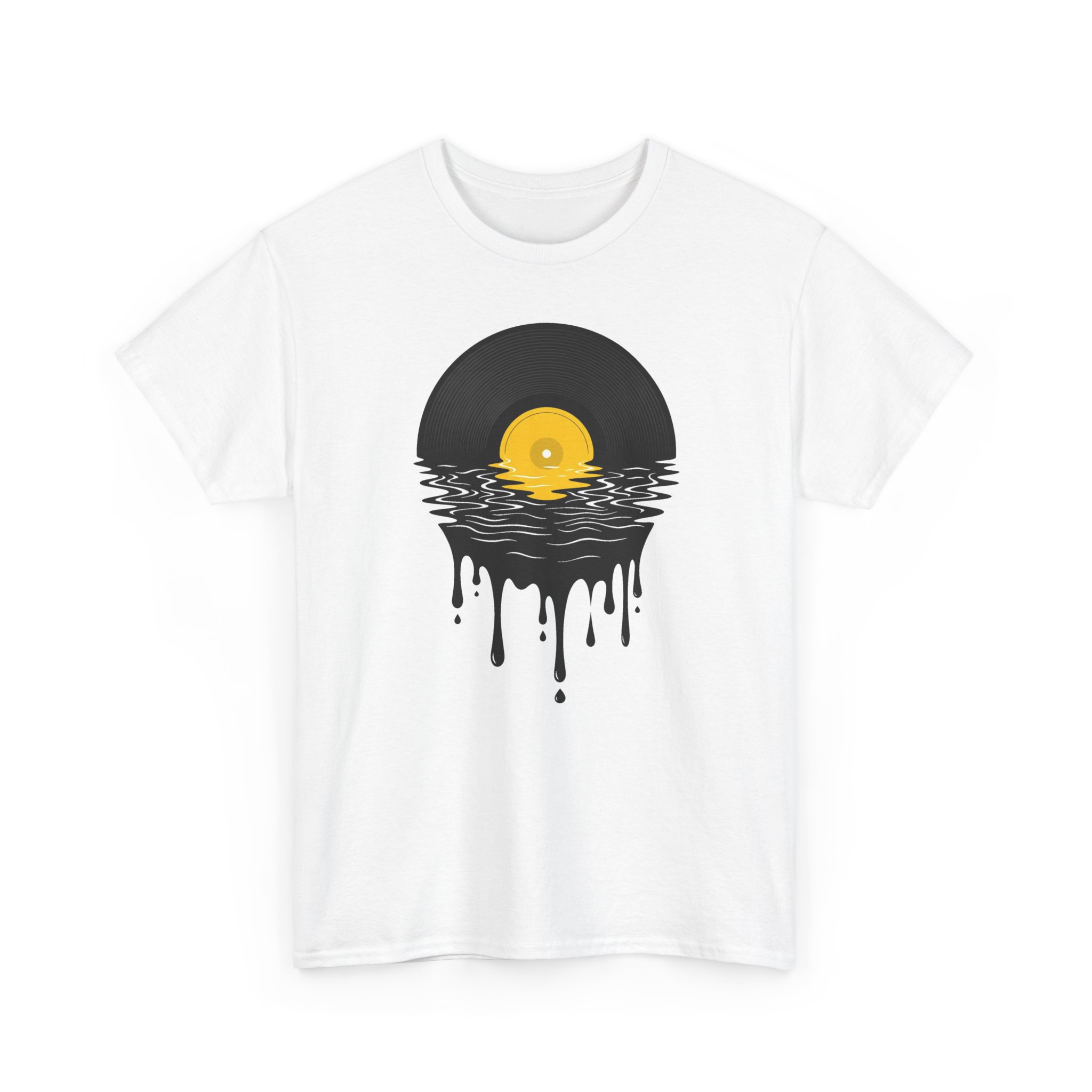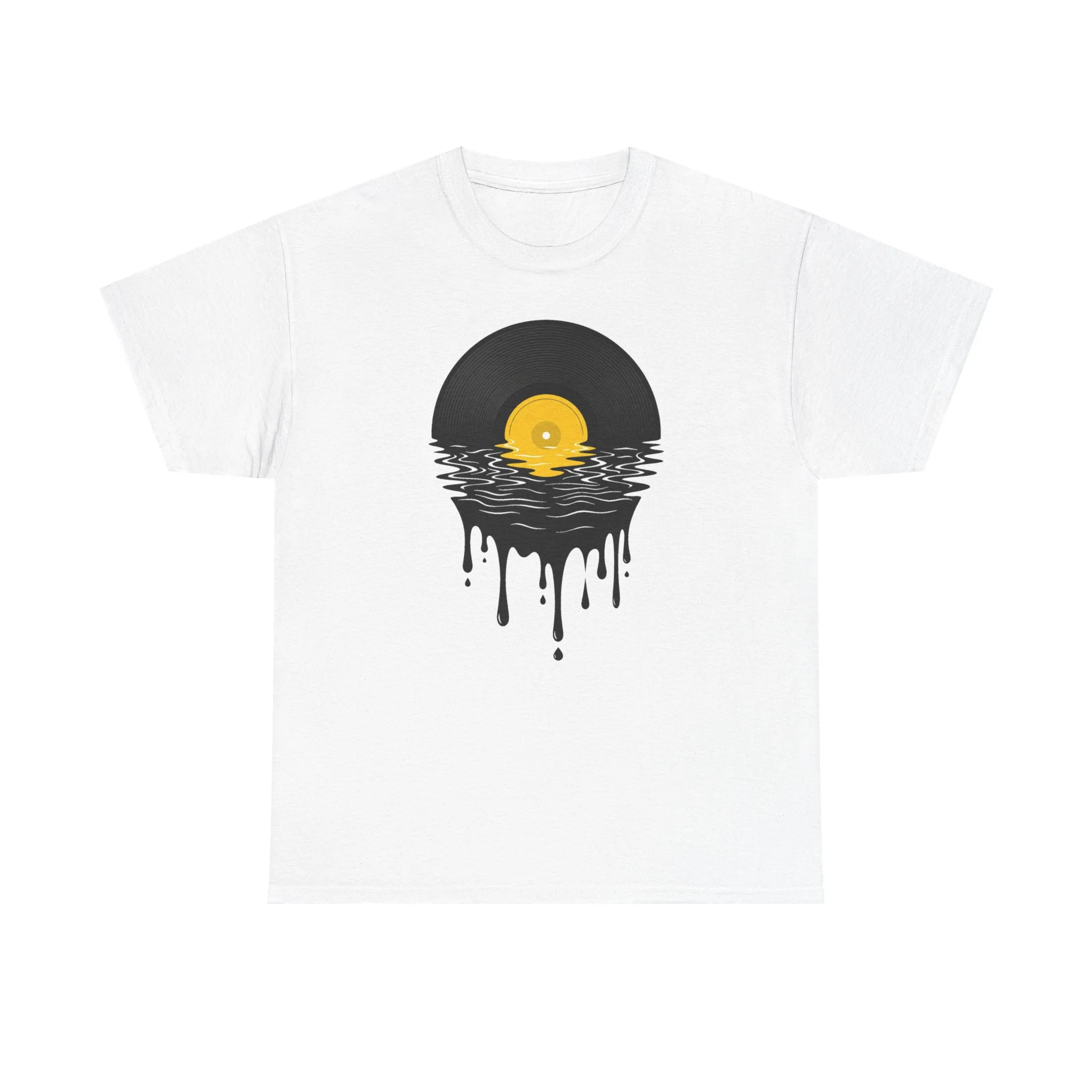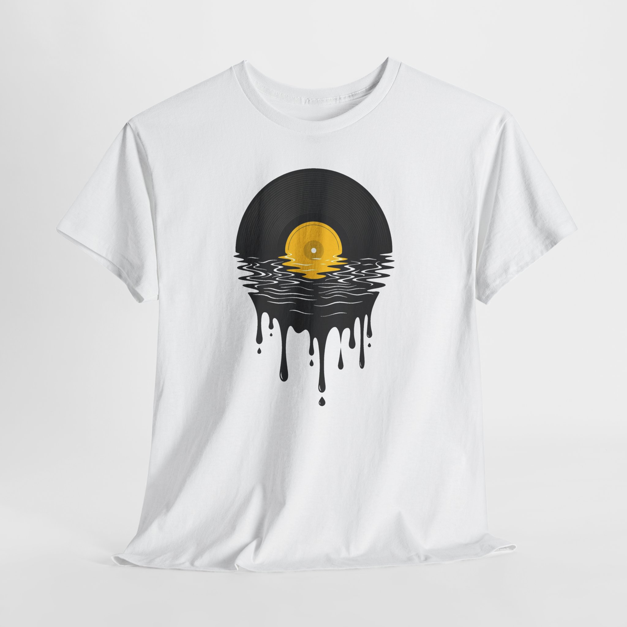 This cotton tee carries a quiet, artful vibe — a vinyl record melting into liquid light at the center of the chest. It’s for people who live in songs: crate diggers, late-night listeners, and anyone who treasures the warm crackle of analog music. The mellow yellow “label” in the design catches the eye while the dripping black silhouette keeps the mood moody and modern. Wear it layered under a denim jacket at a record-store browse or alone on slow Sunday mornings with coffee and a spinning platter. The classic crew neck and relaxed cut make it feel lived-in from the first wear, and the durable, print-ready fabric holds the design crisp through washes so the art stays sharp as your favorite track.
