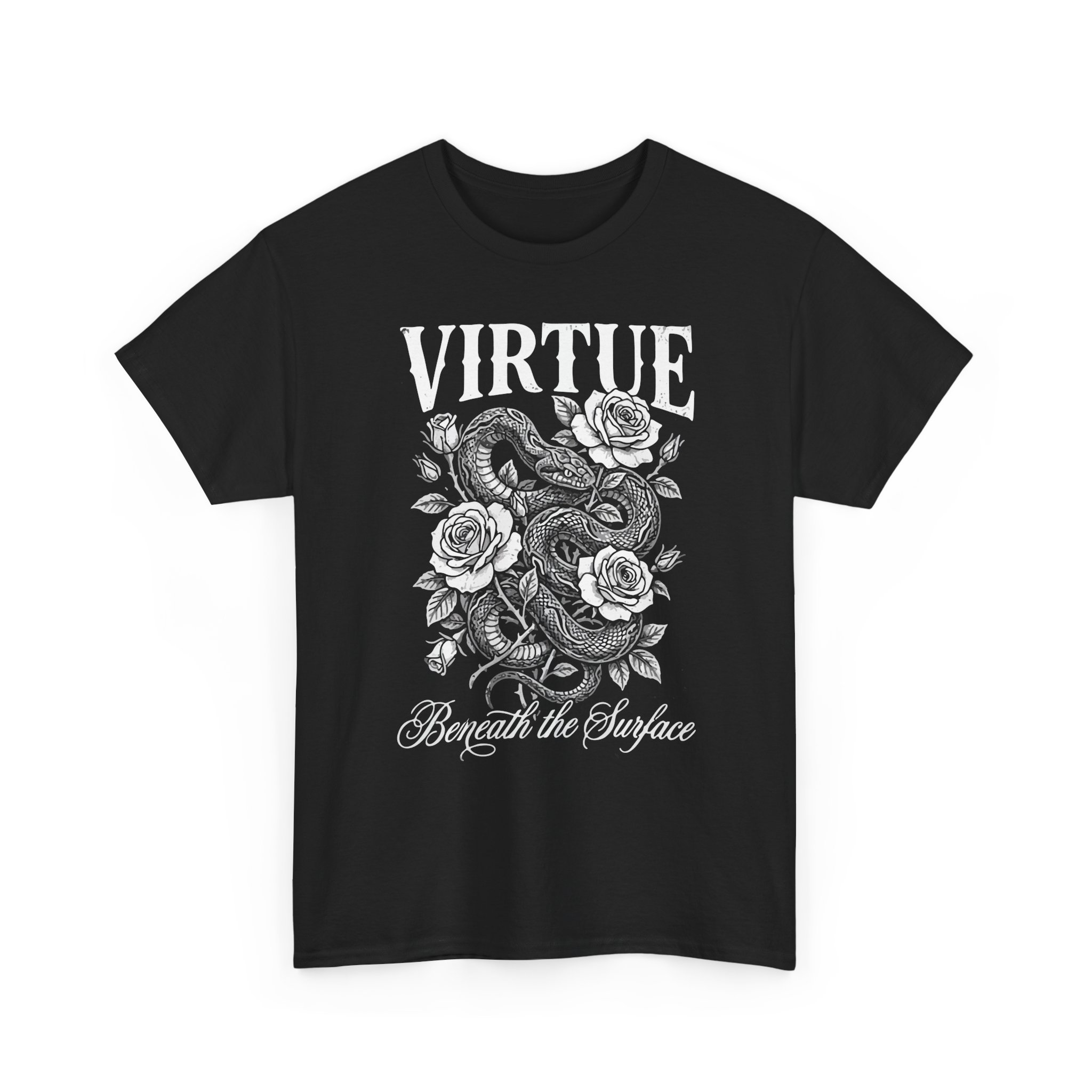 A bold, vintage-inspired tee that balances grit and grace. This classic crew-neck shirt features a monochrome design: a coiled snake entwined with blooming roses beneath the word “VIRTUE” and the script line “Beneath the Surface.” It feels like a page torn from an old tattoo flash sheet—worn-in, honest, and quietly defiant. Wear it layered under a denim jacket for late-night shows, or alone on warm evenings when you want your outfit to say more than words. The design invites second looks and starts conversations, fitting naturally into the life of someone who appreciates music, ink, and stories that run deeper than appearances.