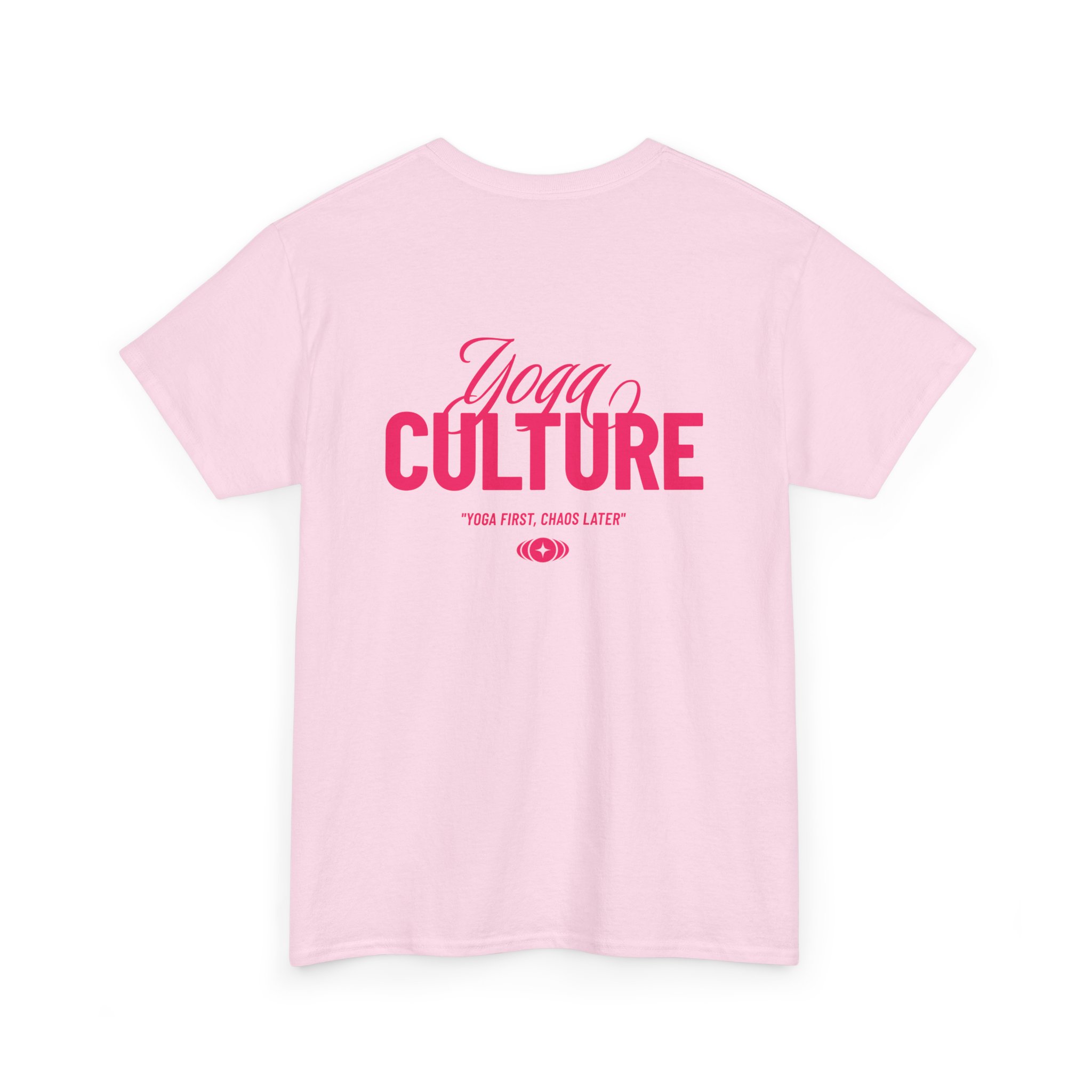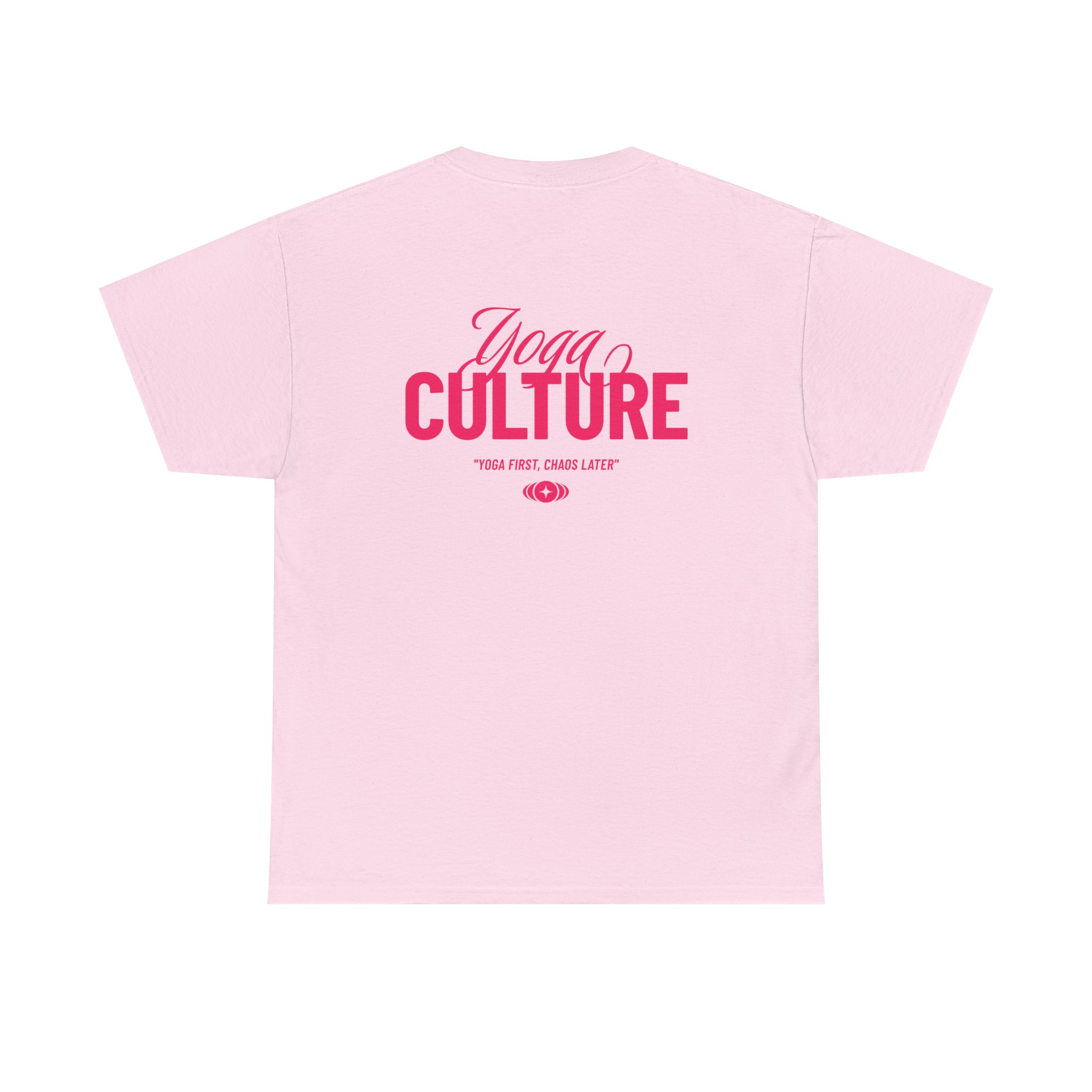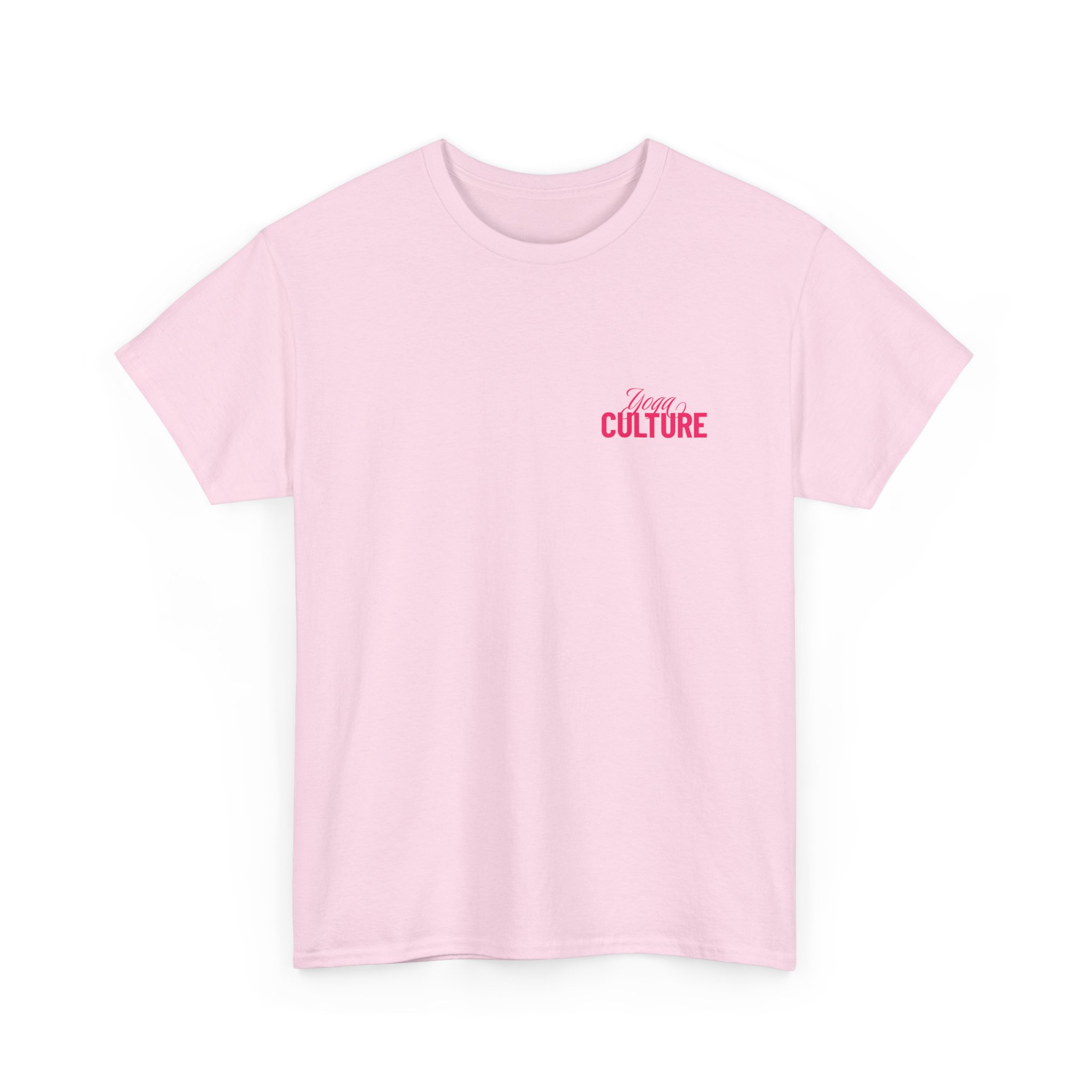 Soft, breathable, and made to move with you — this classic crew tee brings a quiet confidence to yoga class, studio hangs, and slow Sundays. The pale pink canvas and warm rose graphics read like a gentle nod to community and practice: subtle chest lettering up front, bolder typography across the back that catches the eye without shouting. The medium-weight cotton feels substantial yet flexible, so it sits well during sun salutations and keeps its shape after repeated washes. Wear it to class, to a post-practice coffee, or when you want a comfortable layer that reflects a love of movement and mindful culture.
